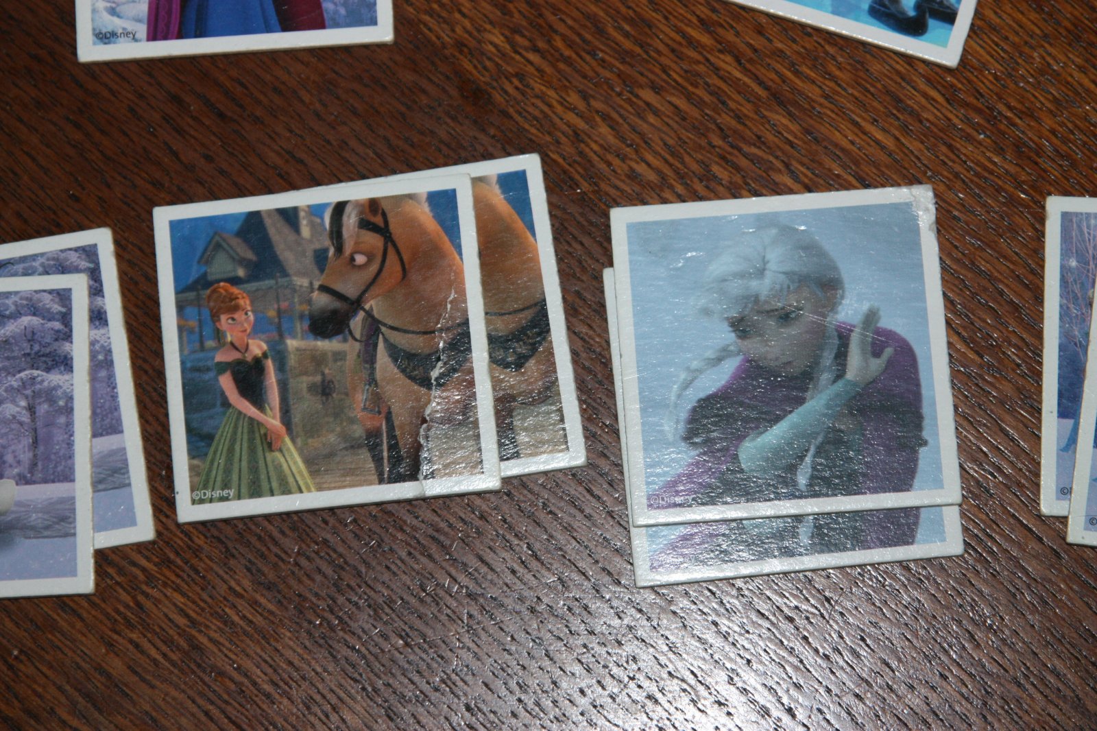Hrane, karticky trosku opotrebovane. Z povodnych 36 parov 3 karticky chybaju, v dvoch paroch je vzdy jedna karticka trochu poskodena ( jedna ohnuta a druha ma poskodeny roh - vid posledna foto). Inak je tam 31 parov s ktorymi sa da bez problemov hrat.