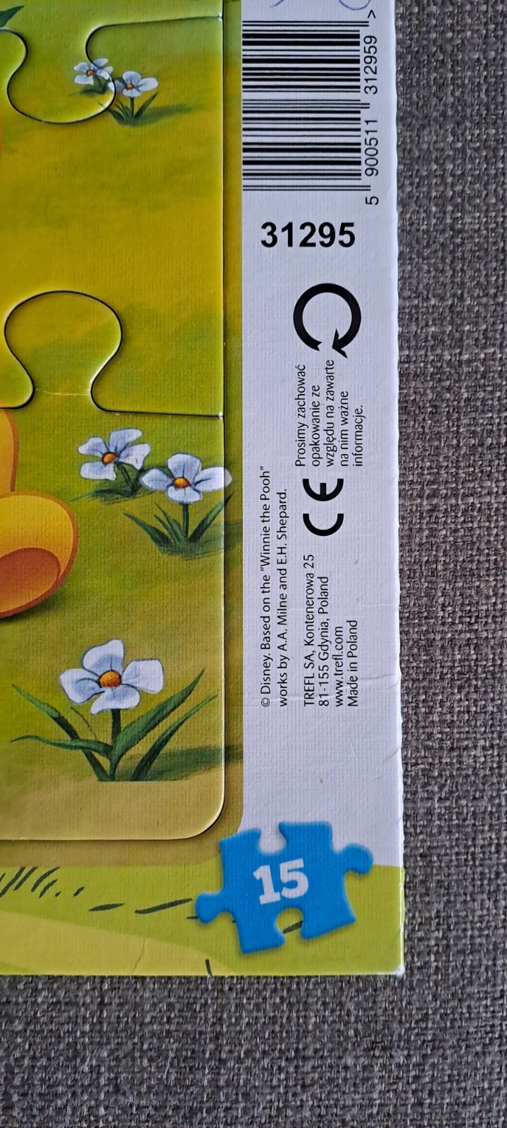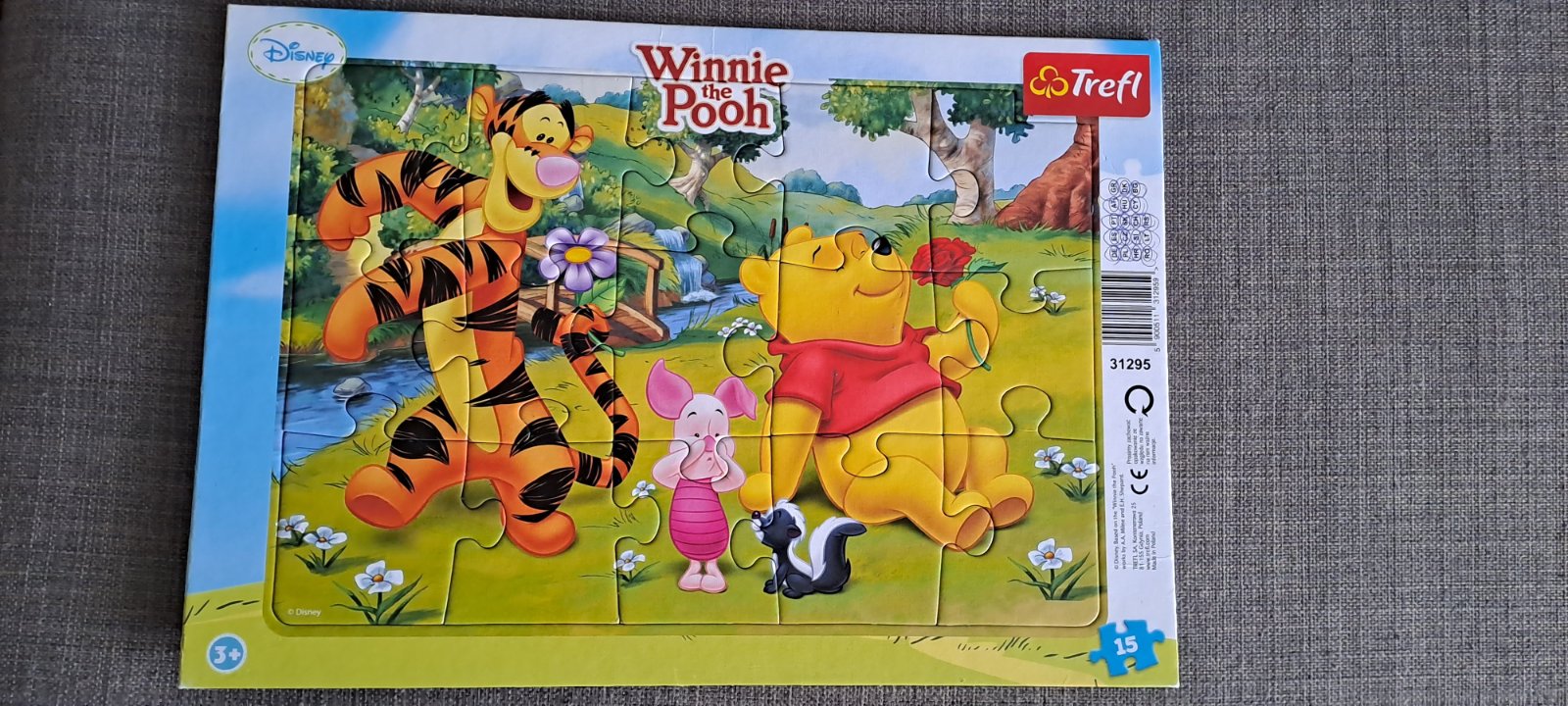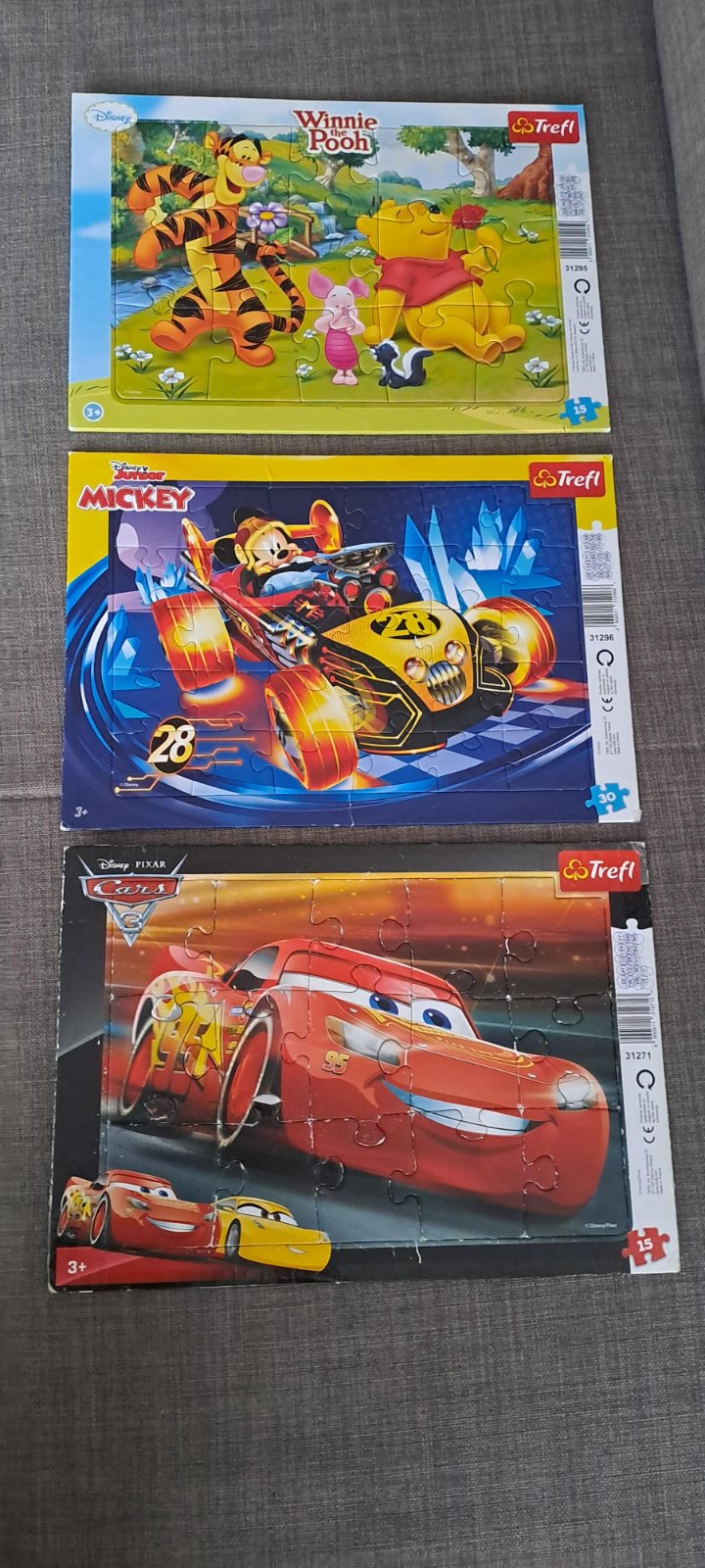 Ponúkam na predaj 3x puzzle TREFL, s motívom The Cars (McQueen), Winnie The Pooh (Macko Pu) a Mickey Mouse Racing. Set je vhodný na učenie skladania puzzle, pre vekovú kategóriu cca 3+ (obsahuje 15 a 30 dielikov). V dobrom hranom stave, McQueen mierne ošúchaný, ale myslím, že na učenie skladania puzzle ako stvorené. :) Cena 2€/3 ks.
