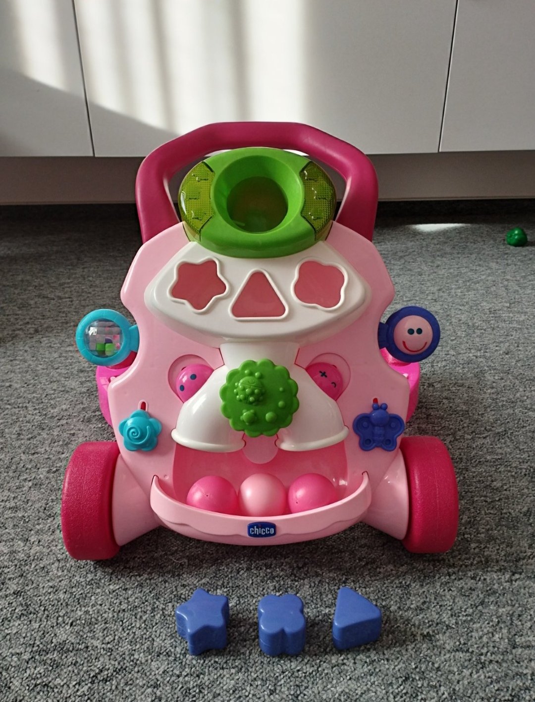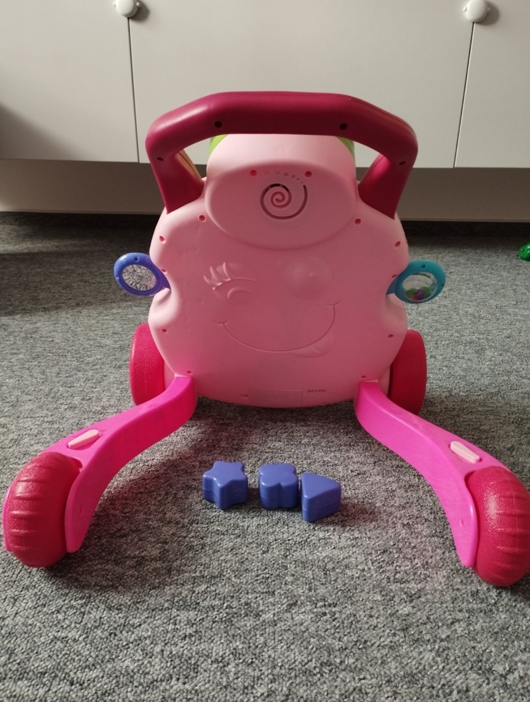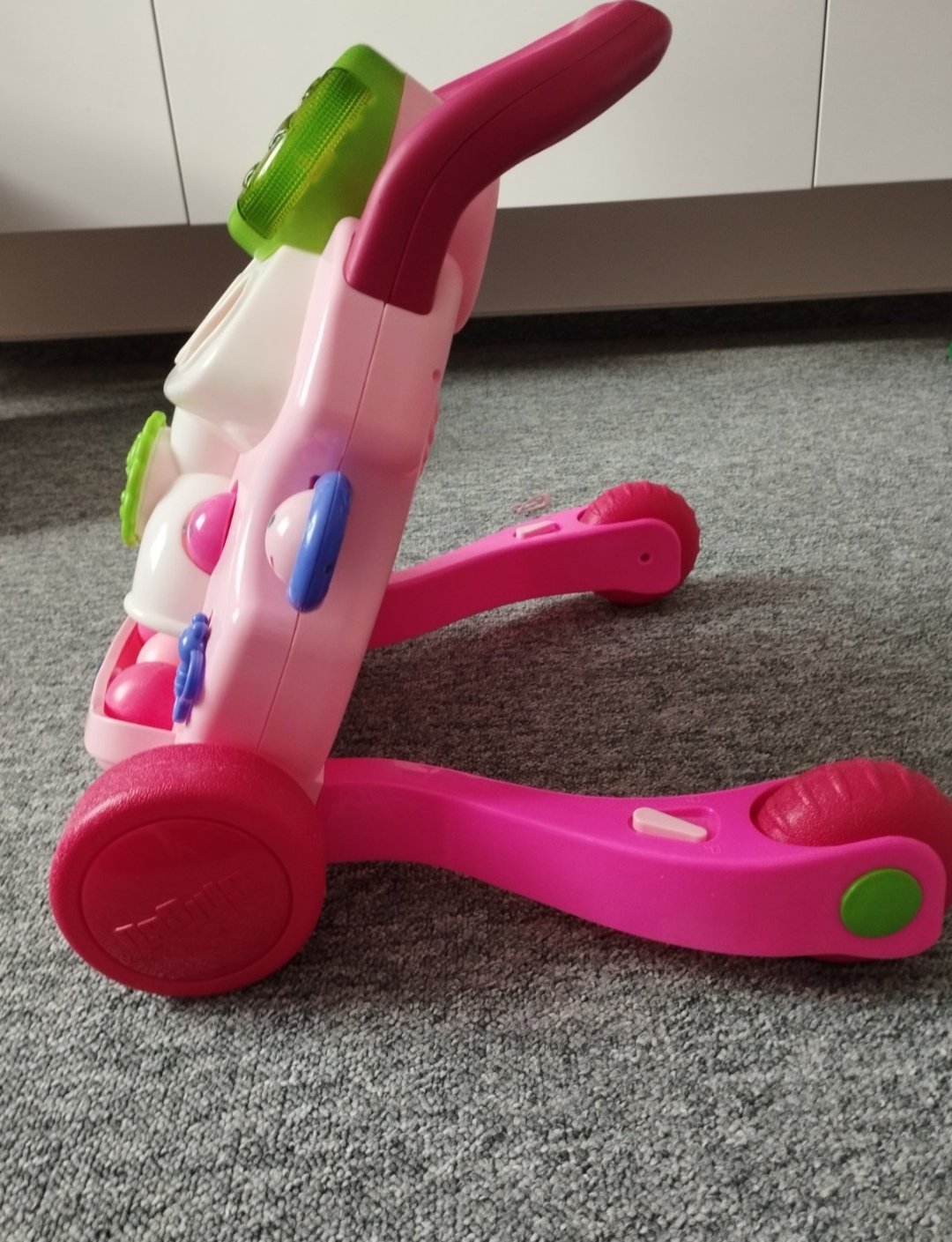 Chodítko na tlačenie so svetelnými a zvukovými efektami, vkladacími kockami a rôznymi didaktickými hračkami. Používané iba doma. Vo veľmi dobrom stave. Má ramená s kolieskami široko od seba, preto je veľmi stabilné.