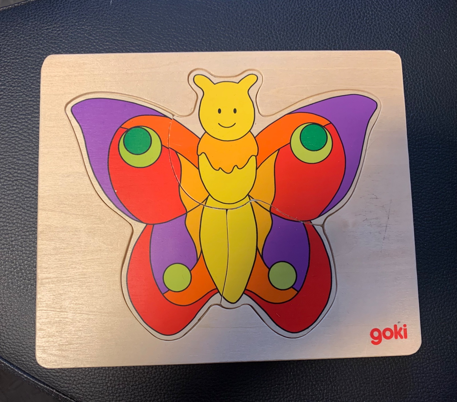 Nadherne drevene puzzle. Pod velkym motylom je mensi, pod nim este mensi a pod nim najmensi. Vsetky su inej farby. U nas velmi hrana hracka, ale stale krasne vyzera :)