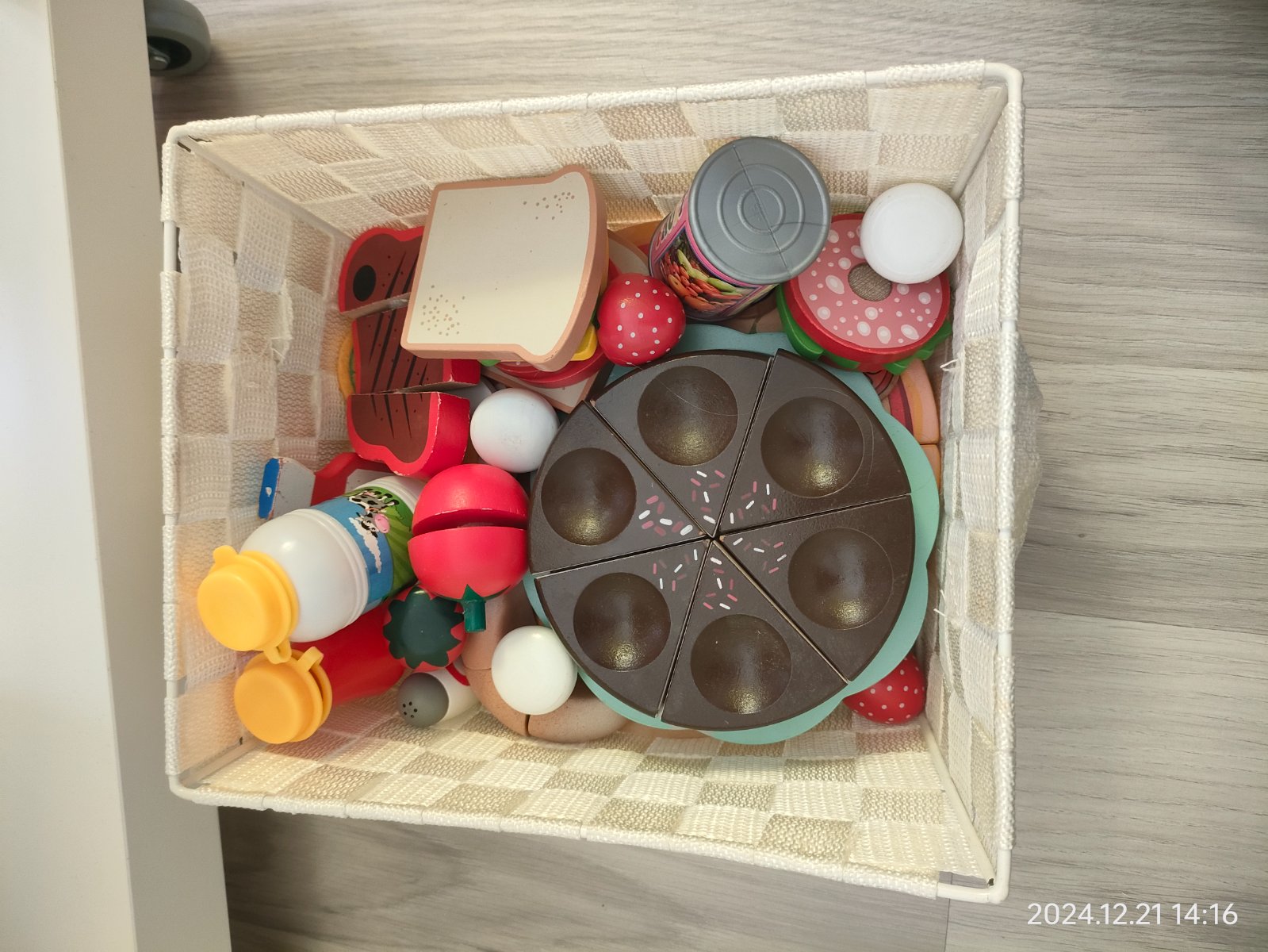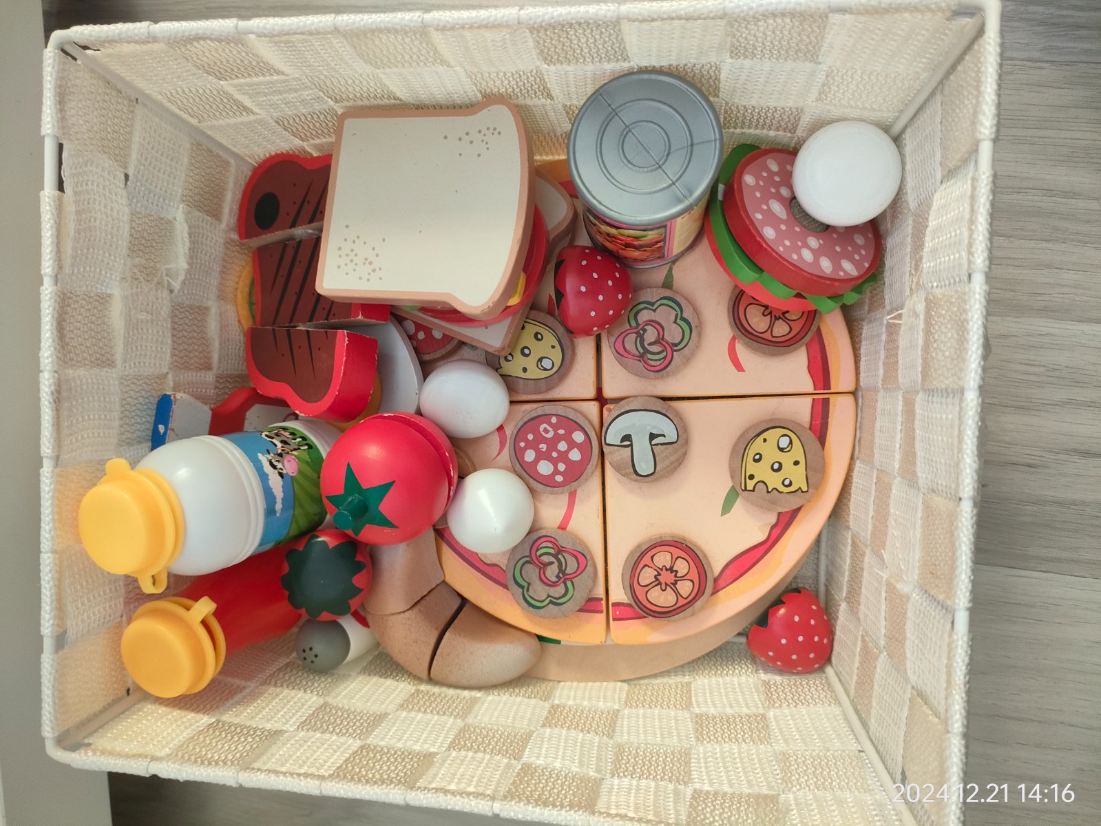 hrací drevený set iba na objednávku obsahuje potraviny 4 plátky paradajok, 4 uhorkové plátky, 4 cibulové krúžky, 3 kúsky z papriky, 3 šalátové lístky , in felt 1 plastová miska, 1 fľaška octu, 1 f...