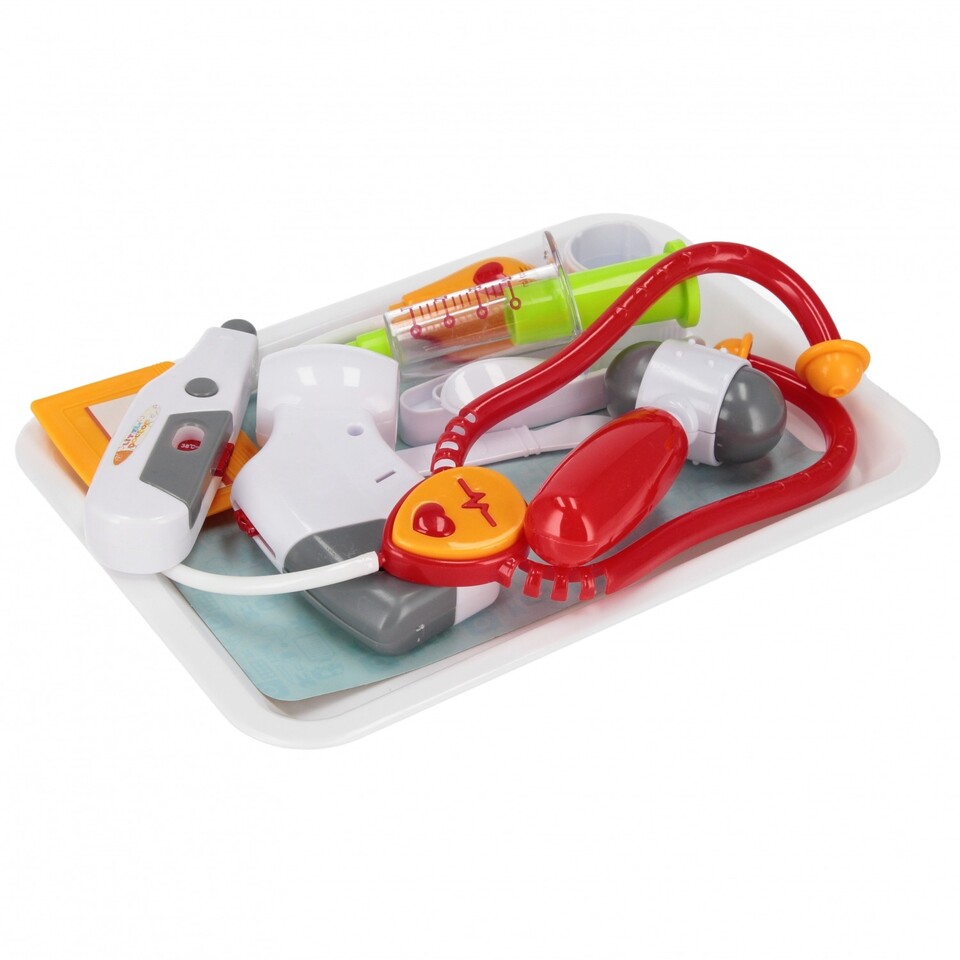 Sada obsahuje: tácku, stetoskop, striekačka, pinzeta, náplasť, nôž, lyžička, kladivo, pulzný oxymeter, teplomer