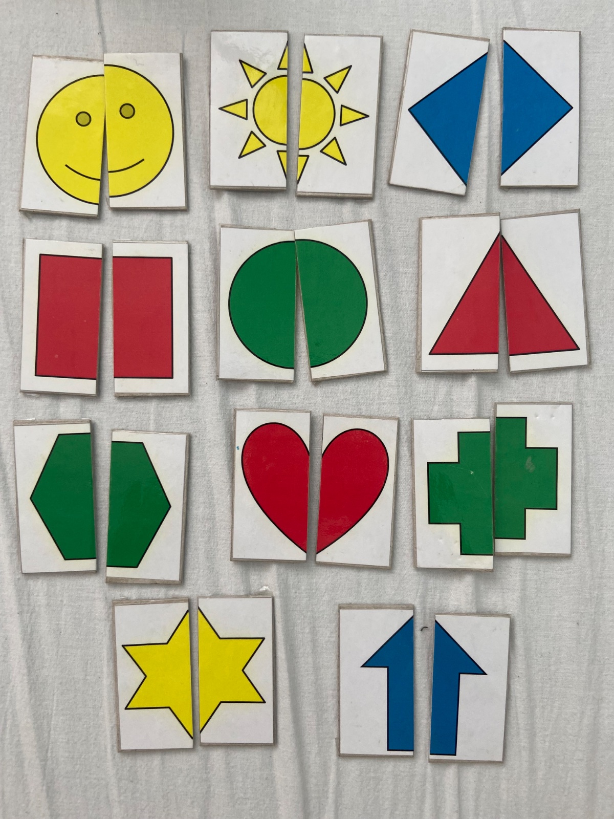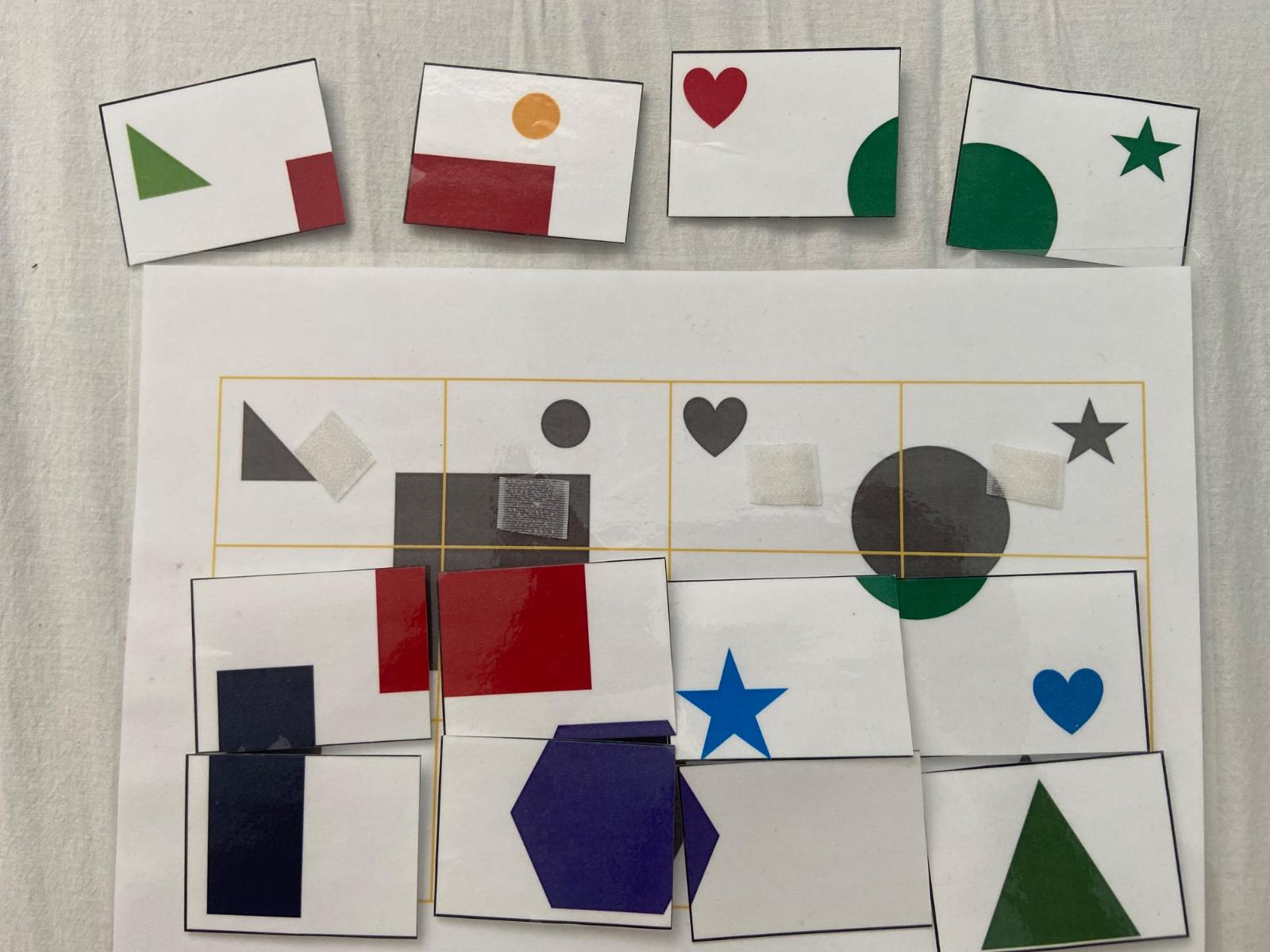 5. Puzzle s roznymi tvarmi - na podlozku kde je ciernobiely obrazok treba spravne ulozit vsetky casti, karticky na suchy zisp