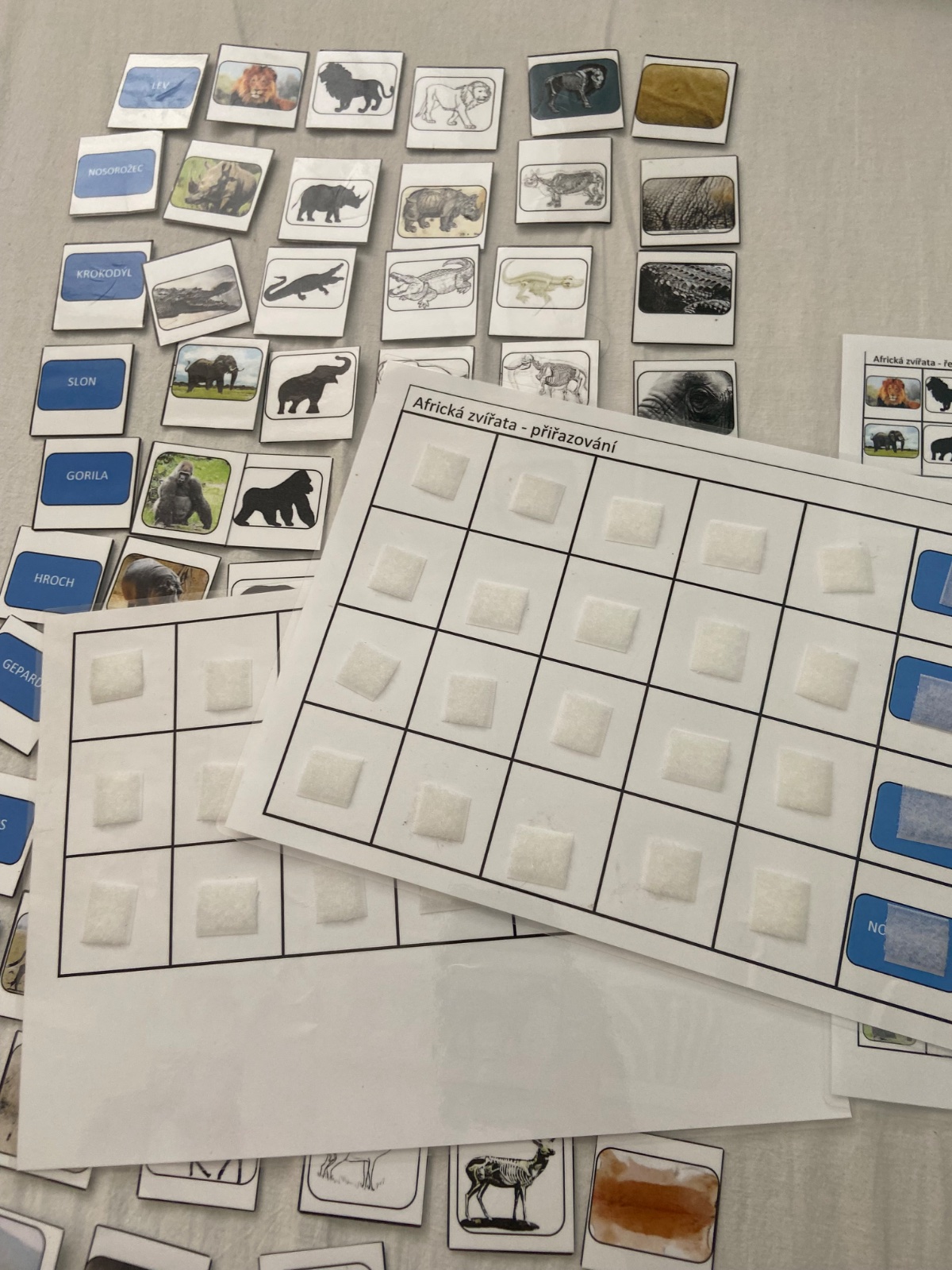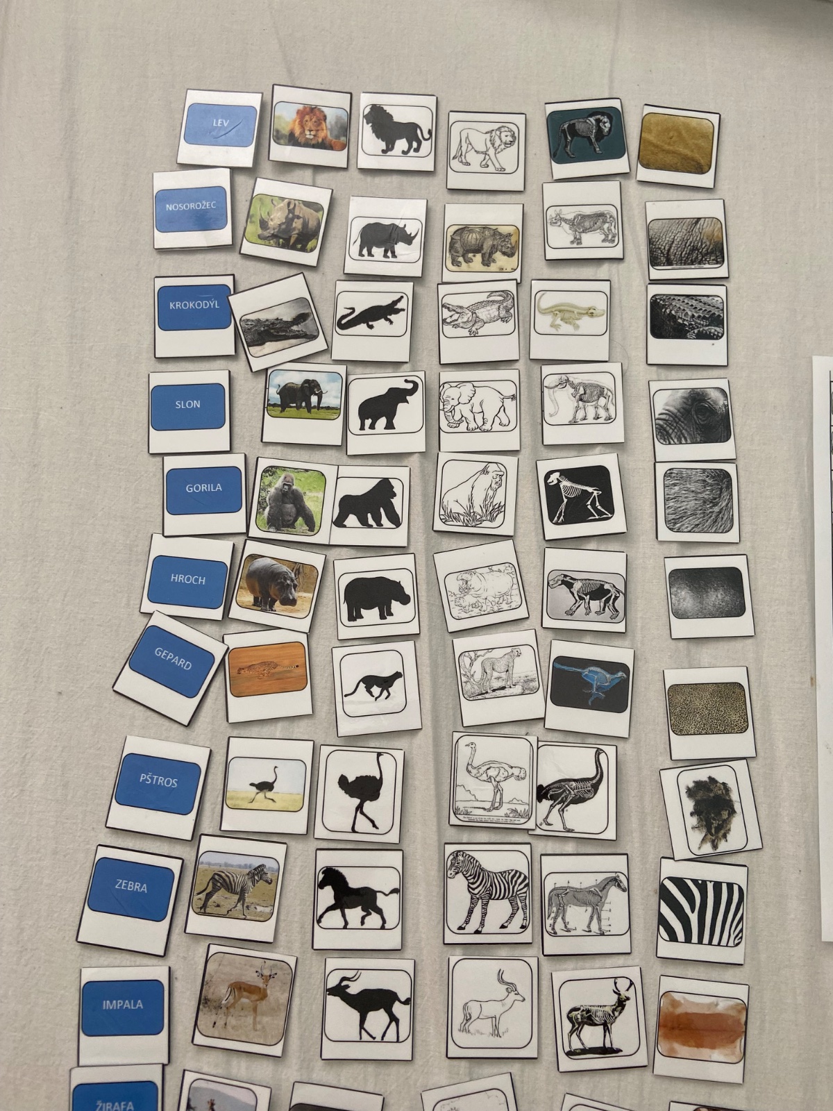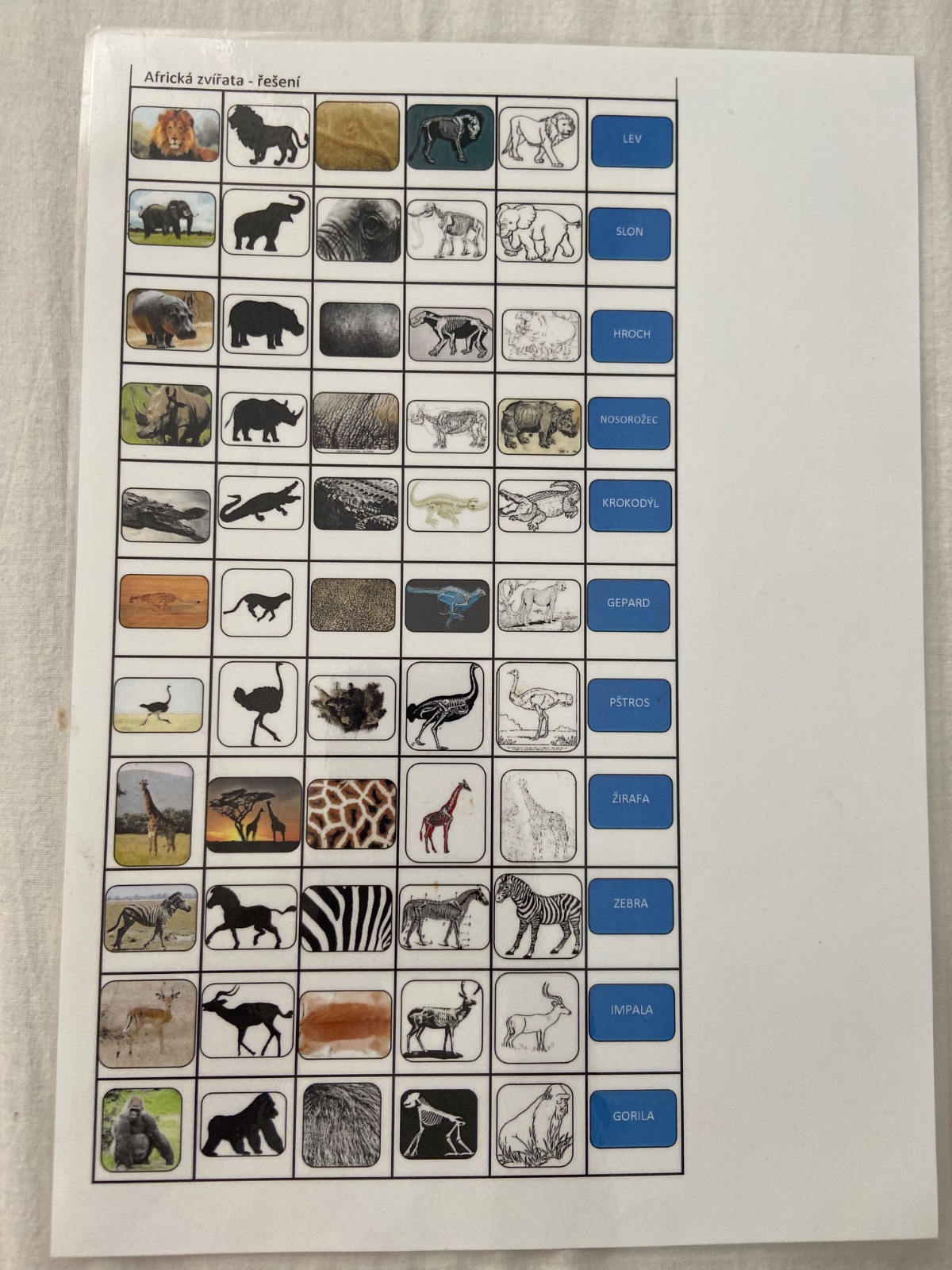 1. Africke zvierata - dokopy 11 zvierat, karticky su na suchy zips, treba k nazvu priradit zviera, jeho tien, kostru, srst/kozu a ciernobiely snimok