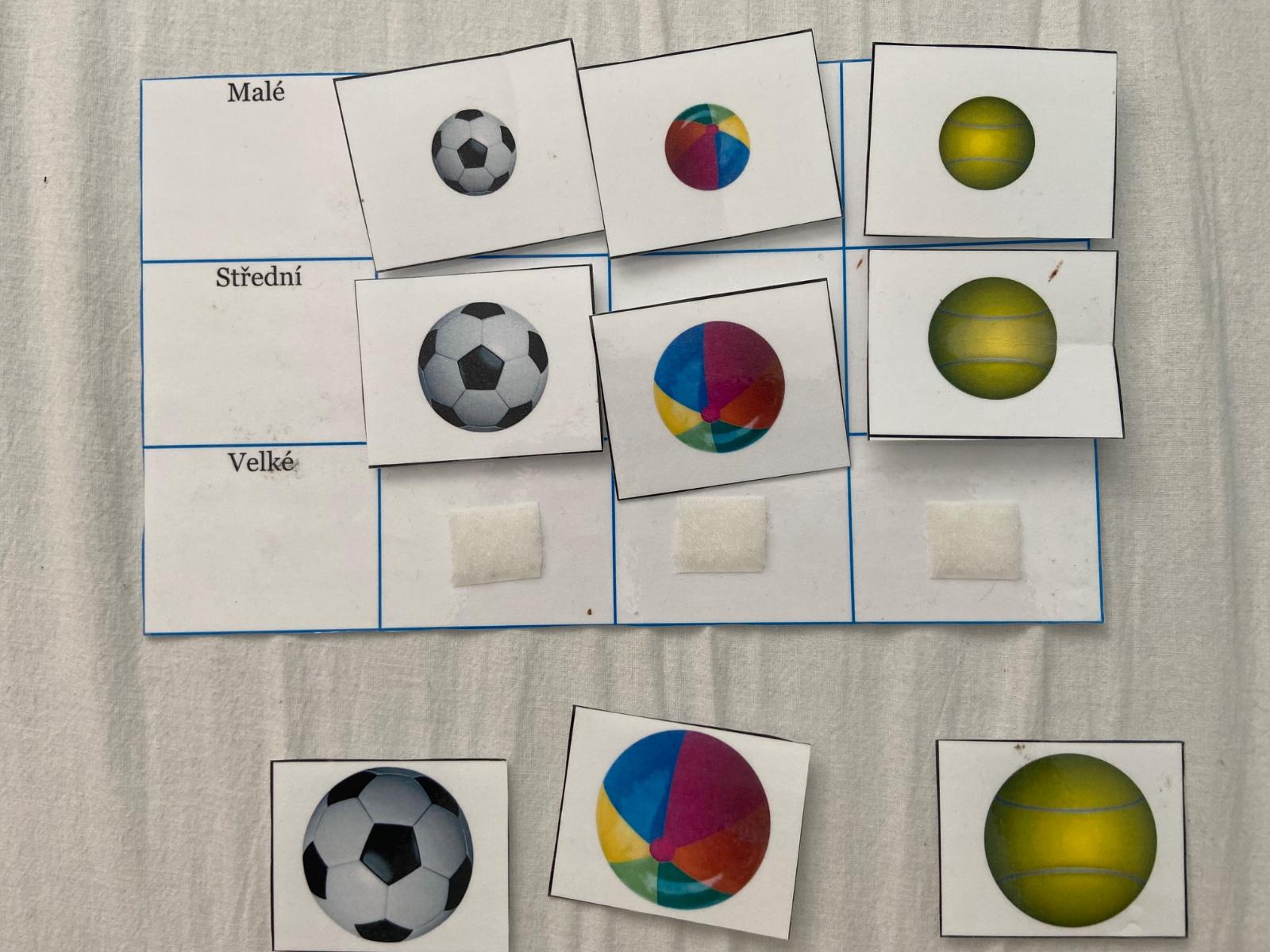 3. Lopty - kazdu treba spravne umiestnit na malu/strednu/velku, karticky na suchy zips