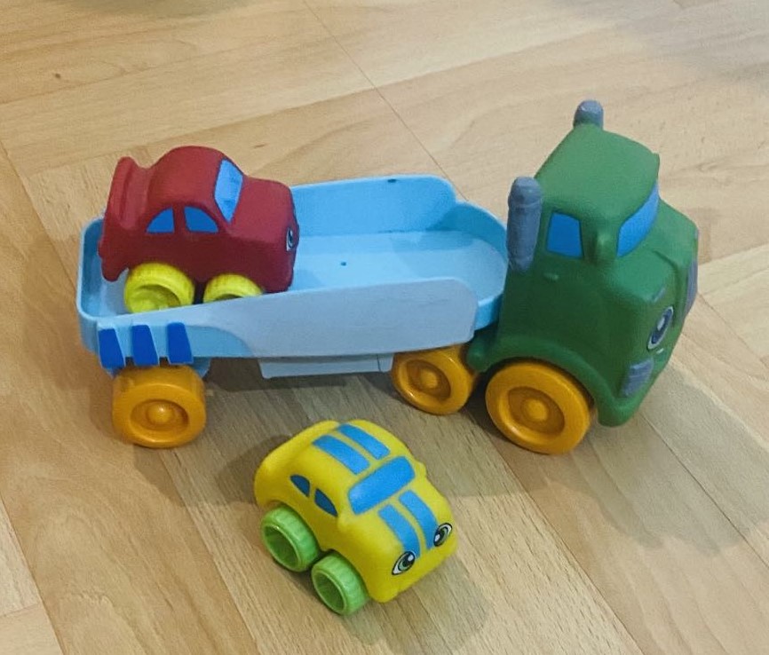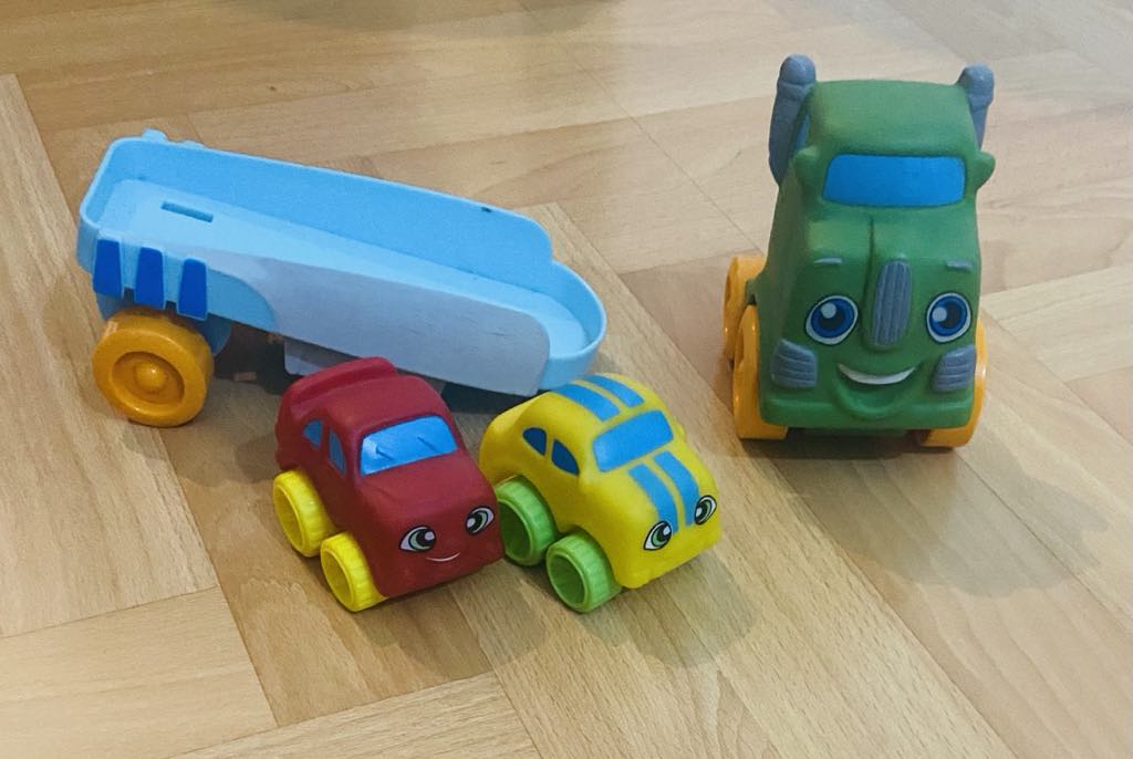 Kamión s návesom s autíčkami z tvrdého kvalitného plastu. Autíčka majú zaoblené tvary, takže sú vhodné pre najmenších. Autíčka sú ako nové.
