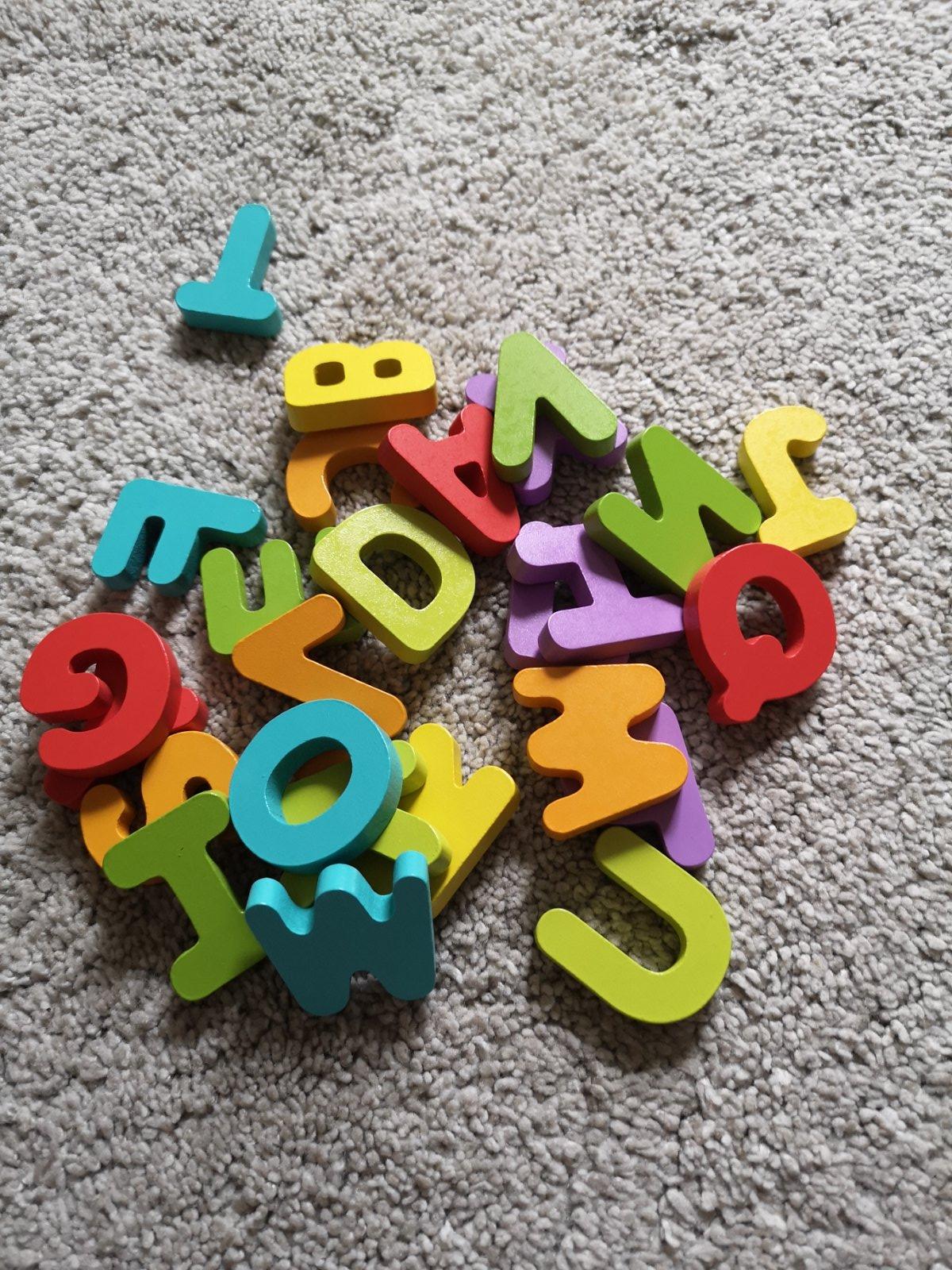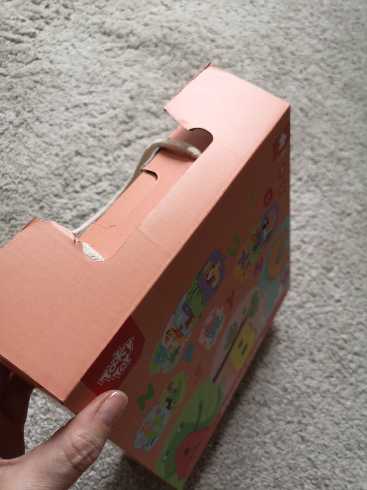 Puzzle značky Tooky toys. Málo používané. Stav ako nové. PUZZLE sú z hrubého kartónu a písmenká z dreva. Obrázky sú v angličtine. Jediná chyba je kúsok odtrhnutý z krabice viď. foto.