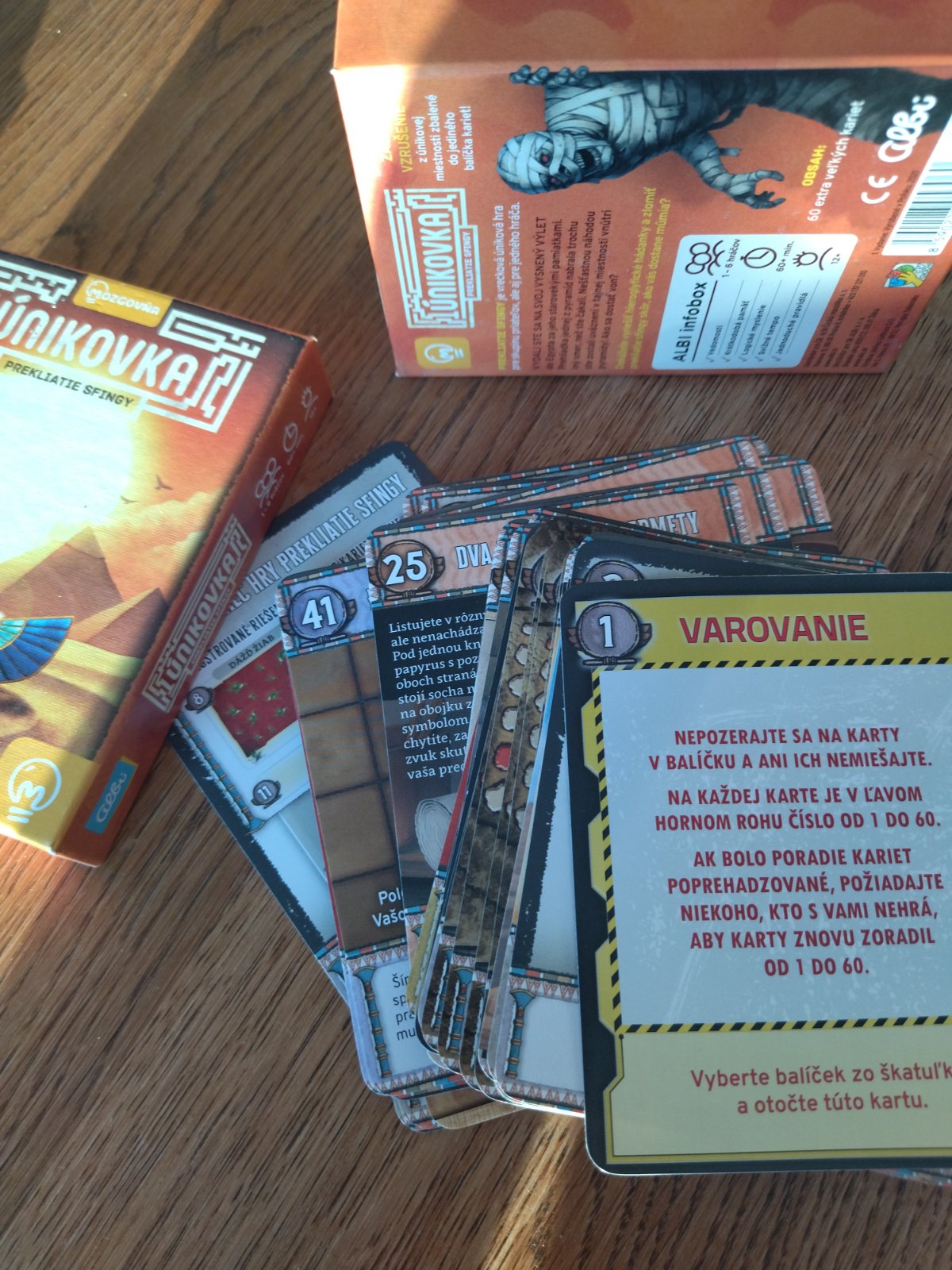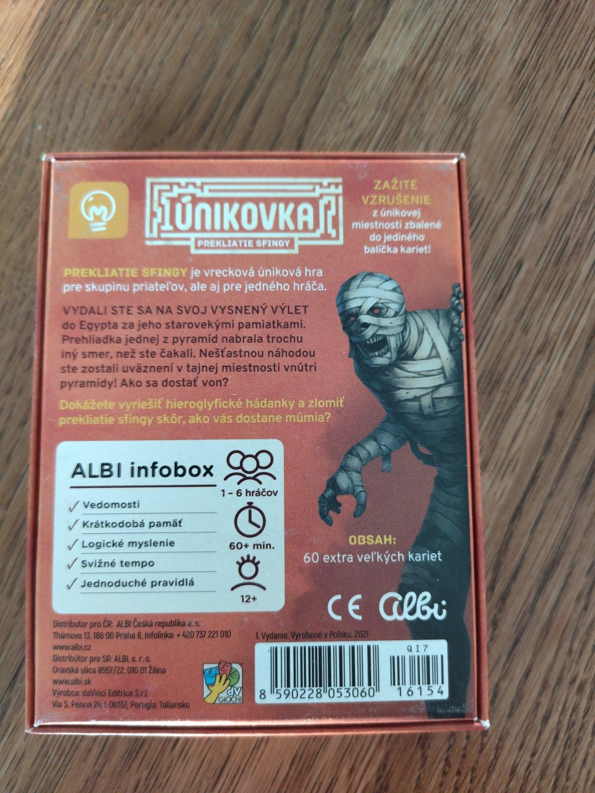 Predám 1x hranu únikovú hru Prekliatie sfingy. Vo výbornom stave bez poškodení. Nič nechýba, nič nebolo skladané ani strihané. Odporúčaný vek 12 rokov. Dĺžka hry ca. 60 minút. Pre 1-6 hráčov. Hra je v slovenskom jazyku. Obsahuje 60 veľkých kariet.