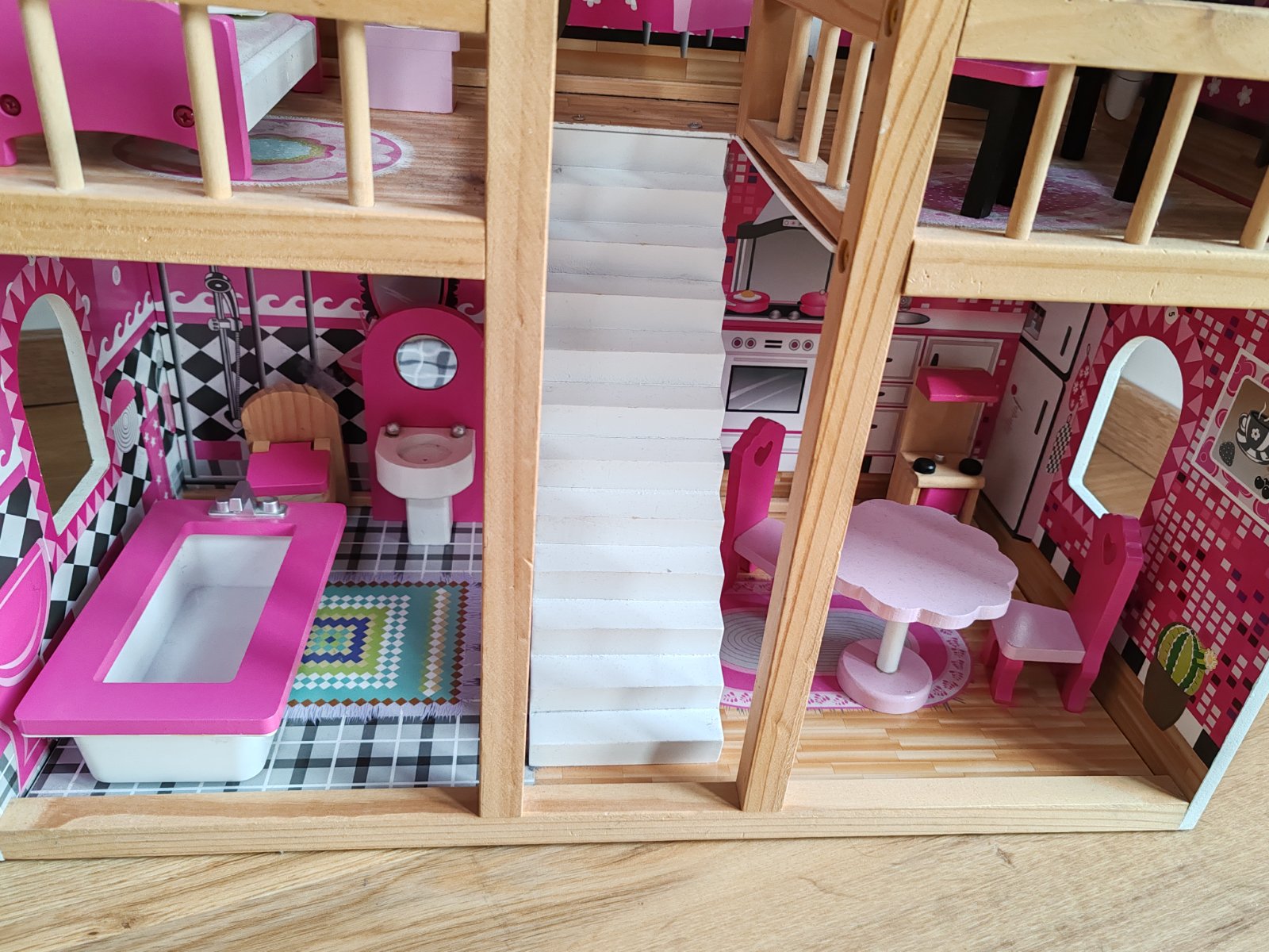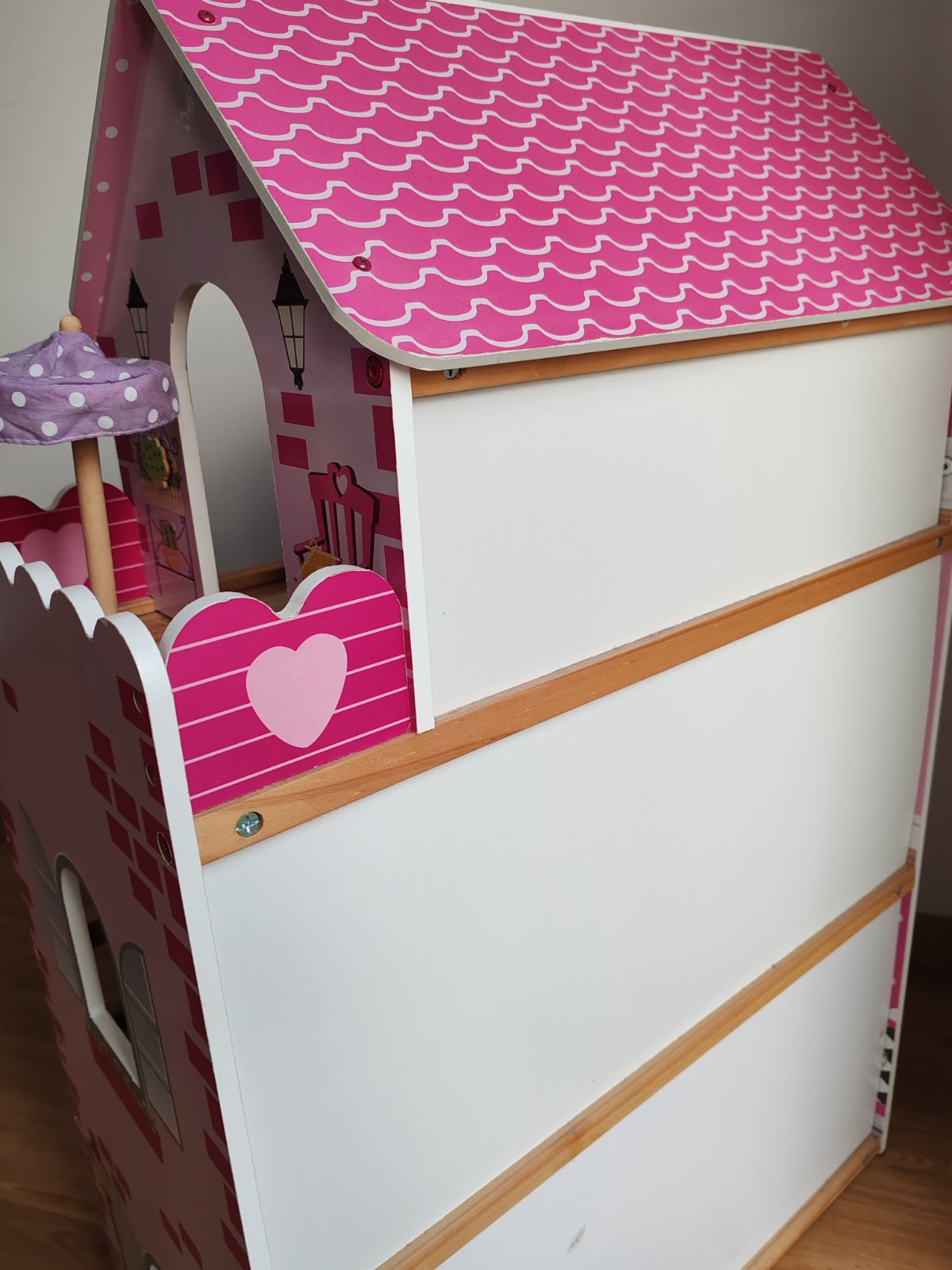 Krásny drevený domček s nábytkom a drevenými figúrkami....dĺžka 50cm +strieška a drevená podložka terasy , šírka 40 cm +balkonik, výška 56 cm.... Je v demonte ,,šrubovany... V pôvodnej krabici ... ...