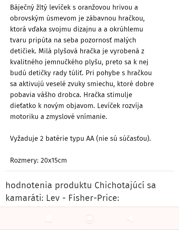 Značka Fisher price. Hrá upokojujúce melódie, bruško sa pohybuje hore dole, lampa svieti, hračka dýcha, bije mu srdiečko. Toto všetko sa dá zvlášť vypínať podľa potreby. Super pomôcka na zaspávani...
