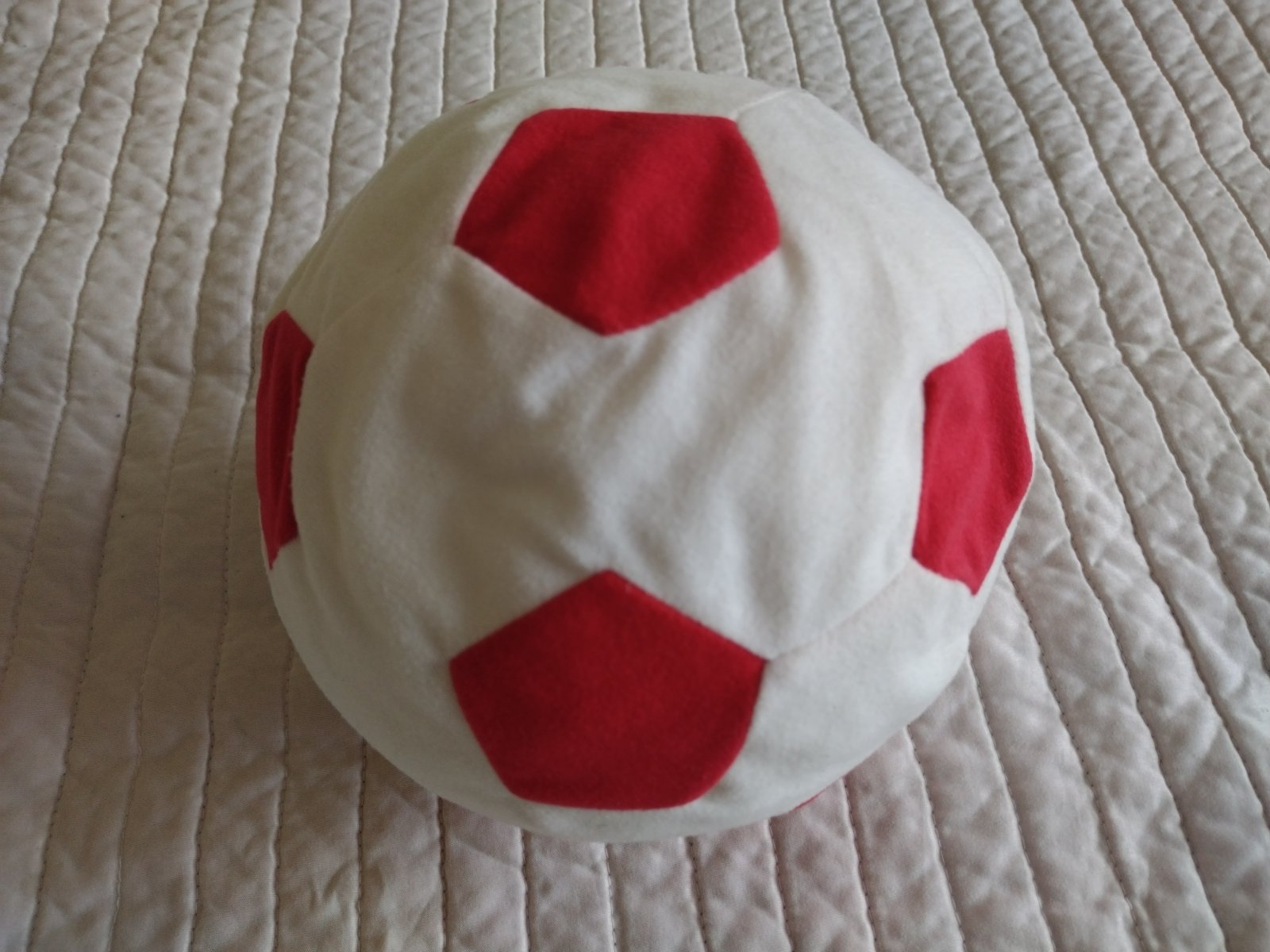 Plyšová lopta bielo červenej farby, bez poškodenia.