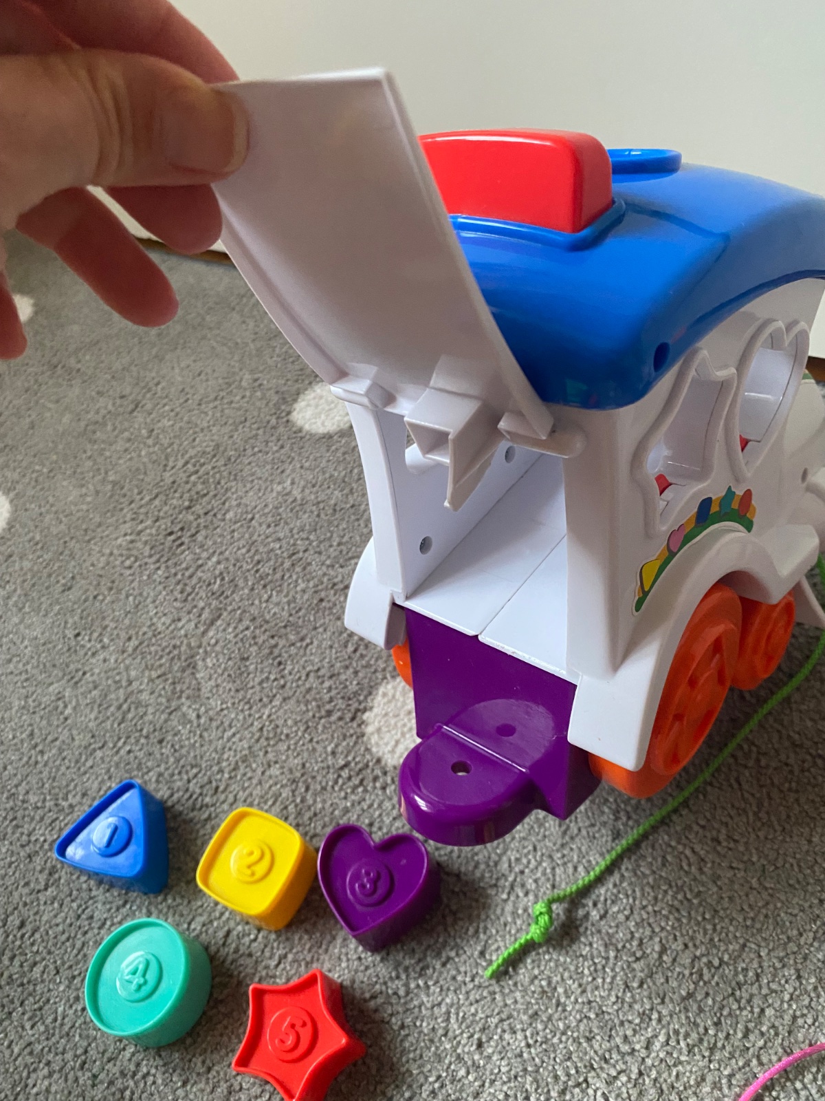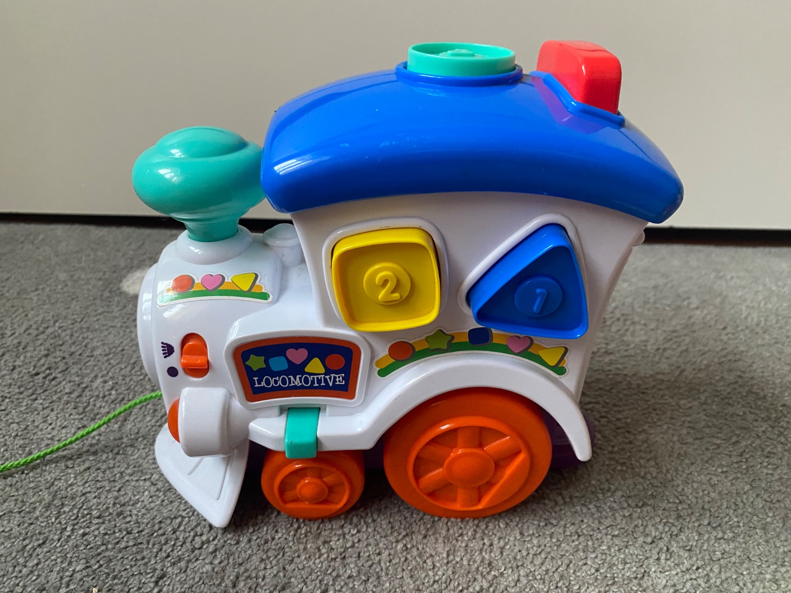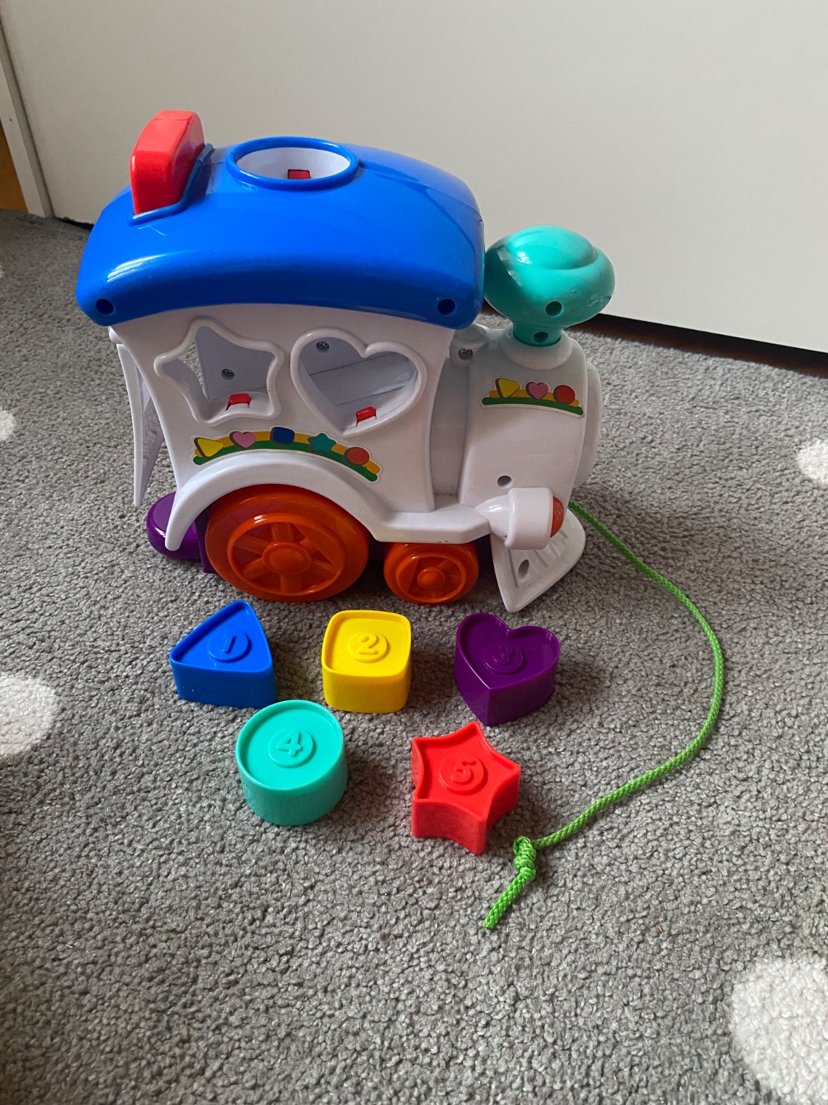 Vydáva aj zvuky ako lokomotíva, keď sa zapne a potom ťahá, alebo aj keď sa vložia jednotlivé tvary (červený cuplík v otvoroch sa tak zatlačí a vydá zvuk). Okrem tvarov sa dieťatko učí aj farby a môže sa učiť aj čísla do päť. Pekný hraný stav.