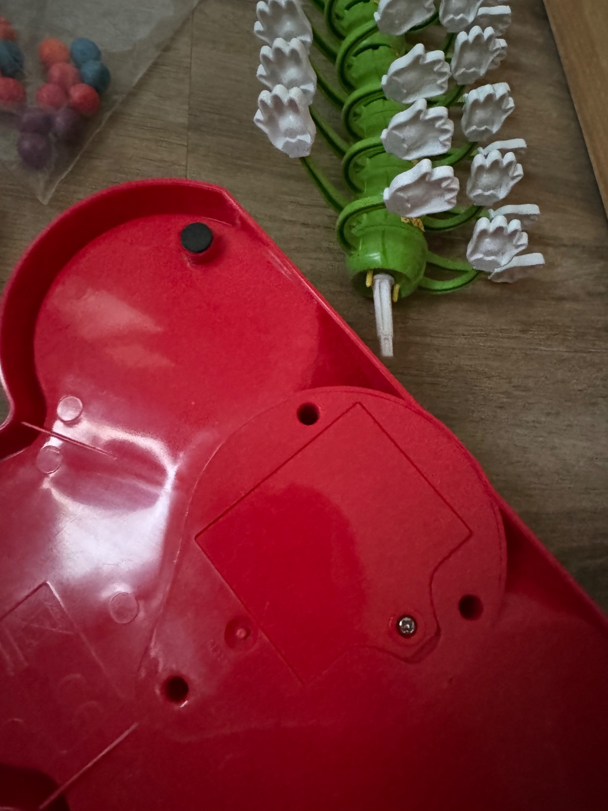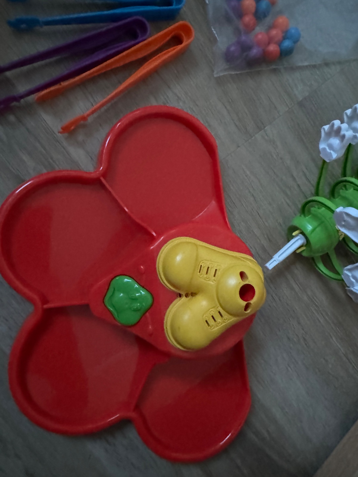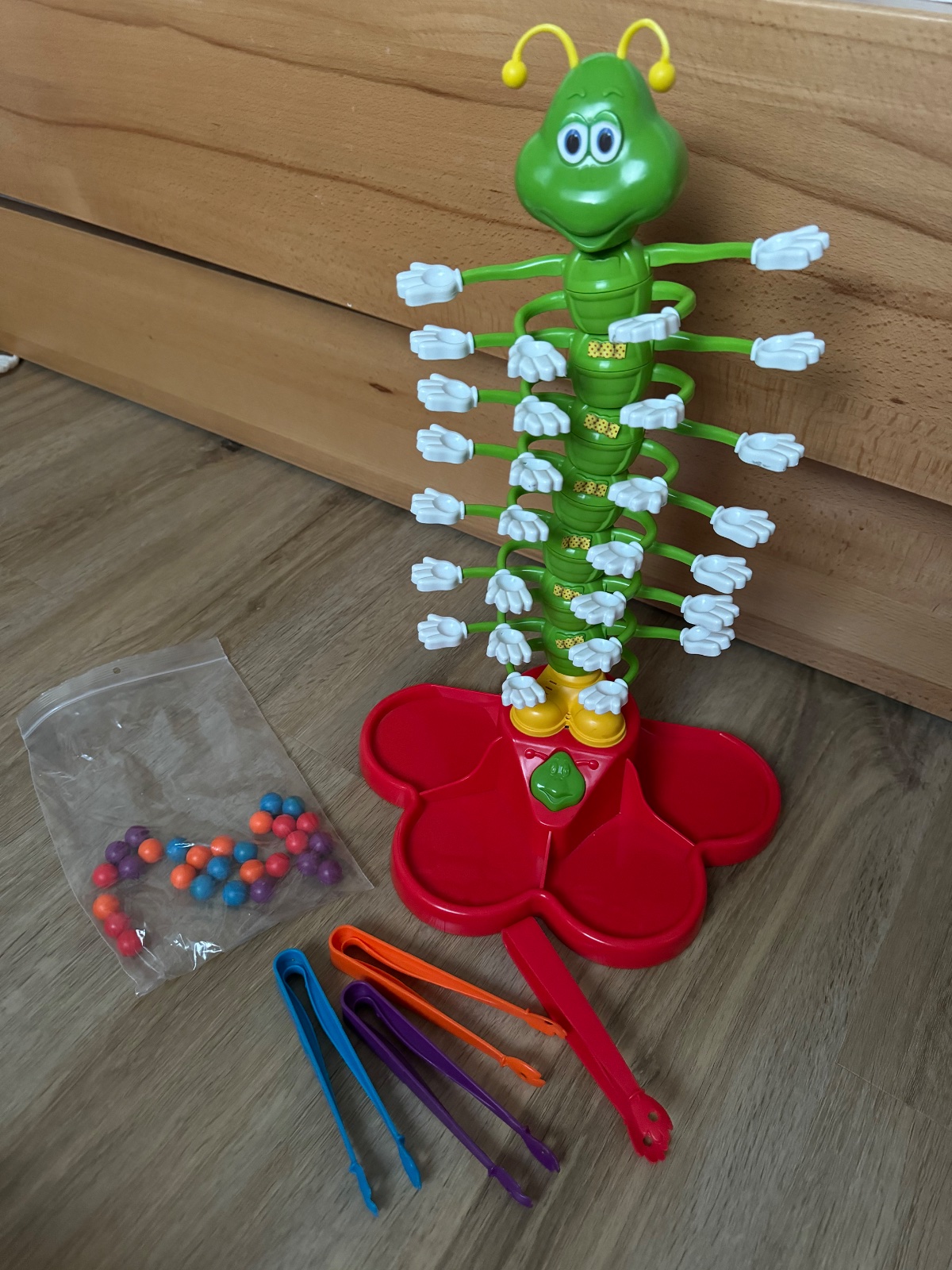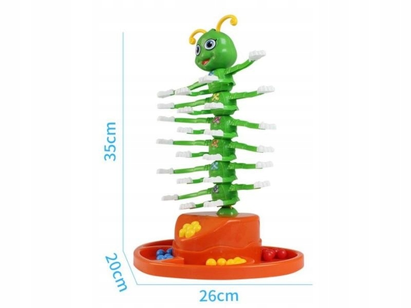Hra pre 1-4 hracov. Willi Wackel. Kliestikmi umiestnujete farebne gulocky na tancujucu husenicu ci stonozku…sutazne - nesutazne podla nalady. Fajn na trening prstov a uchopu.