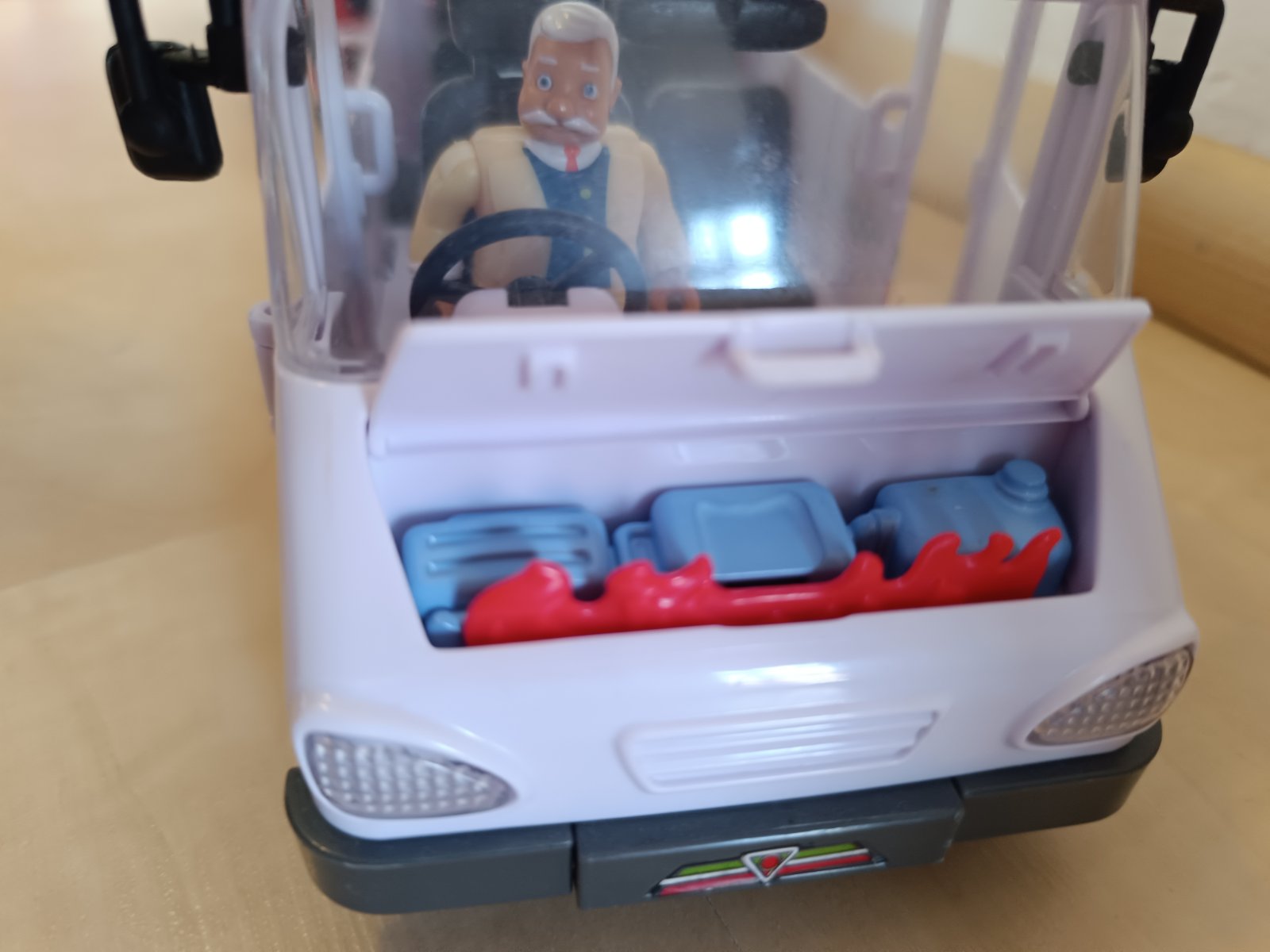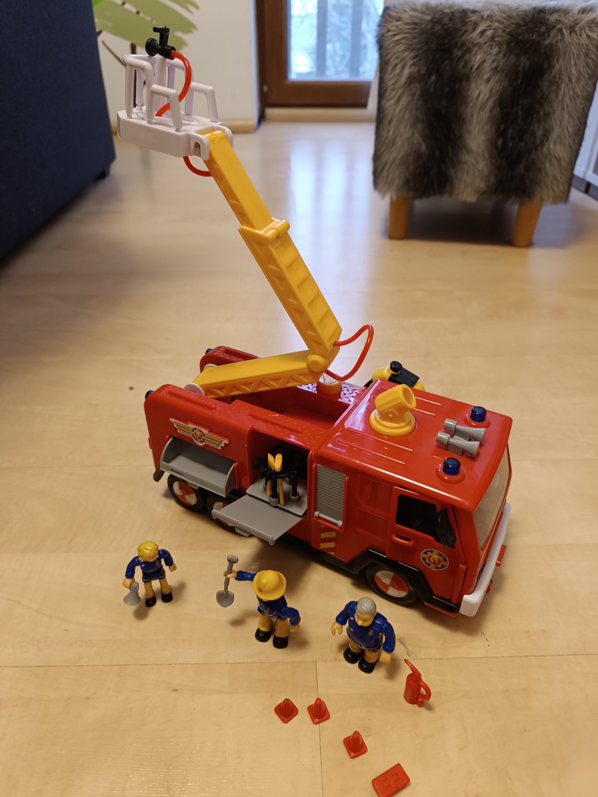Hasičské auto už nefunguju svetelné a zvukové efekty a navijak nakoľko sú hrdzavé kontakty na baterky, voda ale strieka.