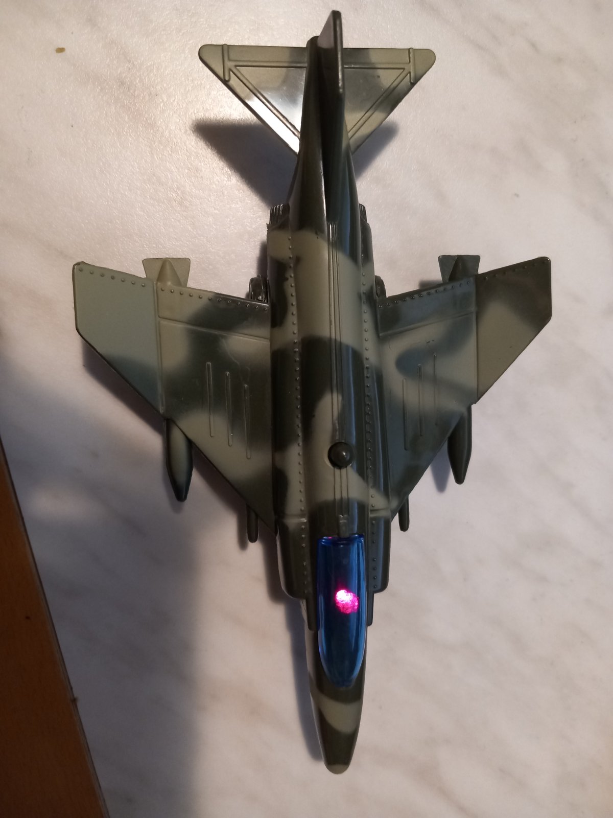 - stíhačka po stlačení gombíka na streche svieti a vydáva zvuk