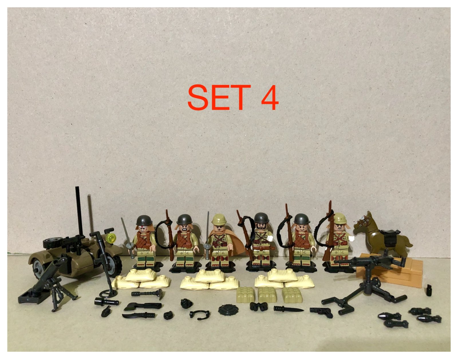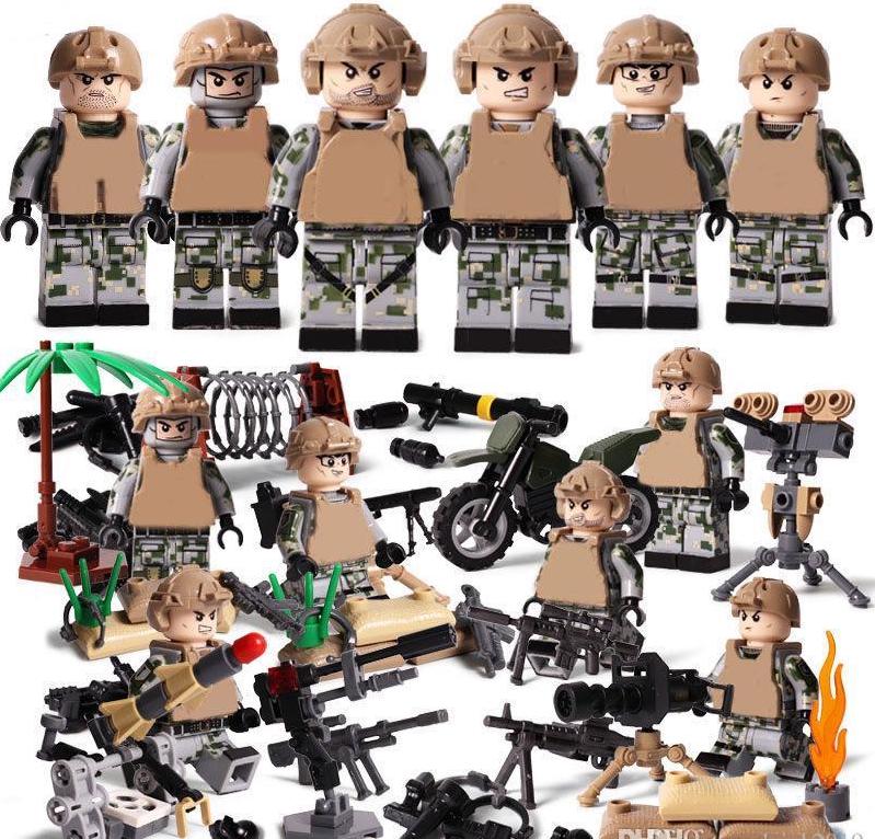 Predám obľúbené figúrky (postavičky, panáčikovia) rôzne sety vojakov. Jedná sa o sadu 6 veľmi kvalitných figúrok na obrázku vrátane všetkého príslušenstva, ktoré vidíte a uvedená cena je za celú sadu. Sú nové a zabalené, pasujú k legu - typ lego. Veľkosť figúrok je štandardná, teda 45 - 55 mm.