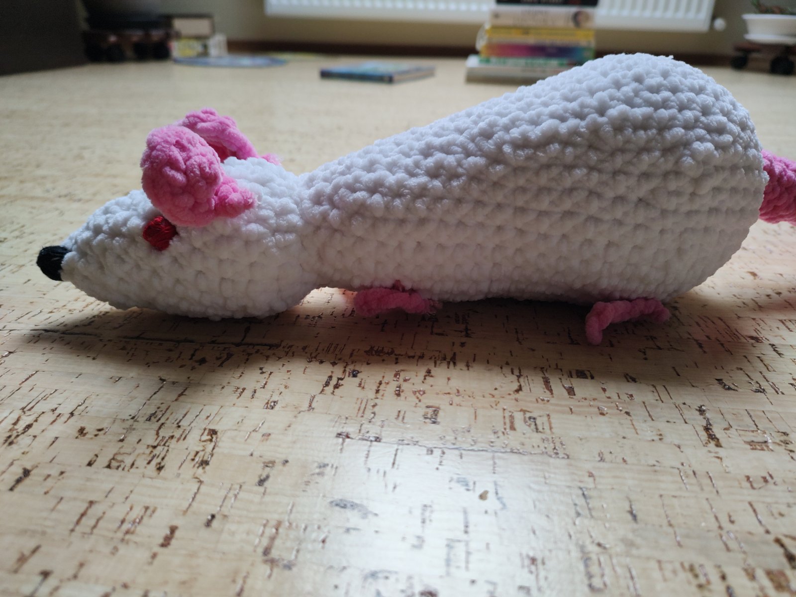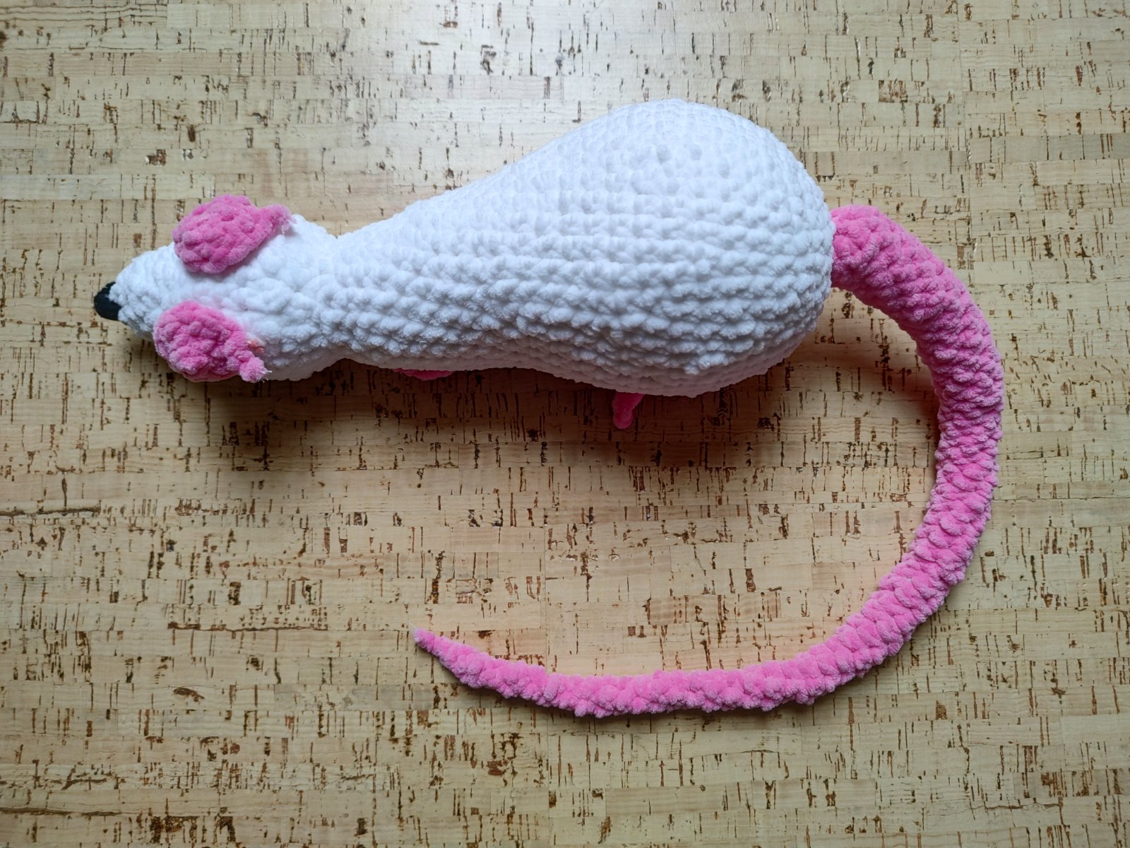 Predám ručne vyrobeného háčkovaného potkana s alergicky nezávadnou výplňou. Potkan je z hrubej hebkej syntetickej bavlny s vyšívanými očami a nosom, žiadne časti nie sú nalepené a teda sa dá ručne prať. Dĺžka tela je 30 cm + 41 cmtrový chvost. Ponúkam za 8 € + poštovné.
