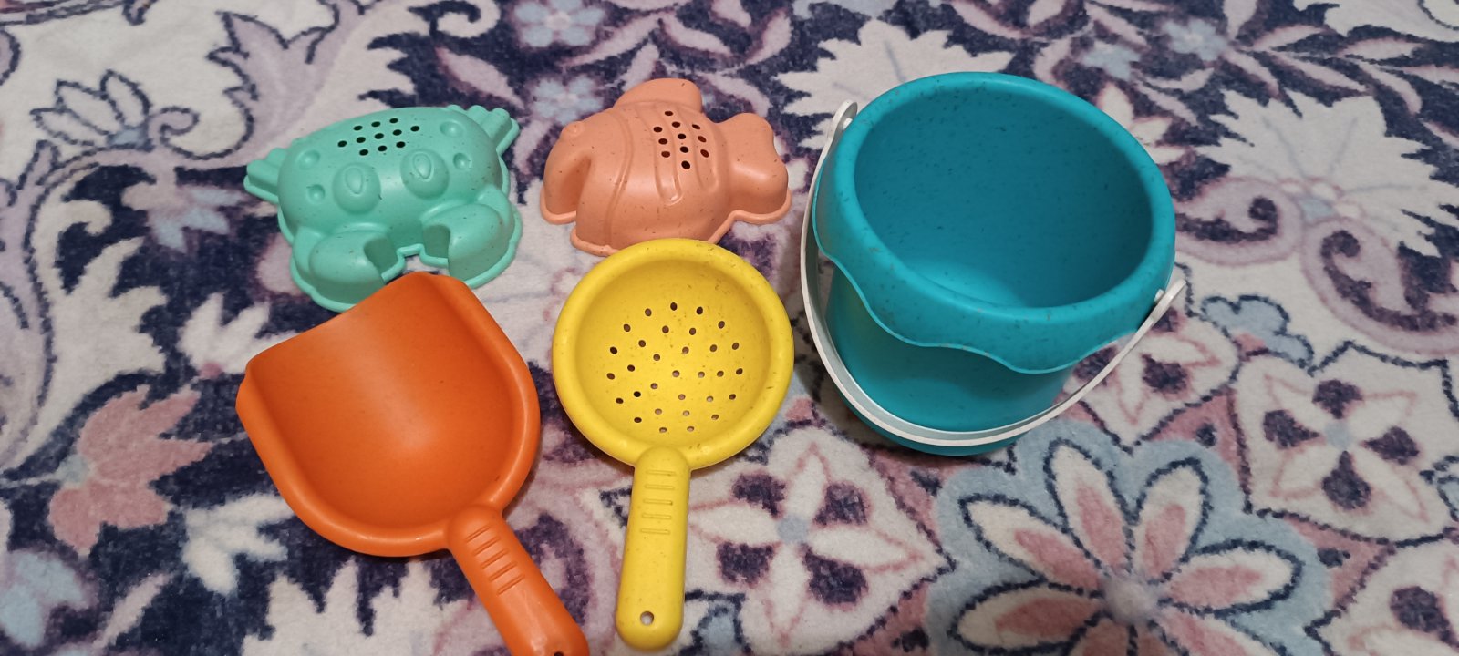 Hračky do piesku, kyblik, lopatka, sitko lopatka,dve formičky.