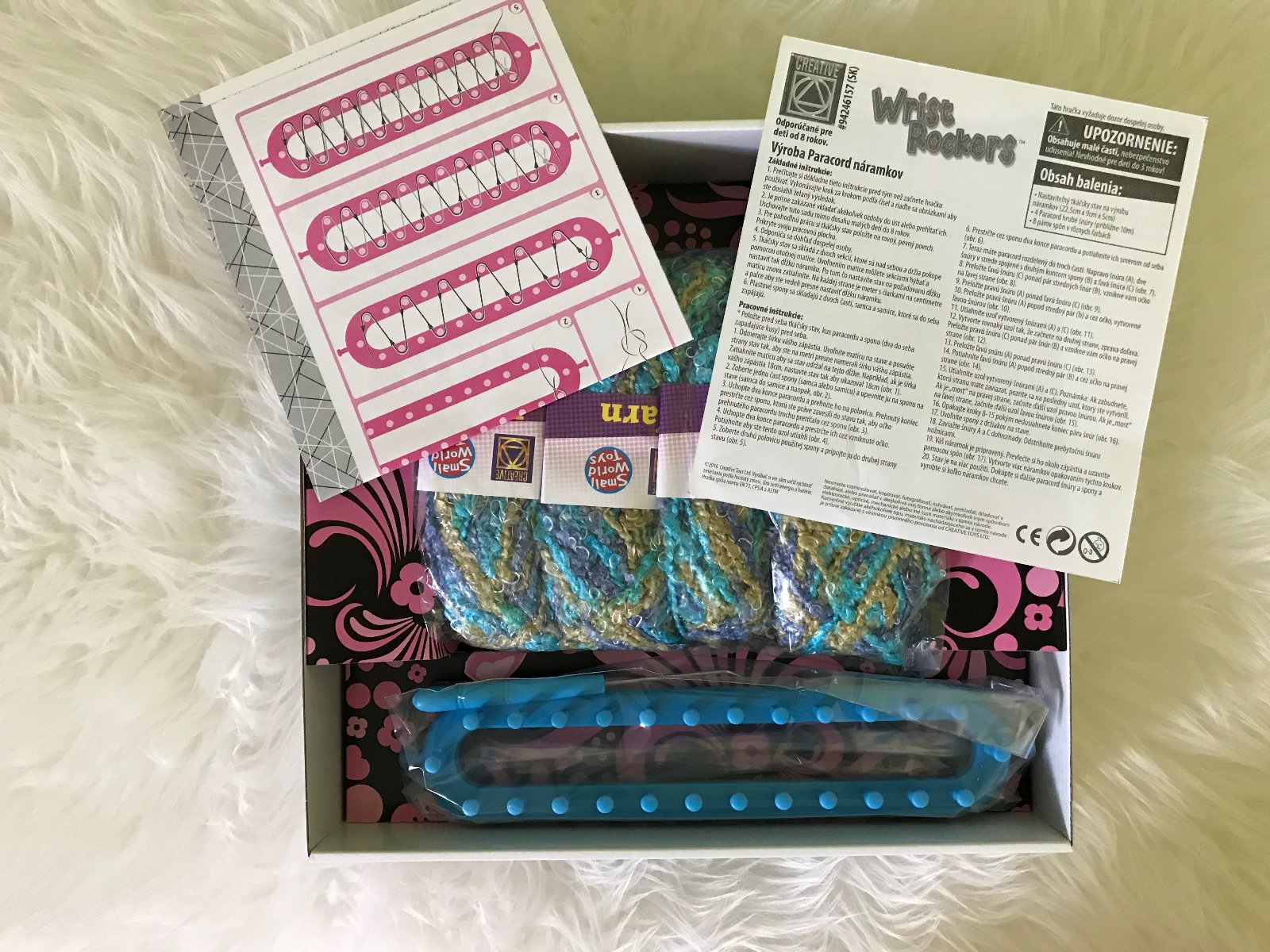Treba si dokúpiť guľôčky, zopár nám zostalo v stojane. Súčasťou sú 2 podložky, 3 obojstranné šablóny, 1 šnúrka, medajlón na náhrdelník,1 striekacia fľaštička. Fľaštička na vodu je trocha zažltnutá ...