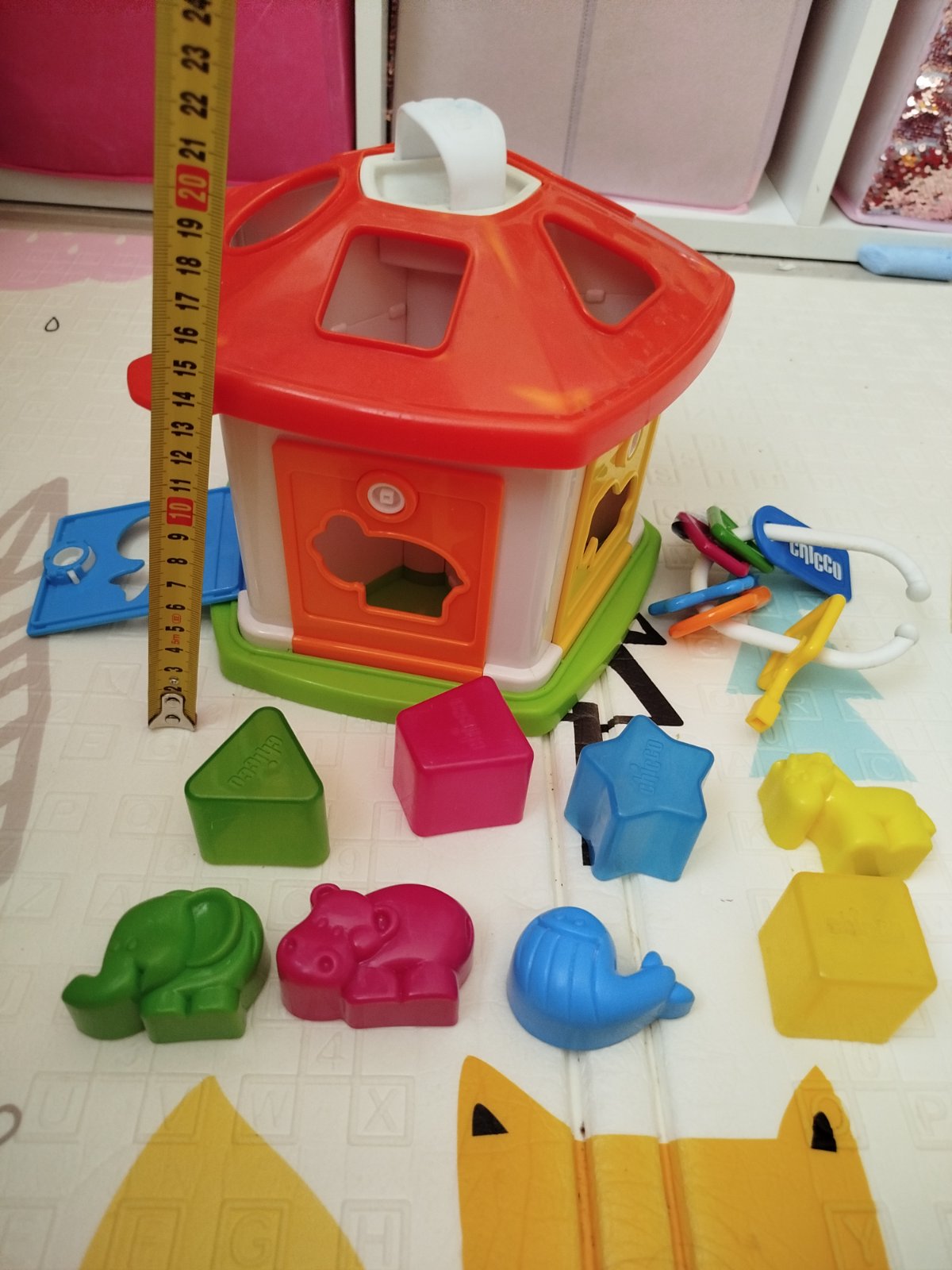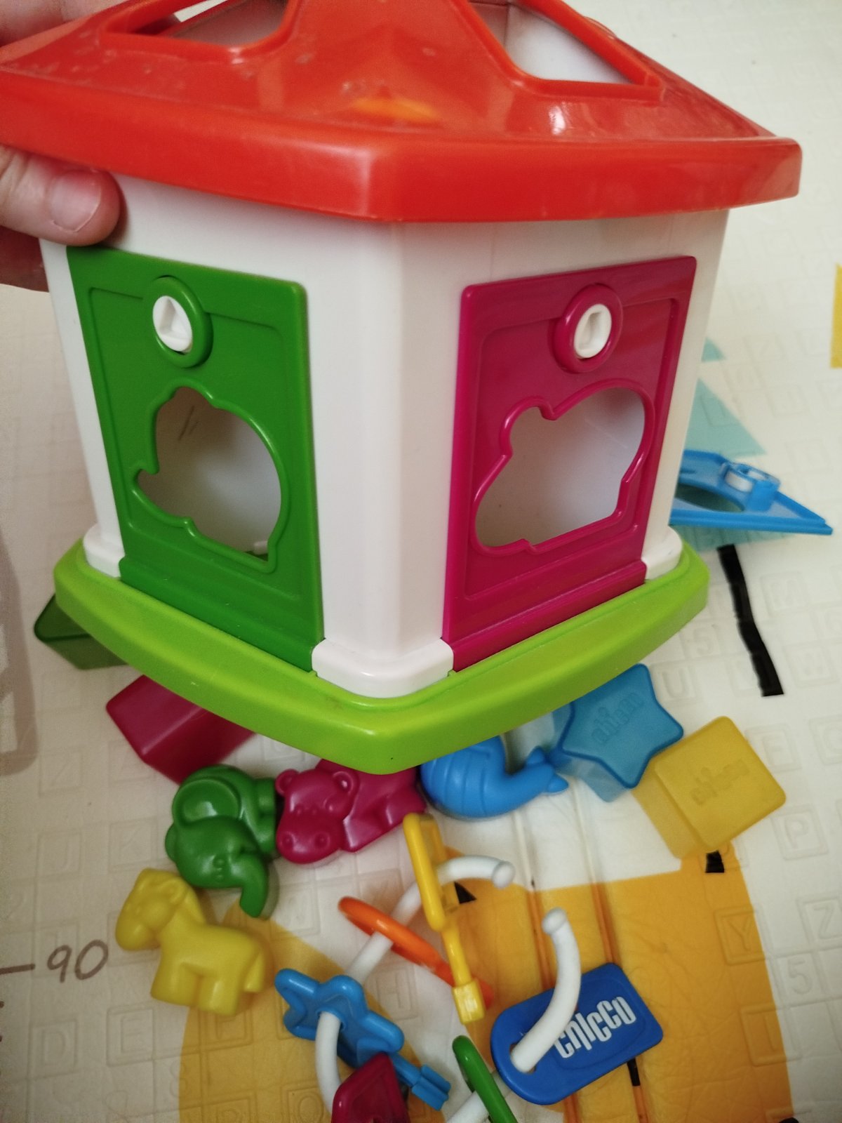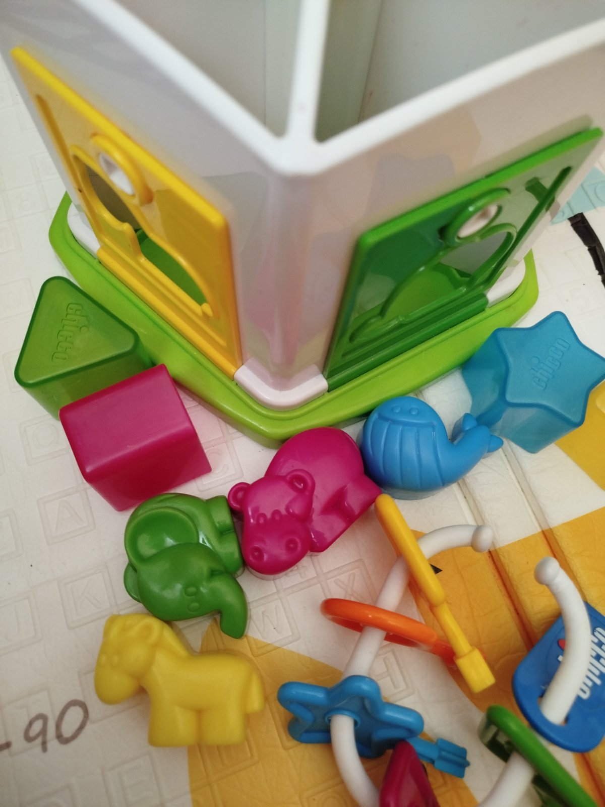 Hračka obsahuje zvieratká na vkladanie aj tvary na vkladanie, dieťa precvičuje jemnú motoriku i priraďovanie farieb. Zvieratká sa dajú využiť i ako formičky na hru s plastelínou, pieskom. Hračka je neúplná (chýbajú 2 ks oranžové formičky) a hračka je aj poškodená - bordovy kľúčik je odlomený, modré dvere už nedržia zatvorené, takže otváranie zámkov je možné už iba na 3 dverách. Darujem k nákupu alebo samostatne predám za 1 euro.