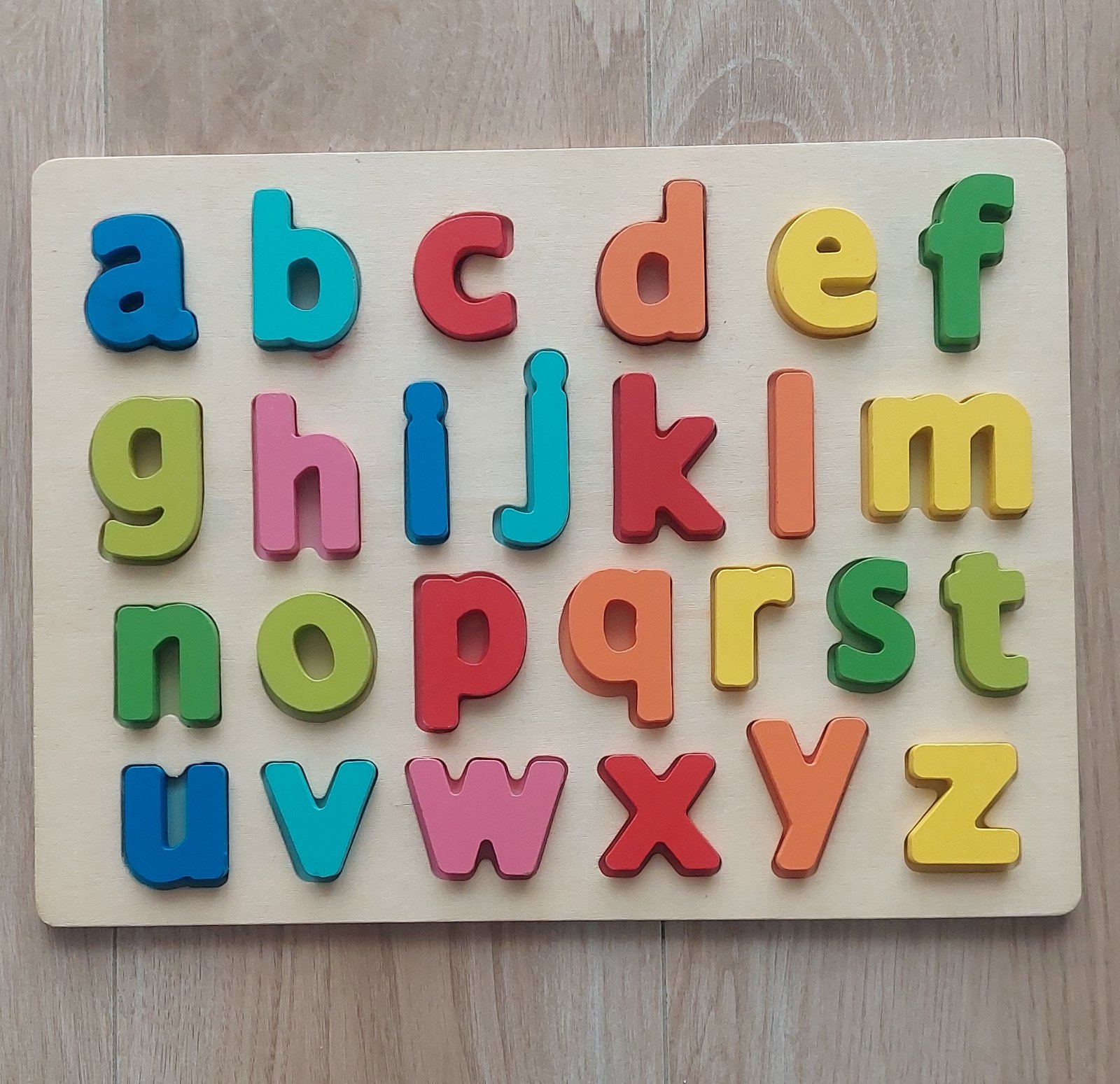 Drevená vkladačka - abeceda, malé písmená. Mám aj veľké písmená. V prípade, že kúpite obe, ponúkam za nižšiu cenu.