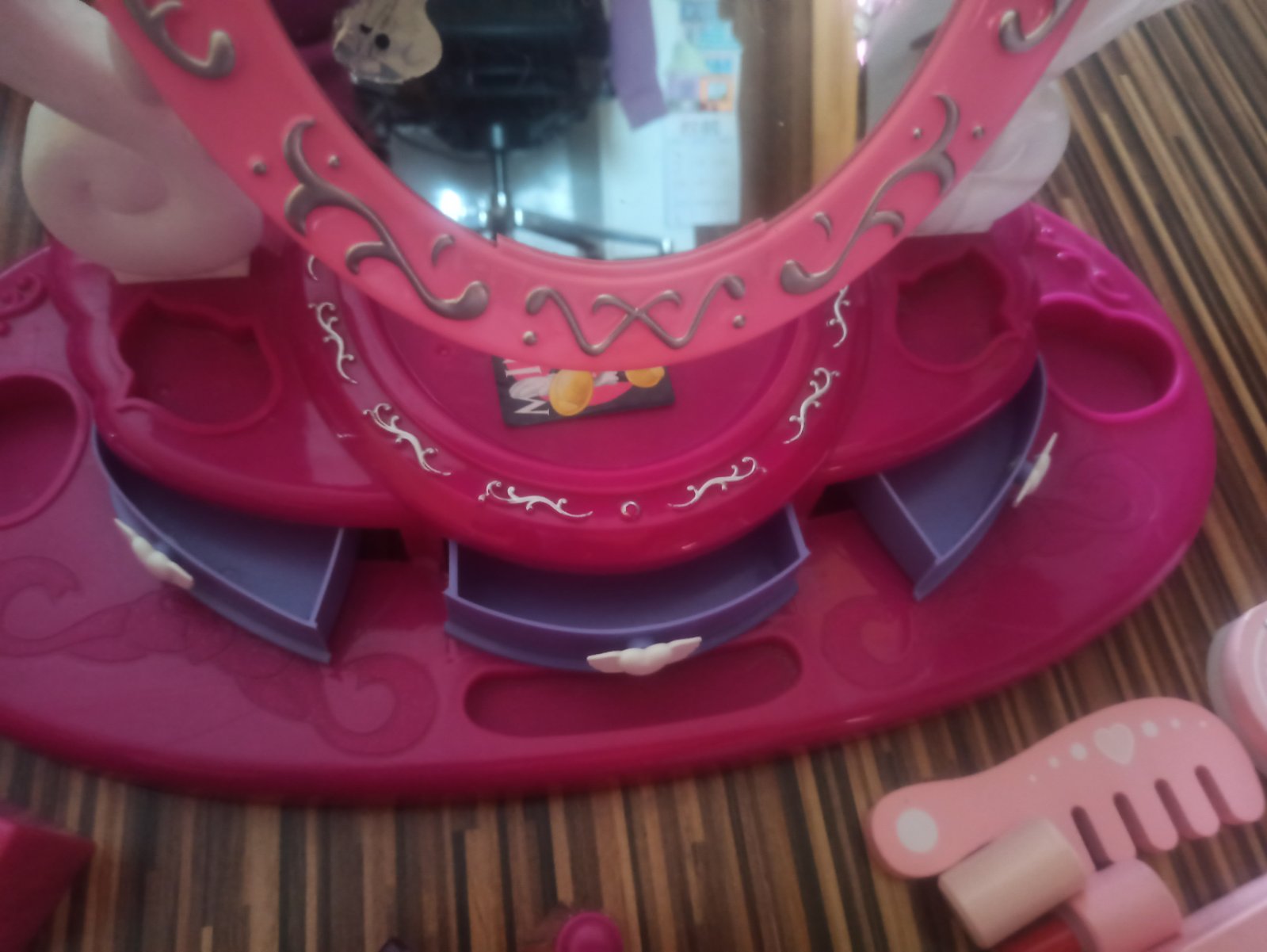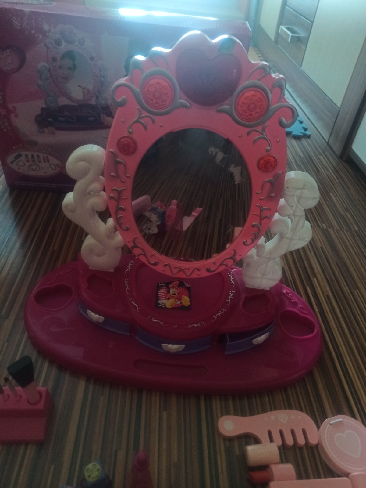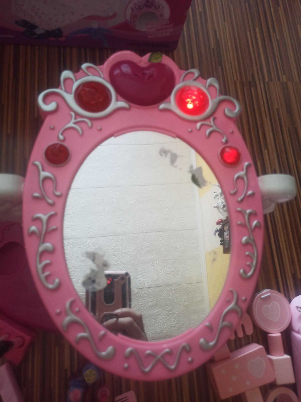 Zrkadlo sa da ohybat,svieti,hraje melodiu a ma 3x zasuvky. Zrkadlova cast je uz poskriabana a polepena nalepkami. Ako hracka este urobi radost.