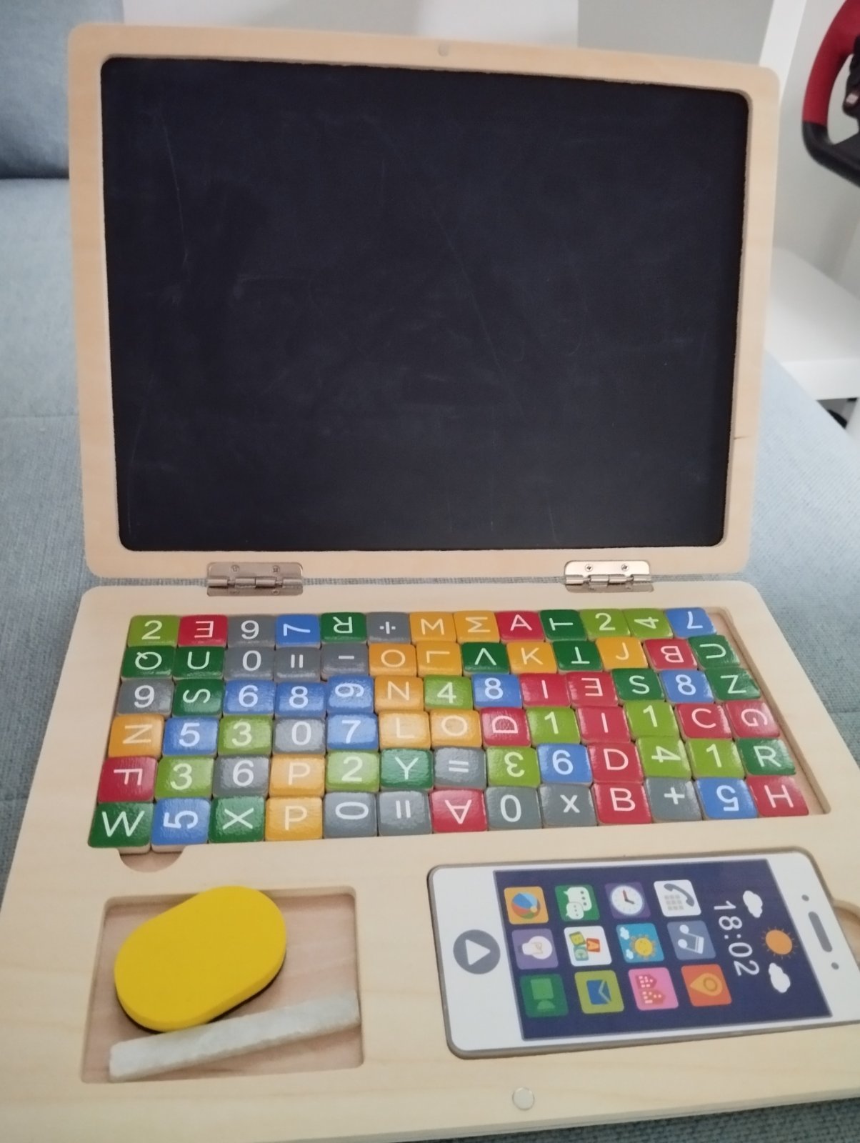 78 magnetických písmen,.číslic a znamienok, krieda, špongia a drevený mobil.
