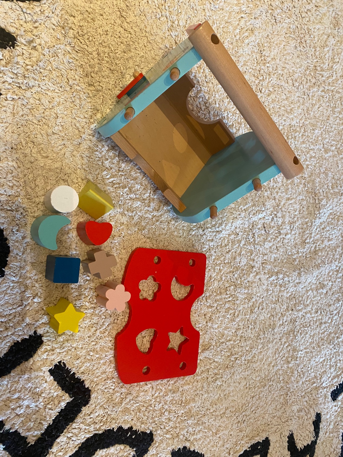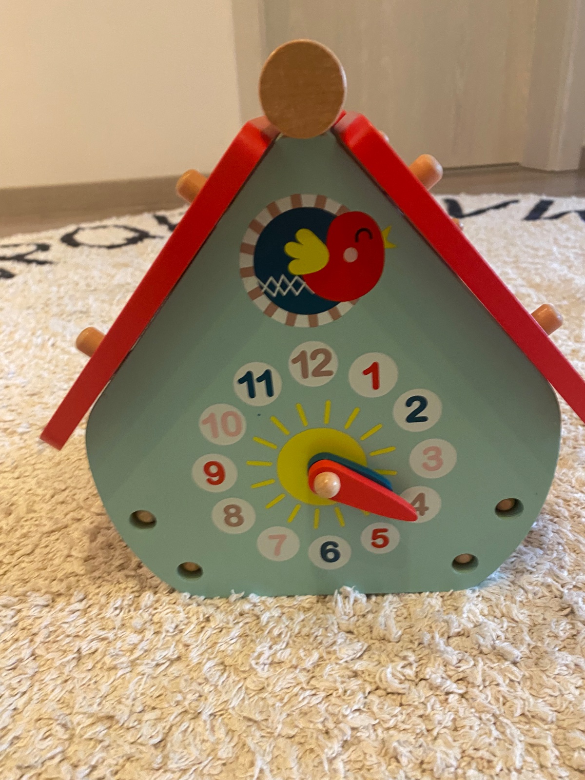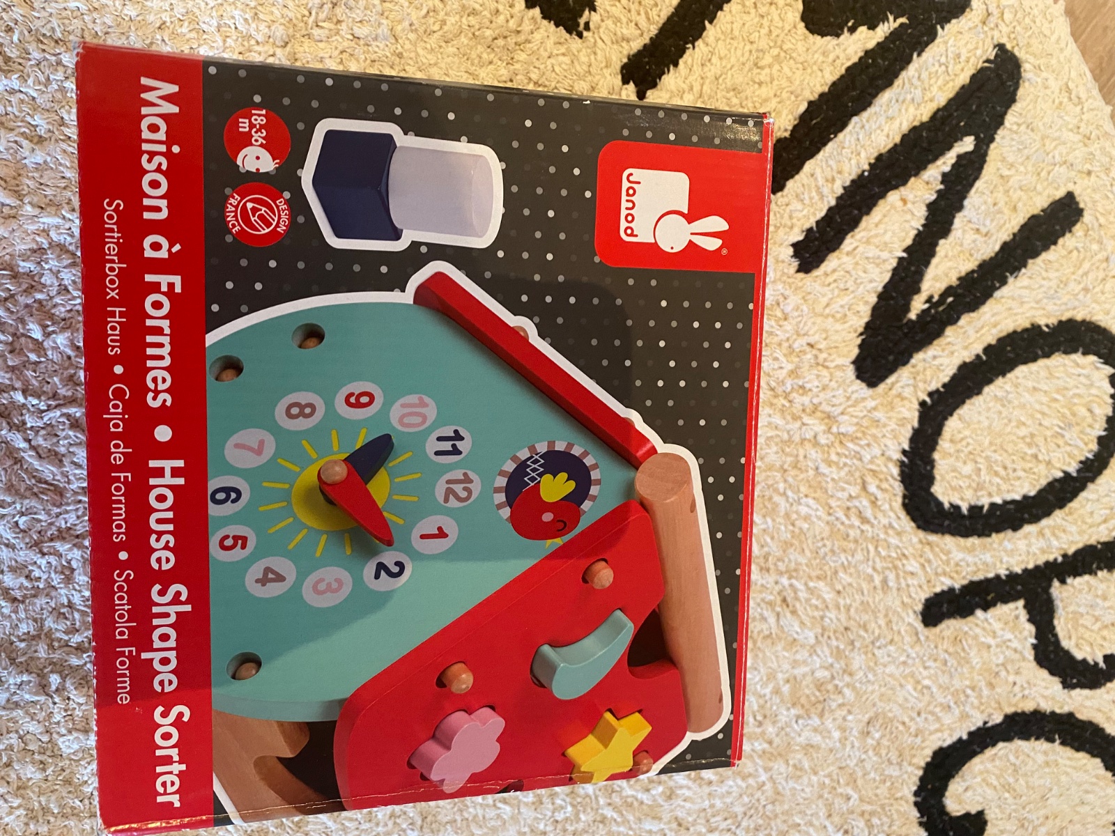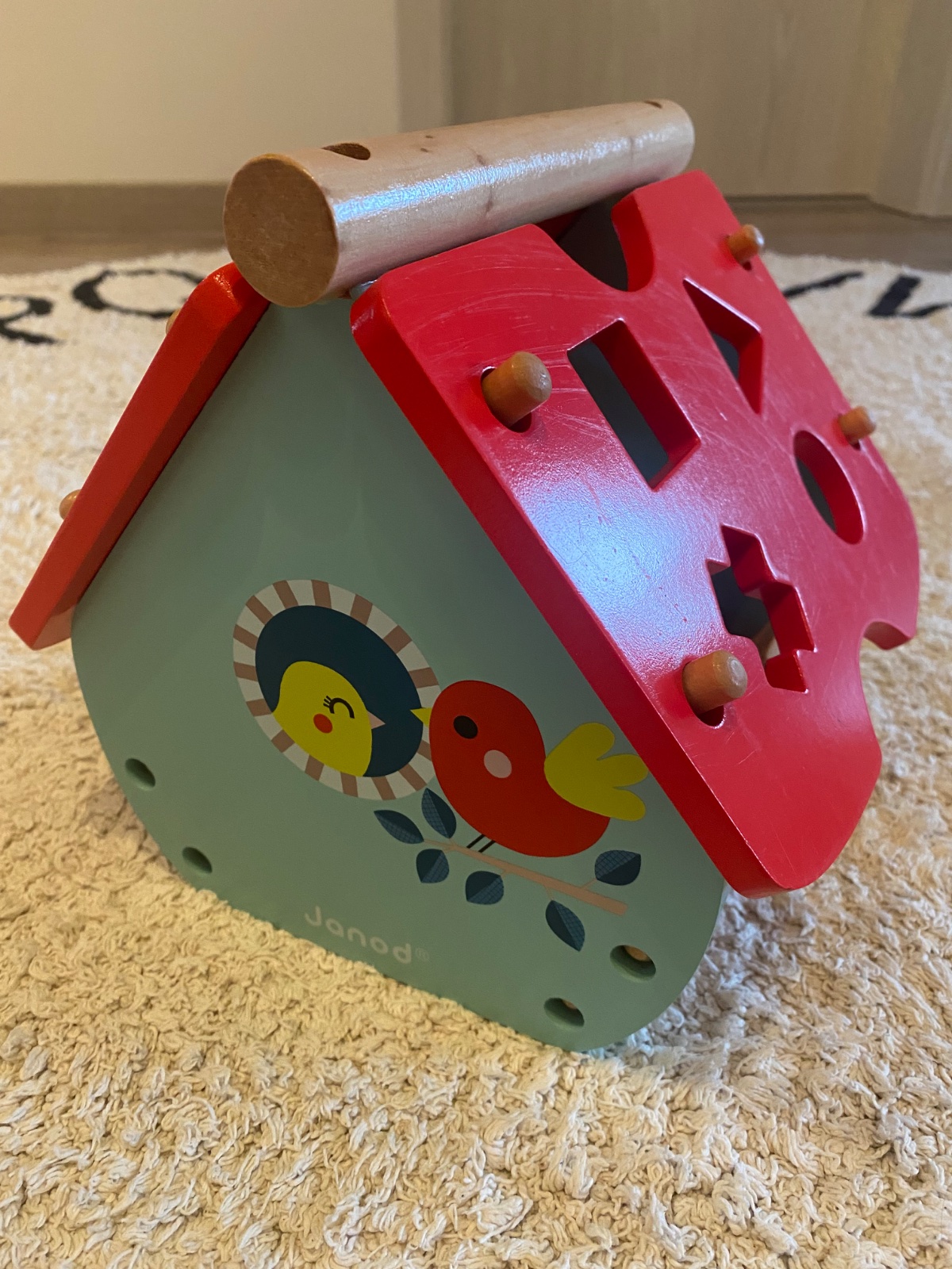 Drevená vkladačka značky Janod s hodinami. Odoberateľná strecha.
