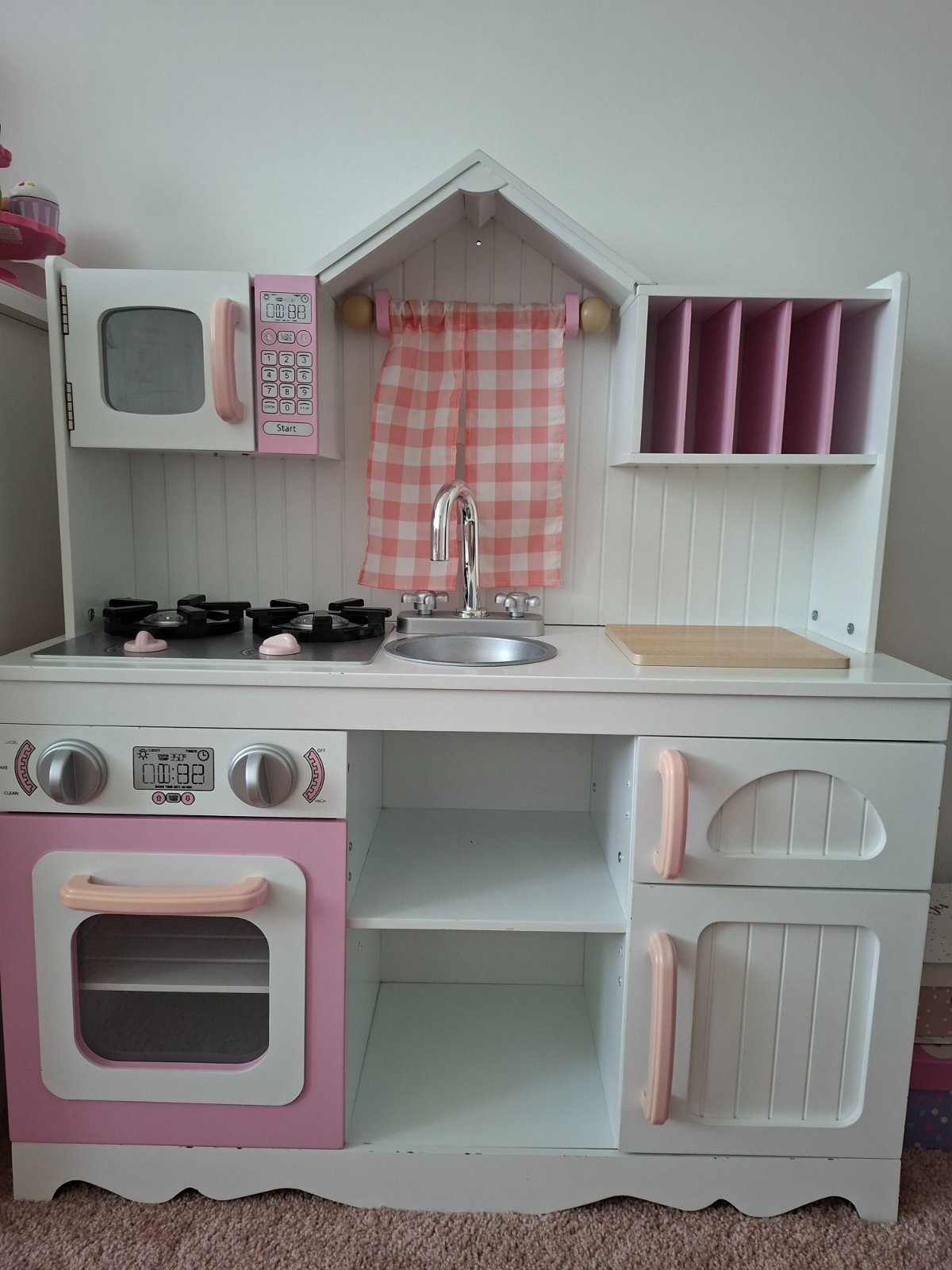 Detská kuchynka KridKraft v jemnej ružovej a bielej farbe. Všetky dvierka kuchynky možno ľahko otvoriť a zatvoriť, gombíky pri sporáku rúry a drezu sa otáčajú, záclonka nad umývadlom, pod umývadlom dve poličky, držiak na utierky, priehradky na kuchárske knižky alebo ozdobné tanieriky, bezpečne zaoblené hrany, vyrobené z dreva a MDF
