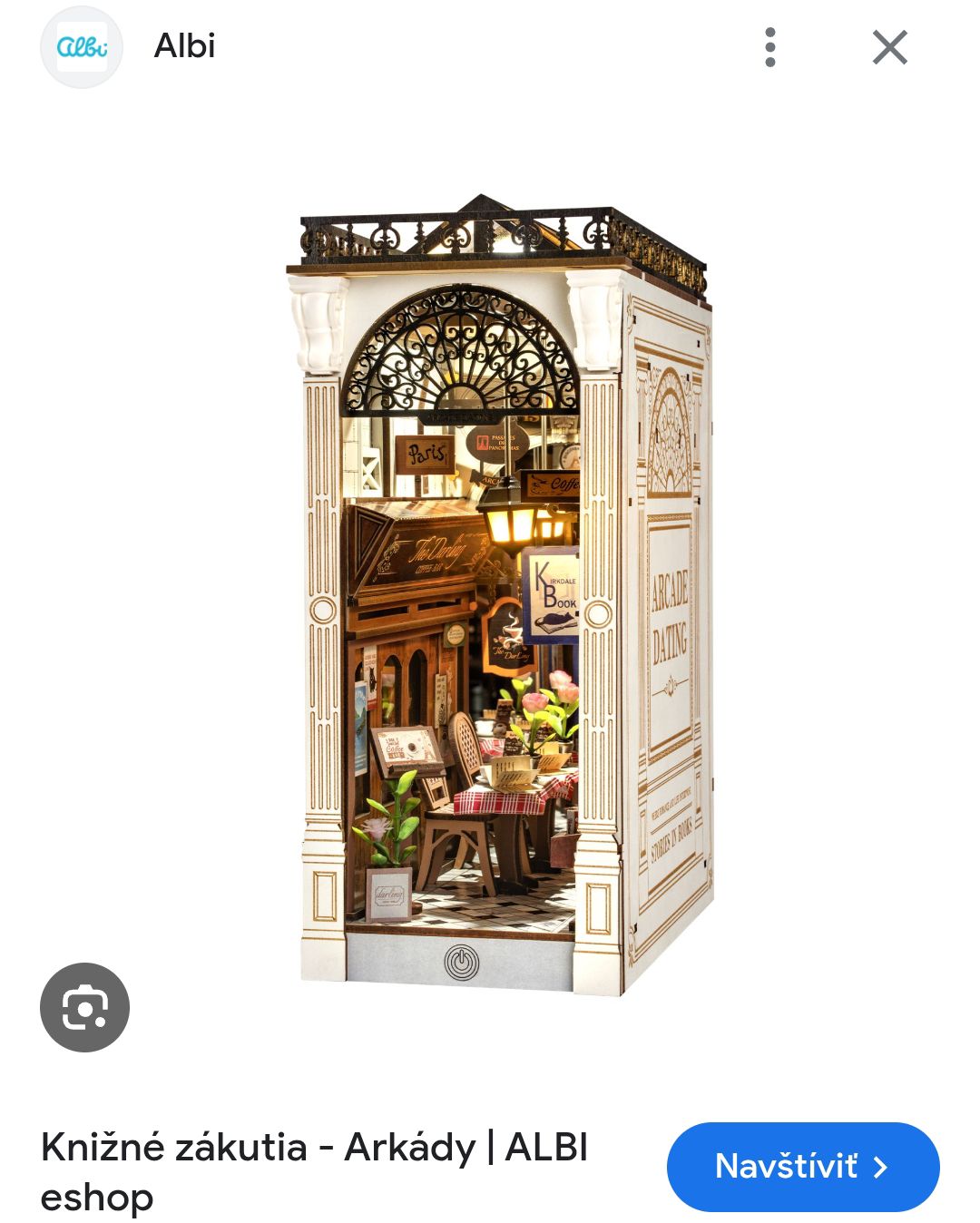 Ozvláštnite svoju knižnicu miniatúrou malebnej arkádovej uličky. Knižné zákutia - Arkády je kreatívna stavebnica z dreva značky Robotime, ktorá vám umožní vlastnoručne zostaviť detailnú 3D miniatúru večernej európskej uličky s obchodíkmi, kaviarenskými stolíkmi, lampášmi, ceduľami a balkónom ako vystrihnutým z Shakespearovej romantickej drámy. Cena 43€ poštovným.