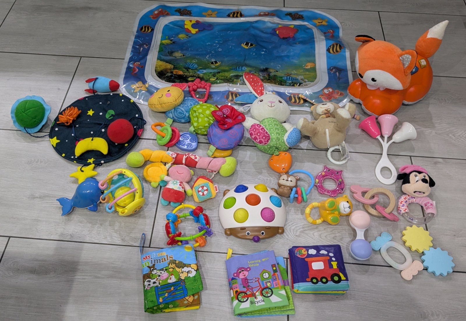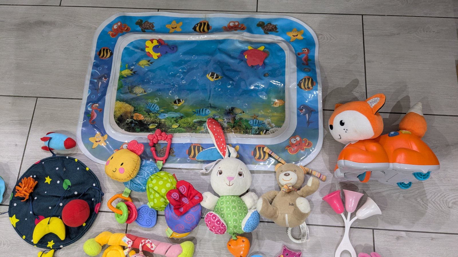 Predám balík hračiek, hrkalky, hryzatka, látkové knižky, hračka na kočiar , hrajúce zvieratká melódiu na spanie , líška Fisher price, vodná podložka