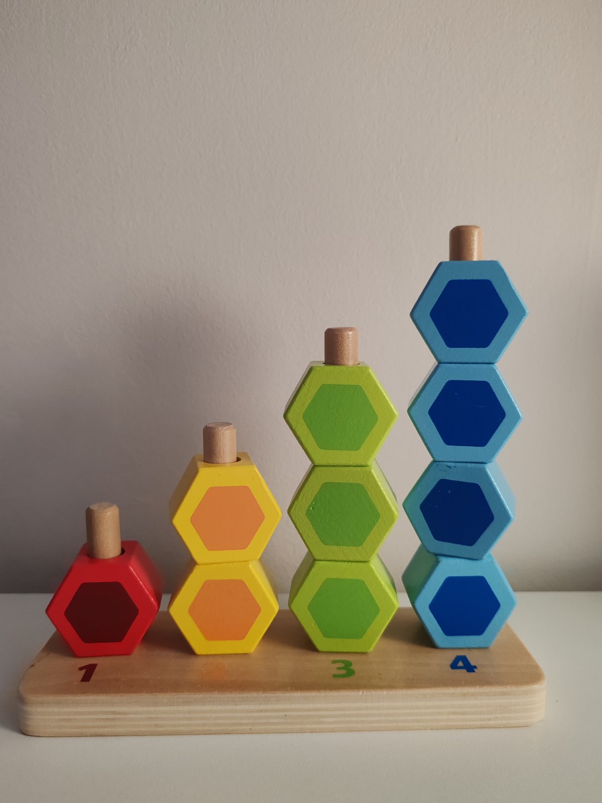 Farebné drevené navliekacie kocky. Veľmi pekný stav. Drevené tyčky sú ohybné, čo sa mne osobne veľmi páčilo, ľahšie sa s tým manipuluje aj menším deťom