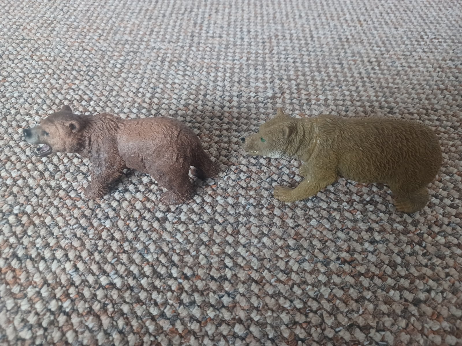 Predám medvede. Aj jednotlivo. Tmavohnedý je Schleich - cena 4,50 eur, svetlejší medveď cena 0,50 eur. Výška cca 6-7 cm, dĺžka 10 -12 cm.