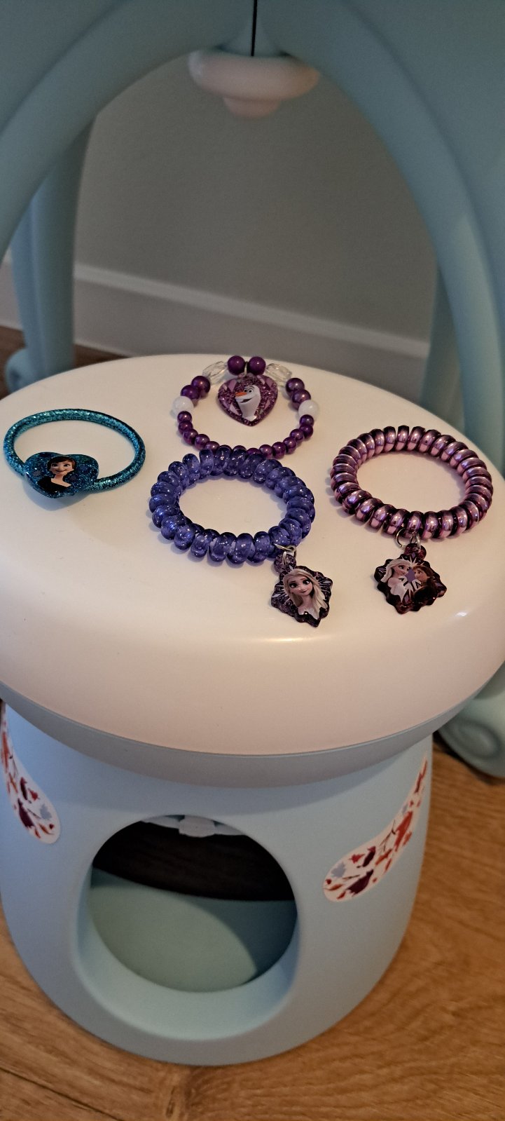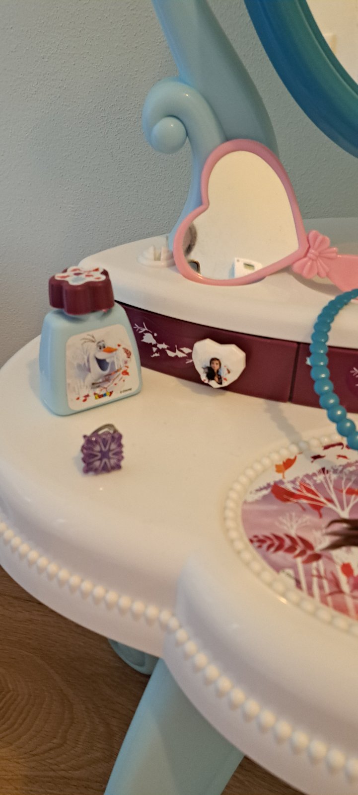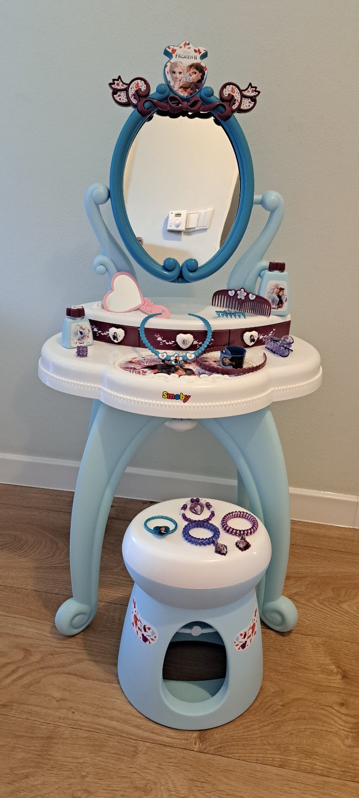 Kozmetický stolík Frozen + stolička od Smoby pre malé parádnice. Doplnené o náramky a iné doplnky z adventného kalendára Frozen. Ako NOVÉ, bez poškodenia.