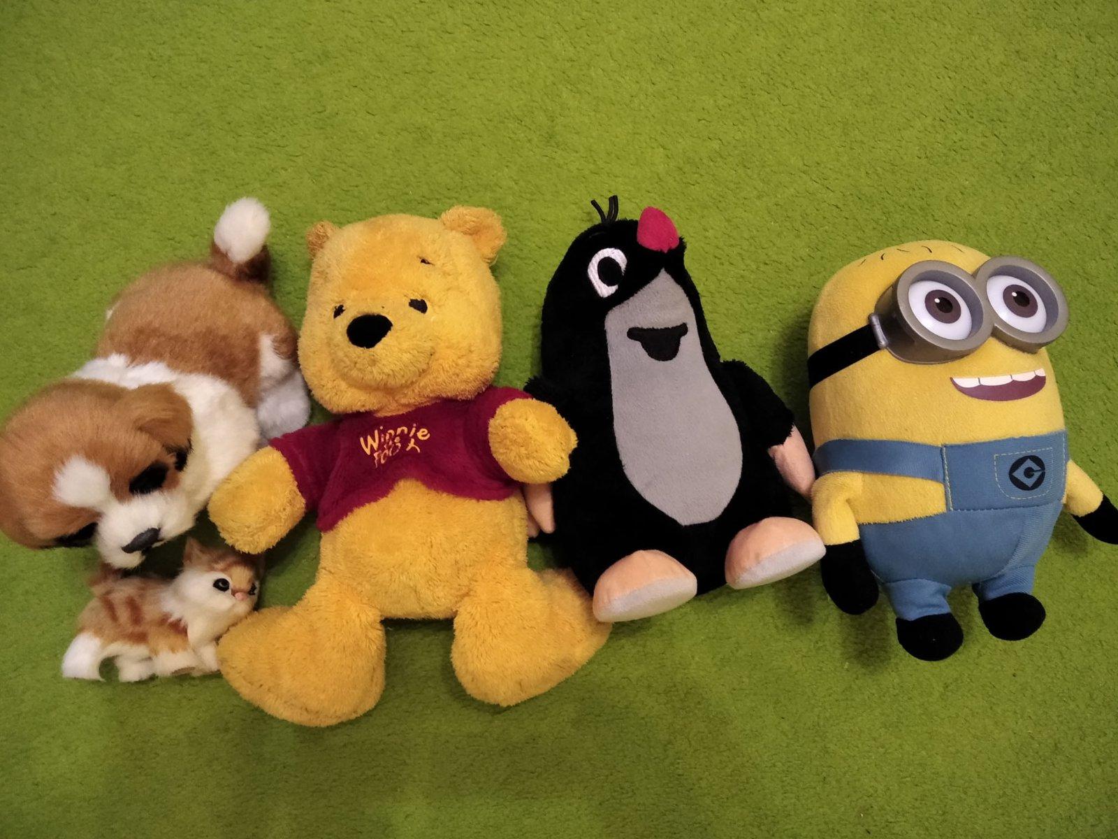 Predam plyšové figurky, psik s macickou vlavo su vytvrdeny material, ostatne su makky plys. Vyska postaviciek cca 20-25 cm. Cena spolu