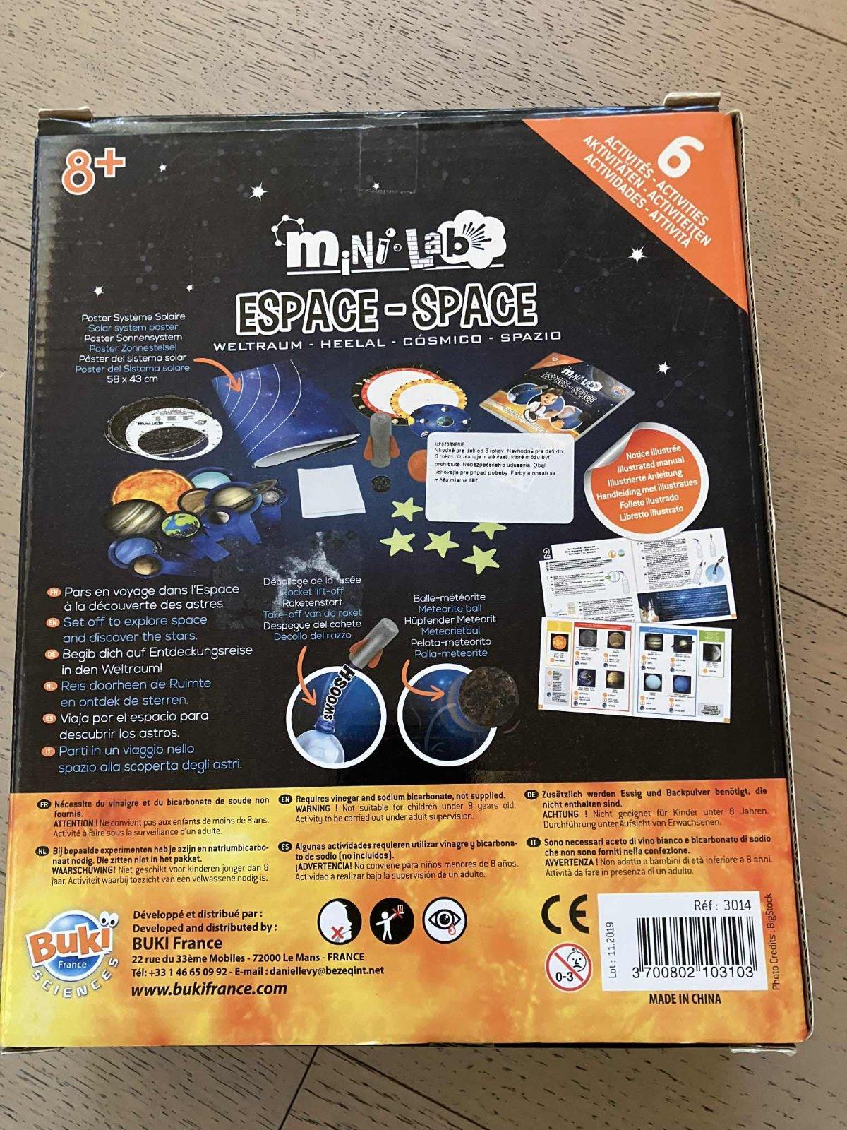 Sady miniLab sú určené pre začínajúcich vedátorov v rôznych oblastiach bádania. Vesmírne laboratórium umožní deťom hravou formou preniknúť do niektorých tajov vesmíru a našej slnečnej sústavy. Zostrijete si slnečnú sústavu, ktorú si následne môžete dať na stenu ako plagát, pochopíte fázy Mesiaca a pohyb nočnej oblohy. Vyrobíte si hopíka, ktorý bude mať štruktúru meteoritu, skúsite štart vlastnej rakety z PET fľaše alebo si vytvoríte vlastné svetielkujúce súhvezdie na strope svojej izbičky.