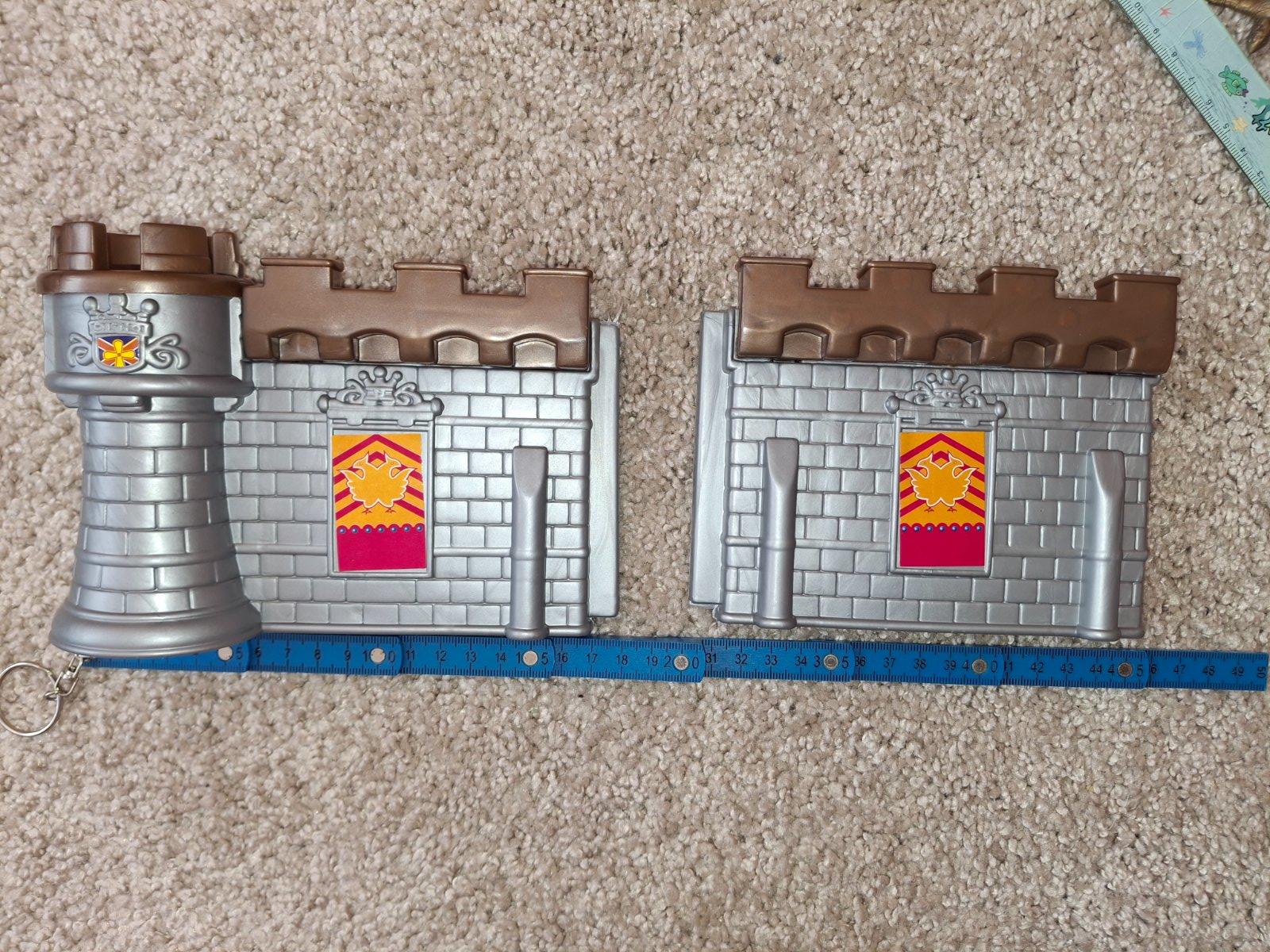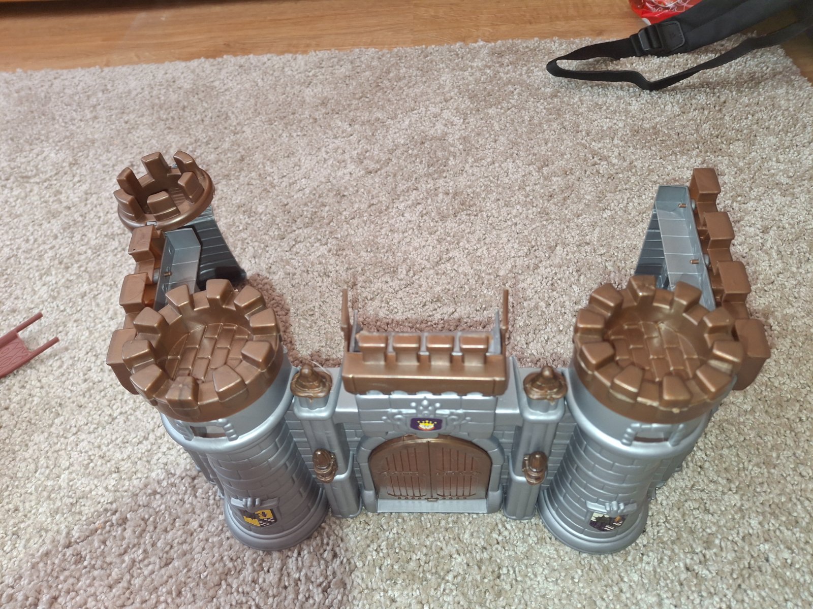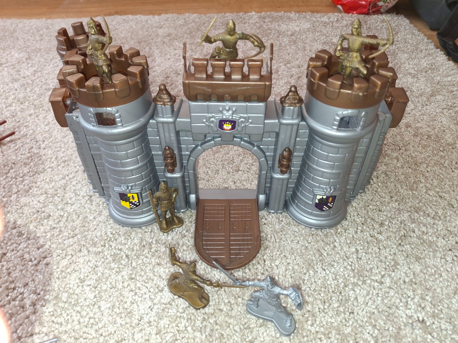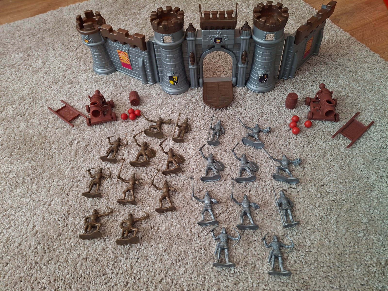 Vďačná hračka pre chlapcov. Delá sú na pružinou teda gulička sa dá vystreliť, hradby su variabilné, brána sa sa otvoriť aj zatvoriť. Kupované normálne v Dráčiku alebo Alltoys ako lisovaný výrobok, takže diely sa vylamovali a spajali, taktiež delá sa dajú rozobrať. V podstate sa to dá chápať aj ako stavebnica.Dodám ako cca zloženú, lebo jednak už nie je návod a niektoré časti aby sa stále nevytahovali sme spevnili tavnou pistolkou ale dá sa to stále vytiahnuť vid foto a lepidielko ide pekne vylupnut bez akéhokoľvek poškodenia, či známok ze tam bolo.