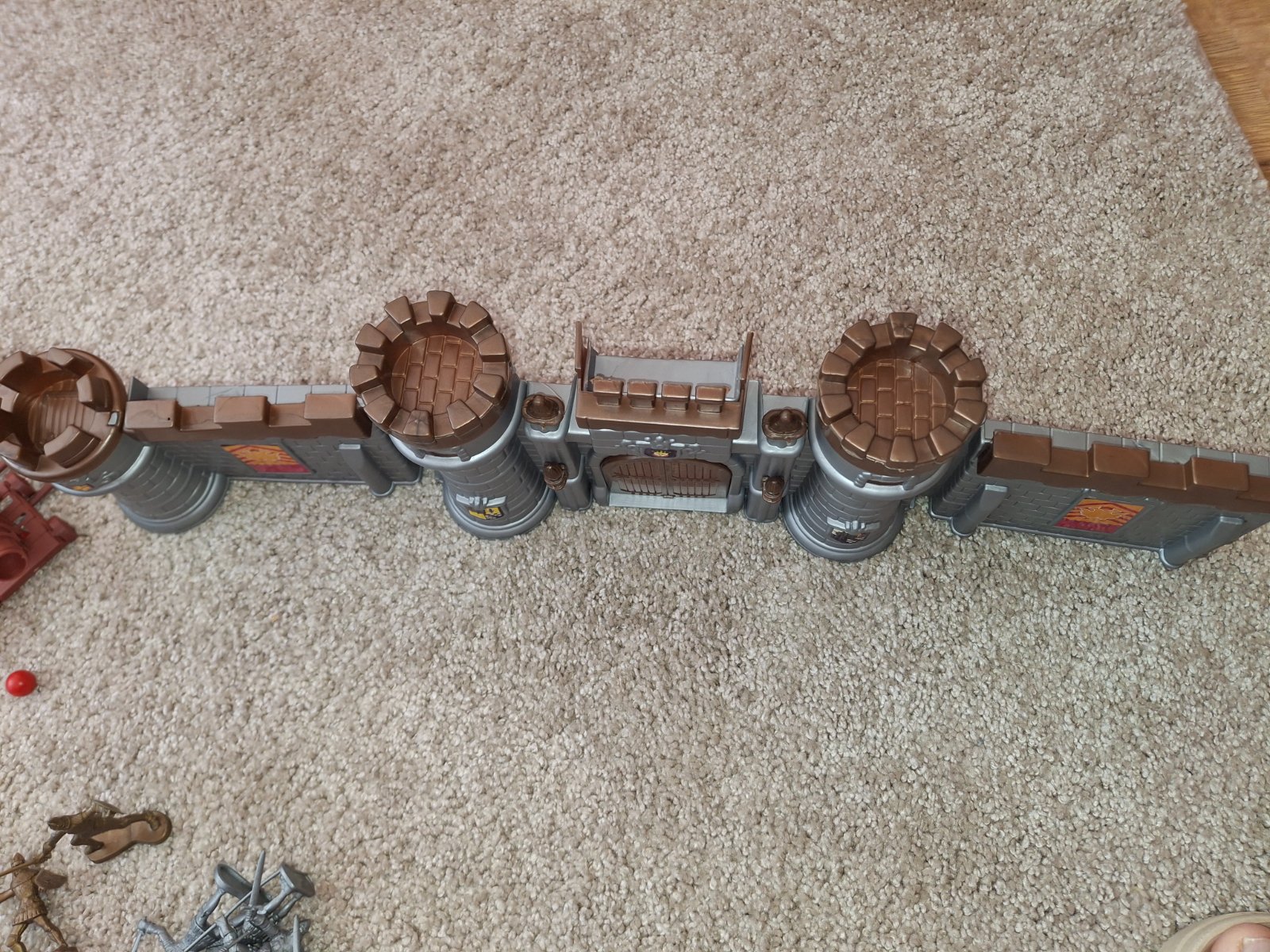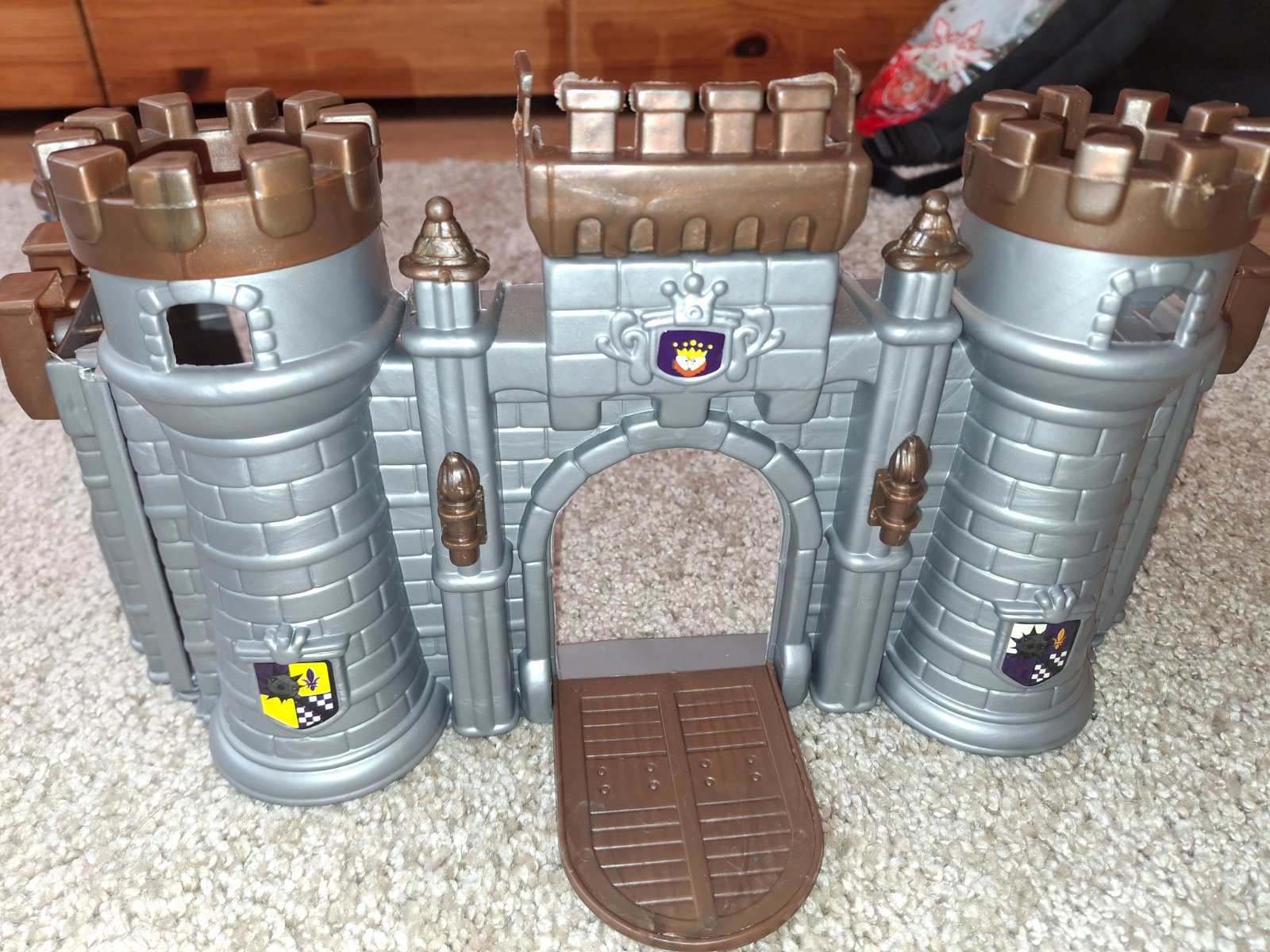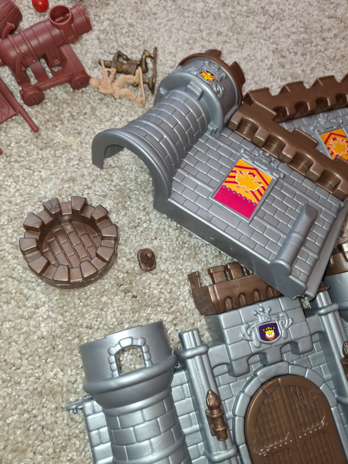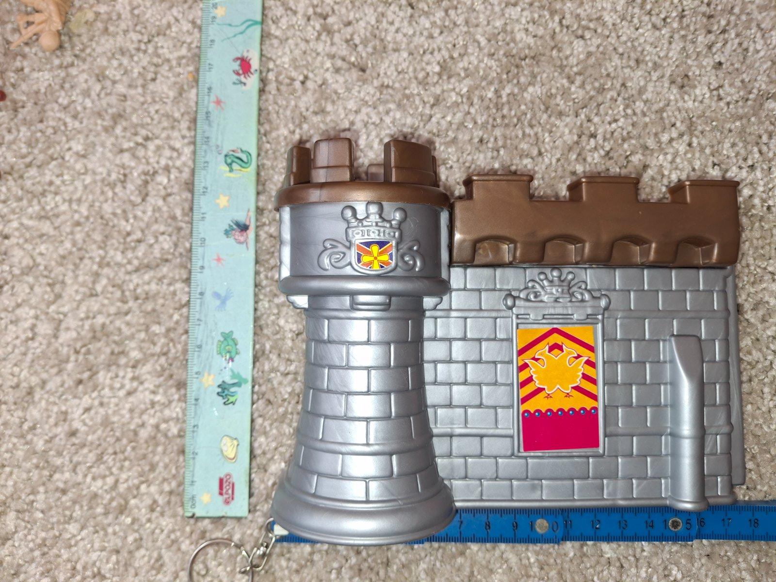 Vďačná hračka pre chlapcov. Delá sú na pružinou teda gulička sa dá vystreliť, hradby su variabilné, brána sa sa otvoriť aj zatvoriť. Kupované normálne v Dráčiku alebo Alltoys ako lisovaný výrobok, takže diely sa vylamovali a spajali, taktiež delá sa dajú rozobrať. V podstate sa to dá chápať aj ako stavebnica.Dodám ako cca zloženú, lebo jednak už nie je návod a niektoré časti aby sa stále nevytahovali sme spevnili tavnou pistolkou ale dá sa to stále vytiahnuť vid foto a lepidielko ide pekne vylupnut bez akéhokoľvek poškodenia, či známok ze tam bolo.