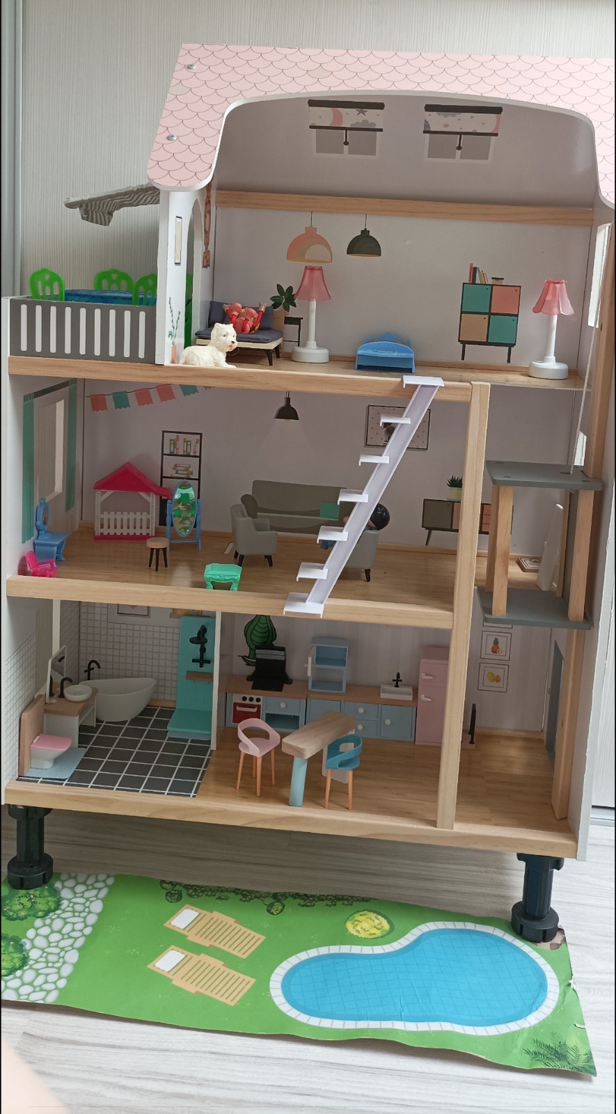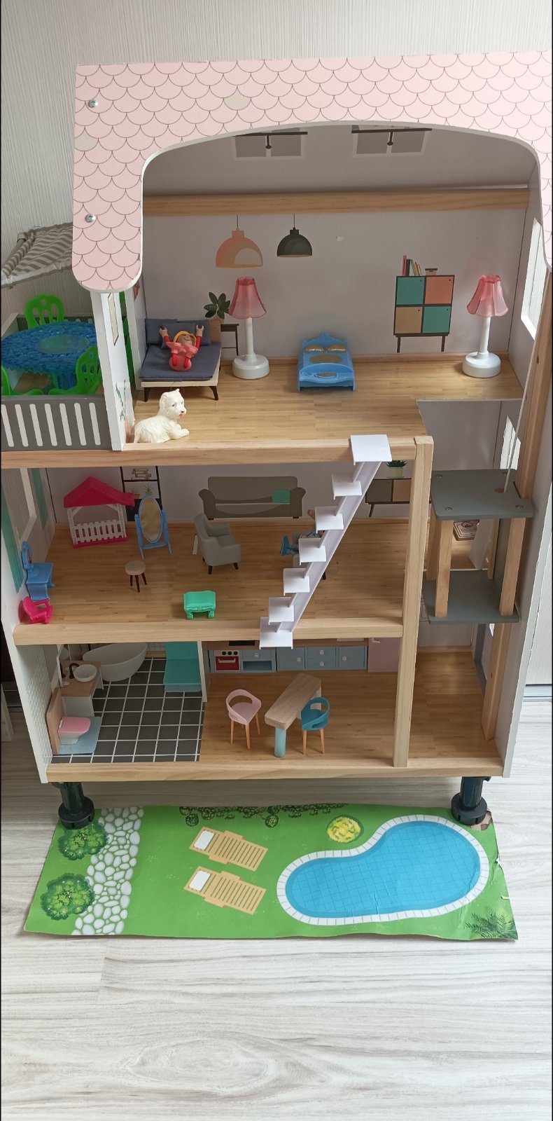 Krasnt drevený domček s bohatým príslušenstvom, drevený nábytok originál k domceku, plastový na terasu + postavicky dokúpene. Bez poškodení, nic nechýba, len bežné známky používania - oder na stre...