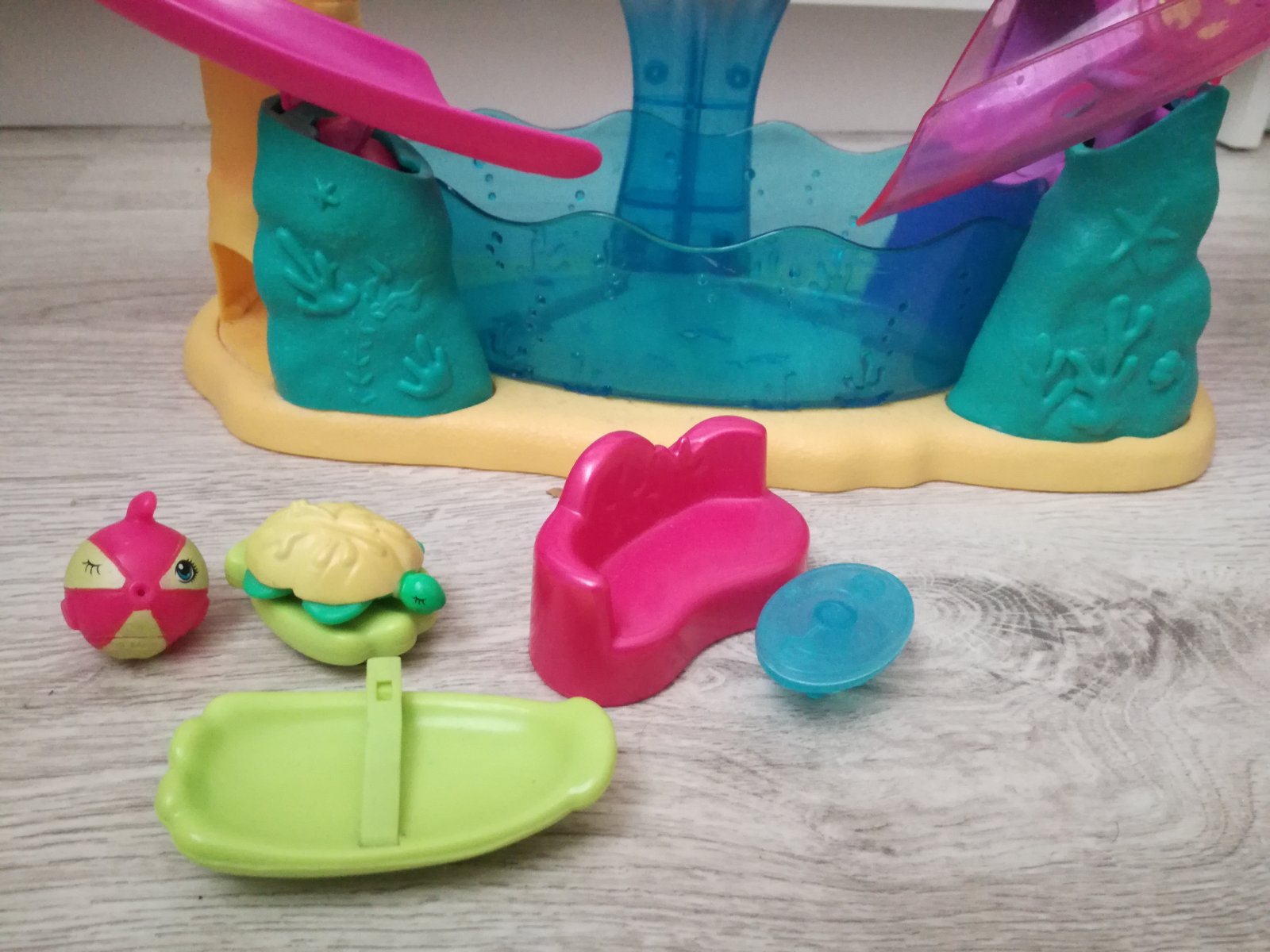 Svet morskej víly Polly Pocket, bez poškodení, no nejaké drobnosti chýbajú ako náhrdelník, hupacka, kabelka...niektoré časti menia farbu pri studenej a teplej vode.. posledná foto je ilustračná