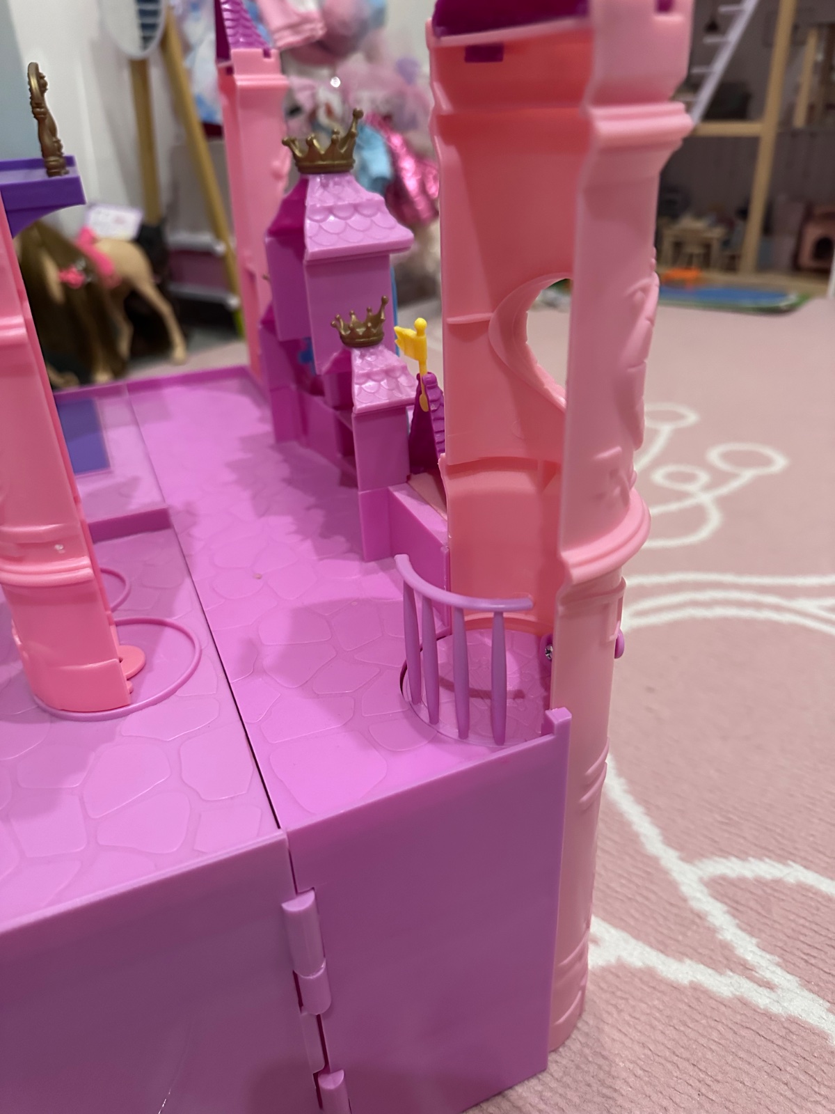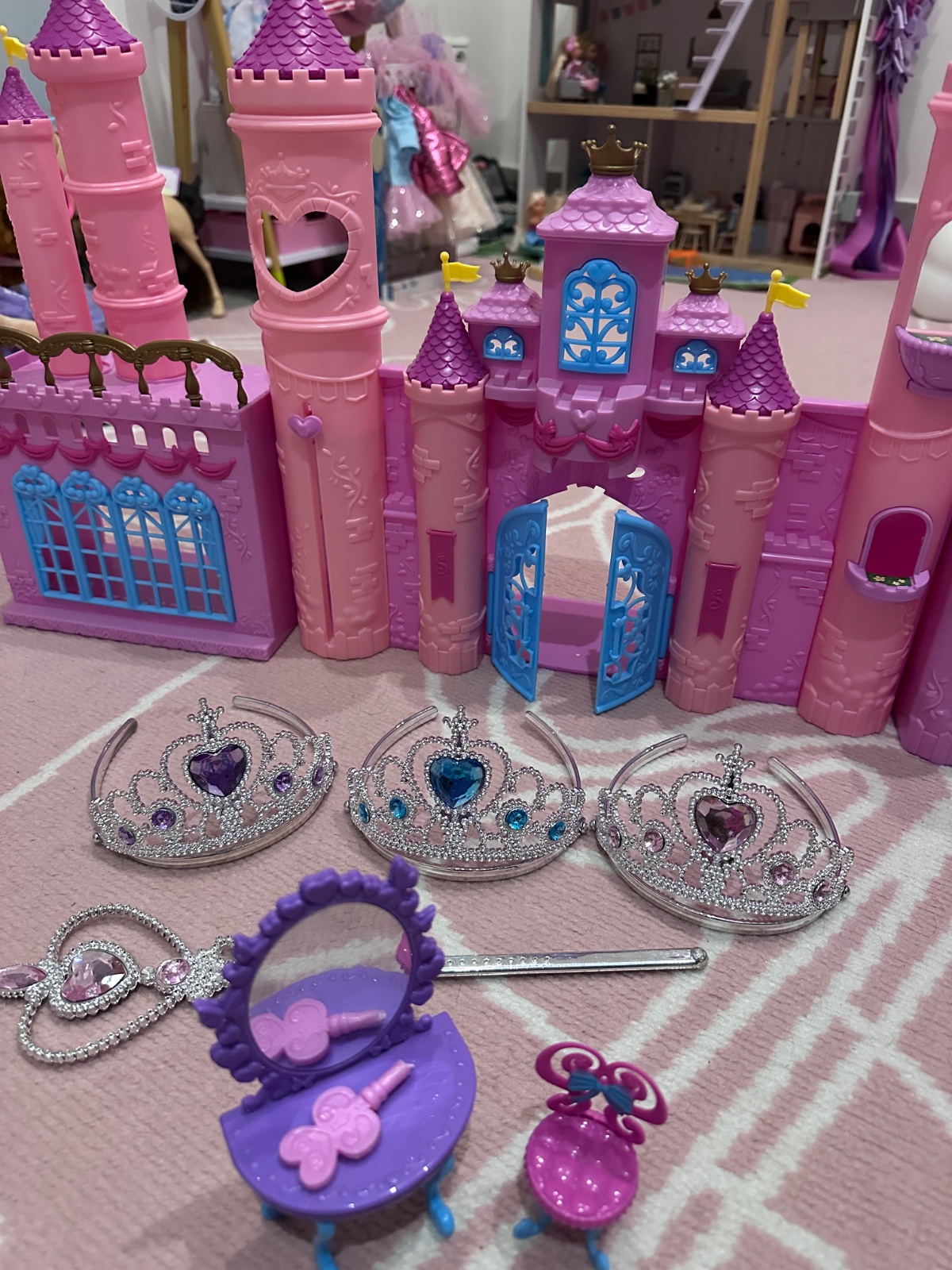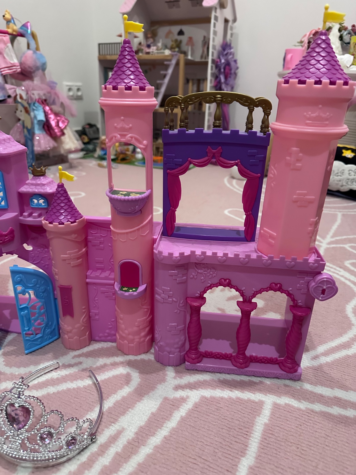Veľký hrad, s výťahom, rozkladací, na zámok, ale kľúčik je zlomený. Žiadne iné poškodenia hrad nemá, výťah je funkčný. Je k nemu stolík a stolička. Taktiež priložím korunky a paličku. Kúpna cena vysoká.