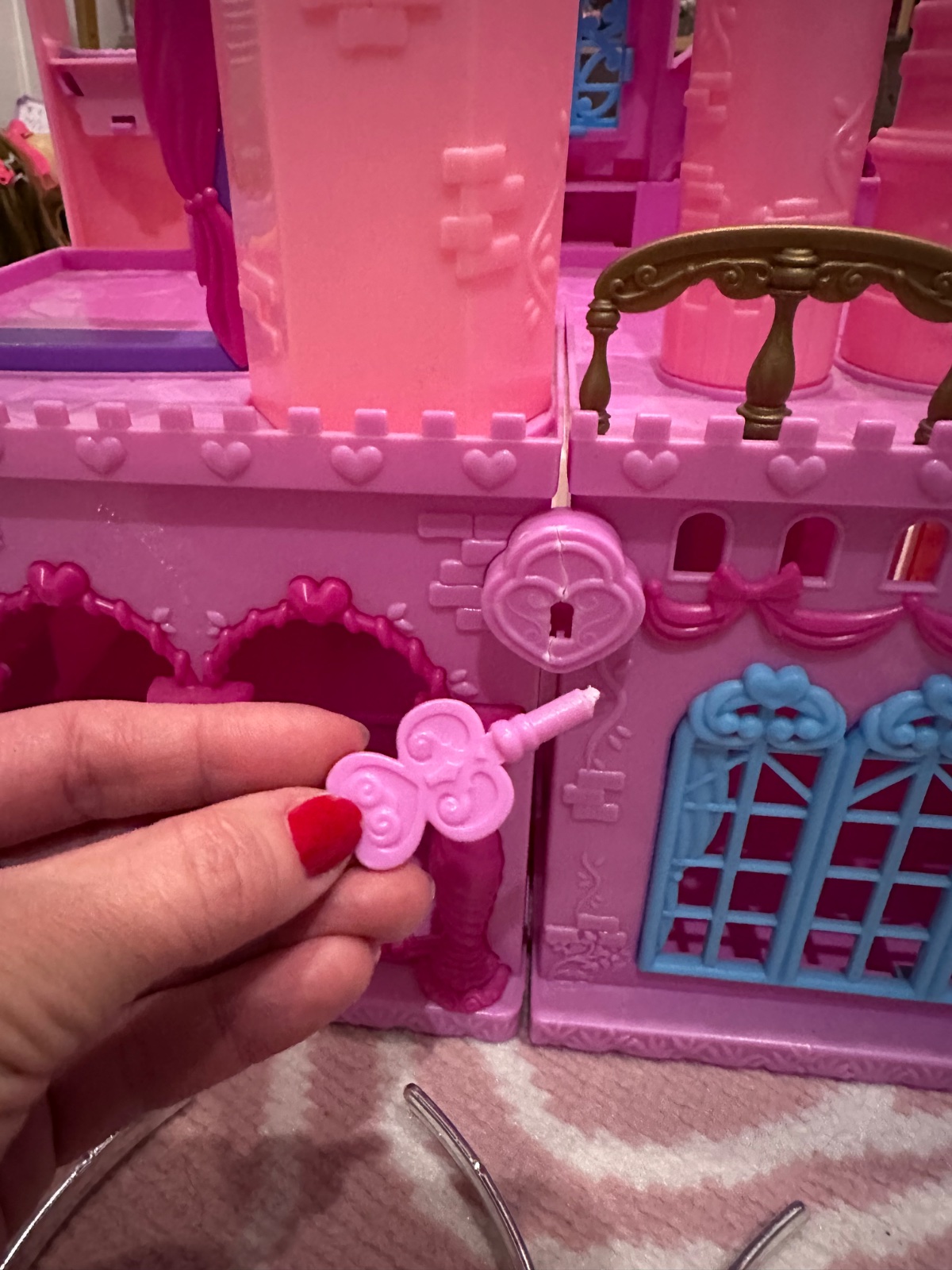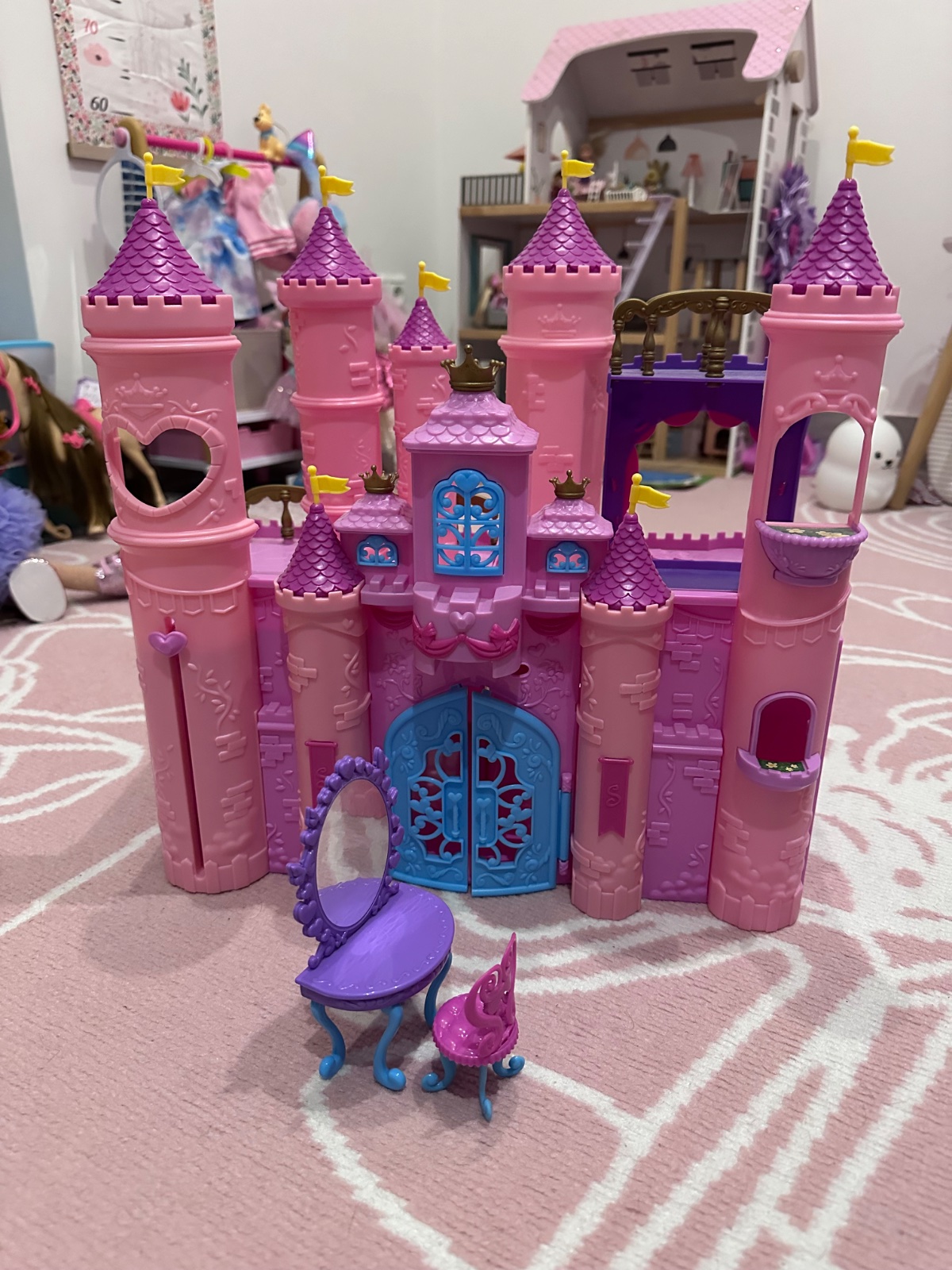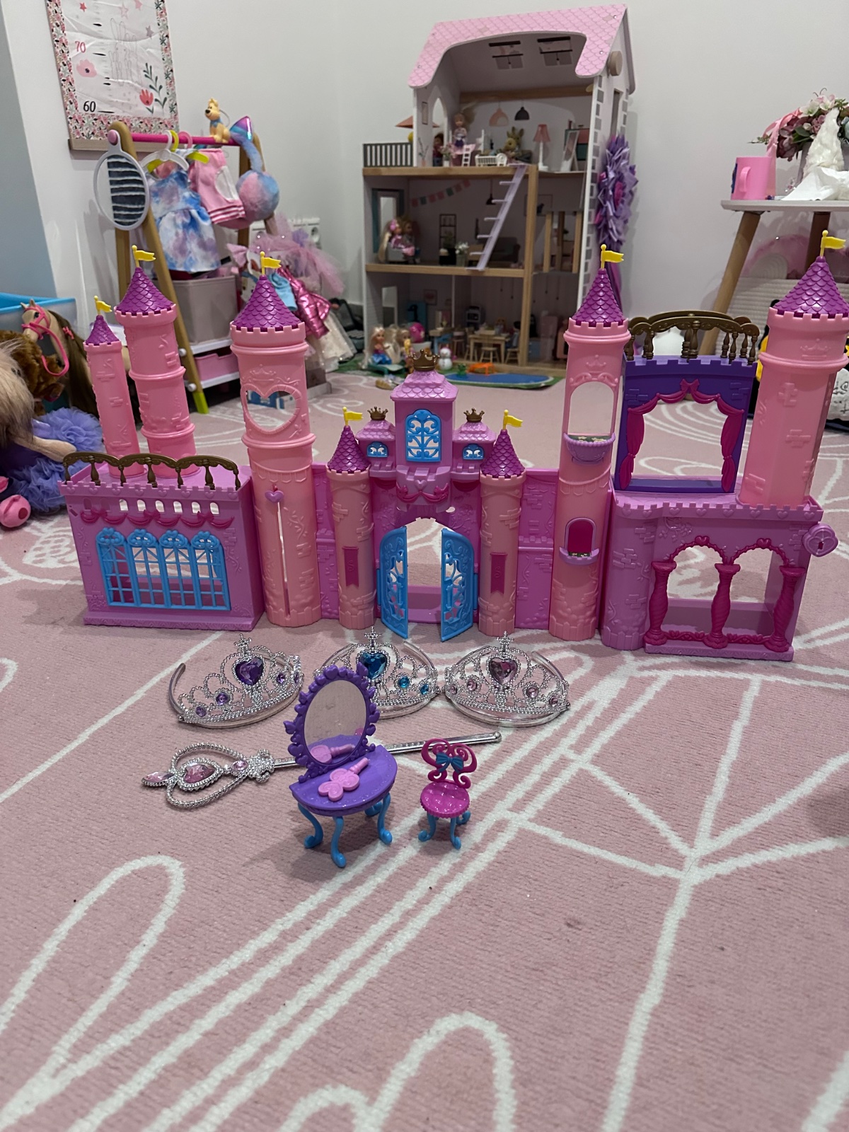 Veľký hrad, s výťahom, rozkladací, na zámok, ale kľúčik je zlomený. Žiadne iné poškodenia hrad nemá, výťah je funkčný. Je k nemu stolík a stolička. Taktiež priložím korunky a paličku. Kúpna cena vysoká.