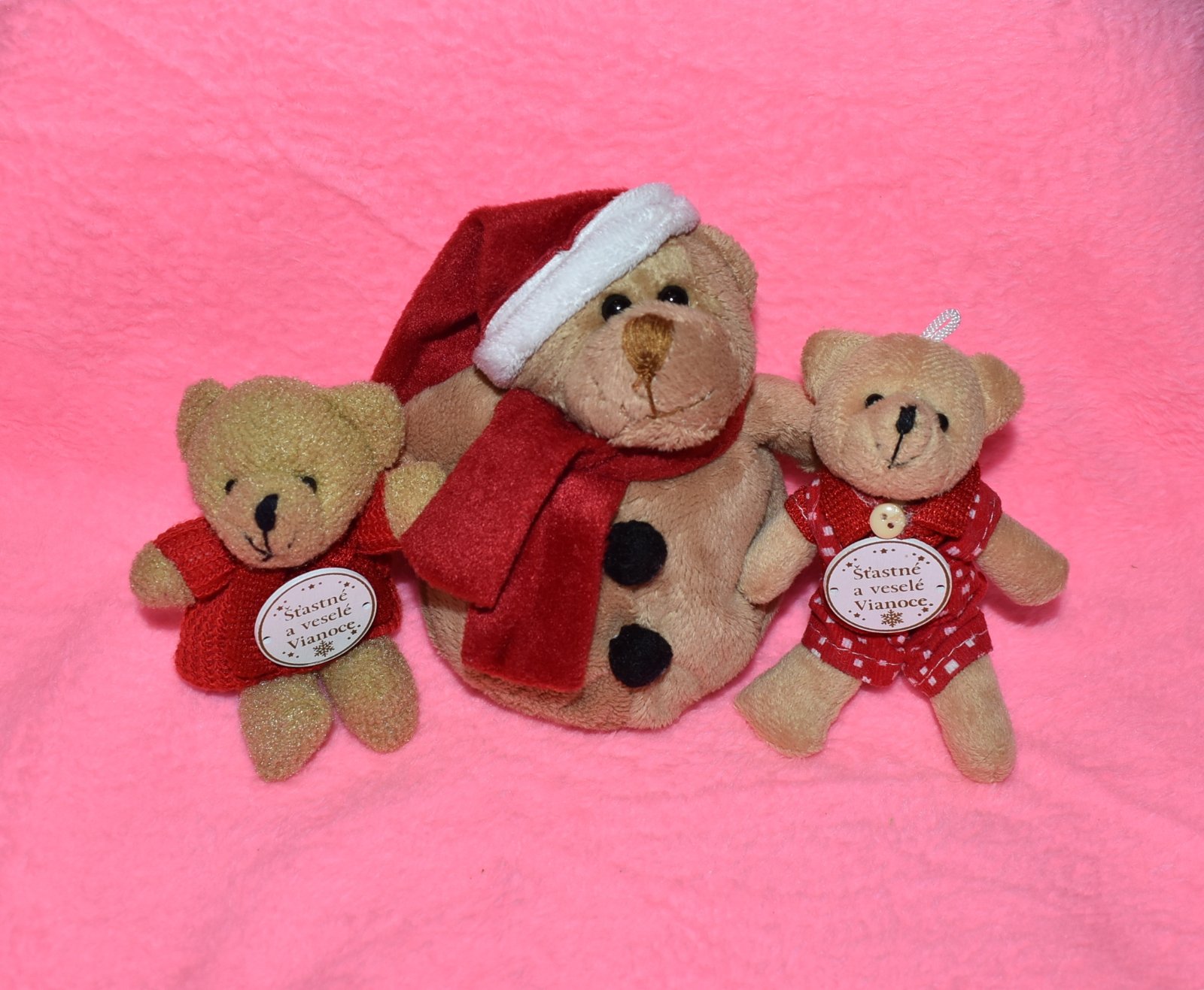 Macko mikuláš a mackovia s nápisom Šťastné a veselé Vianoce.