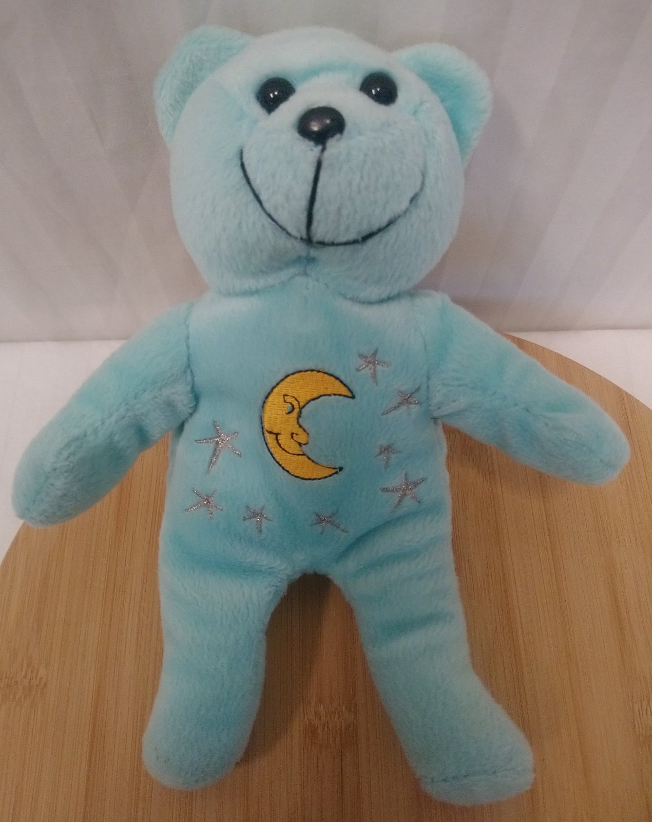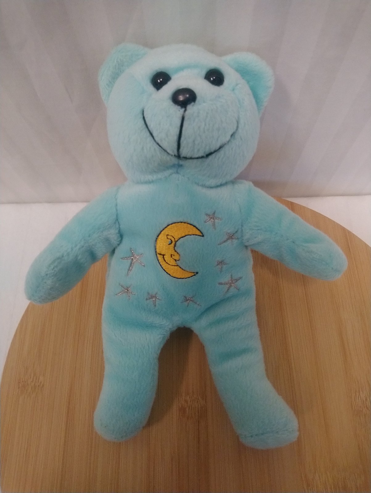 Plyšový modrý macko, mesiac s hviezdami, ktoré sú na brušku,