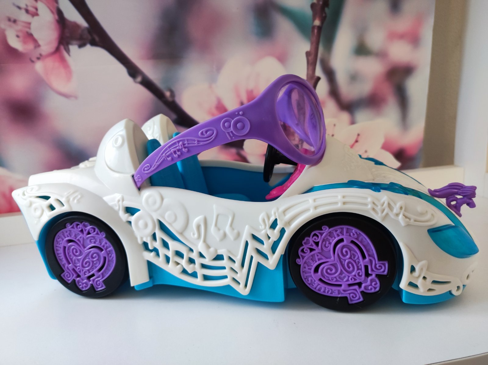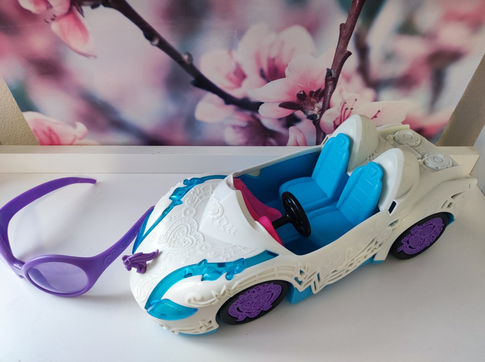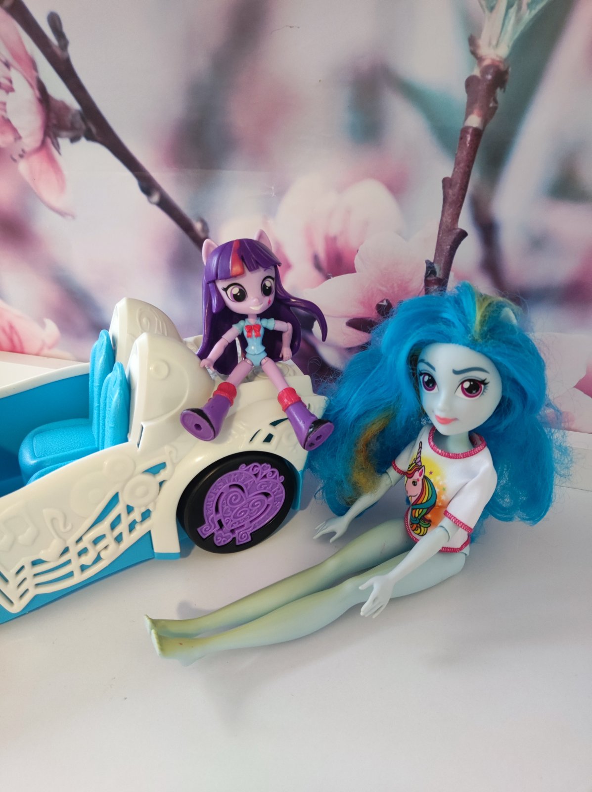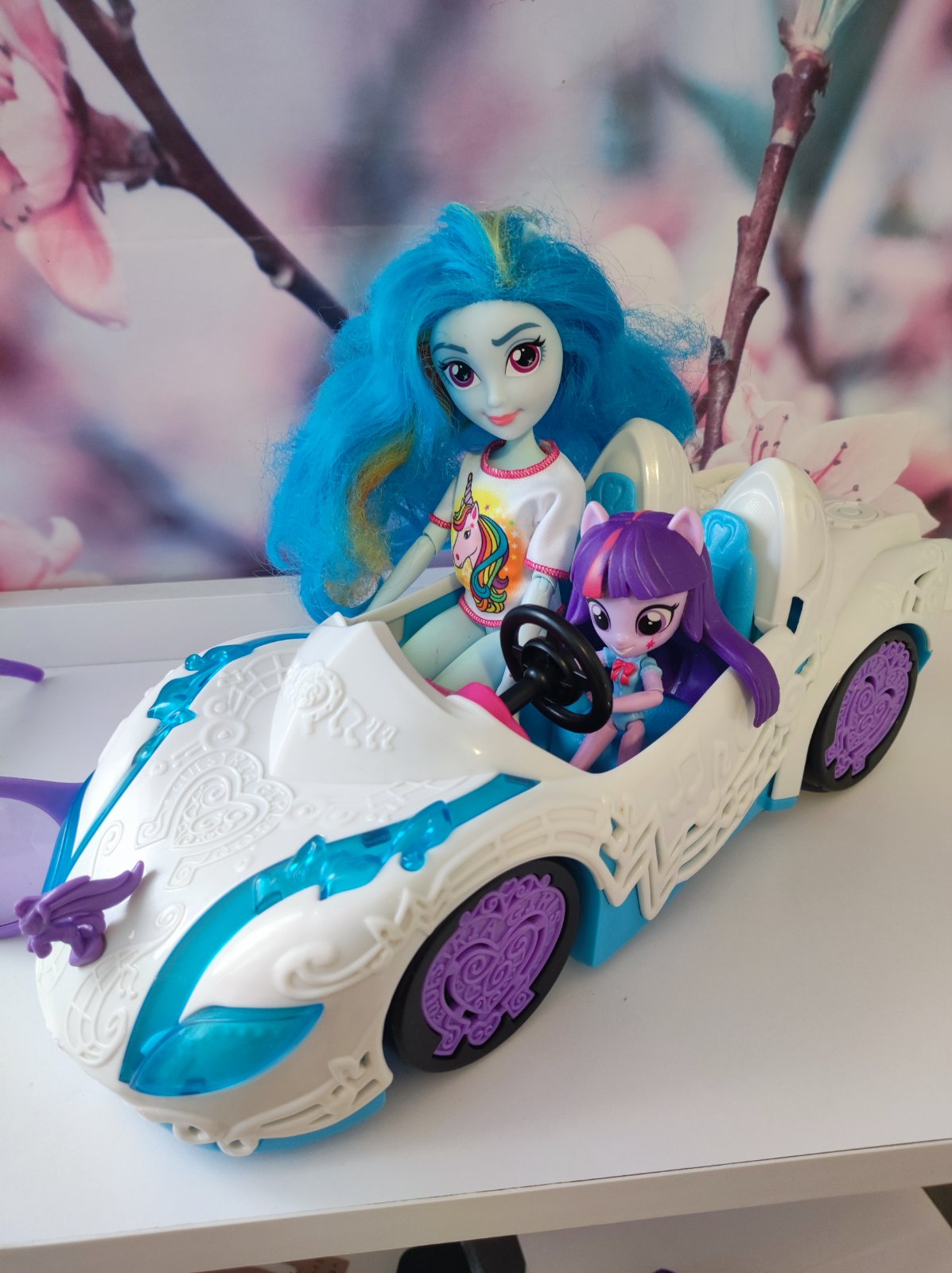 Equestria Girls auto vo výbornom stave. Iba okuliare majú znaky hrania. Vhodné asi skôr pre menšie bábiky ako Twilight na fotke ale zmestia sa aj väčšie Barbie verzie Equestria Girls.
