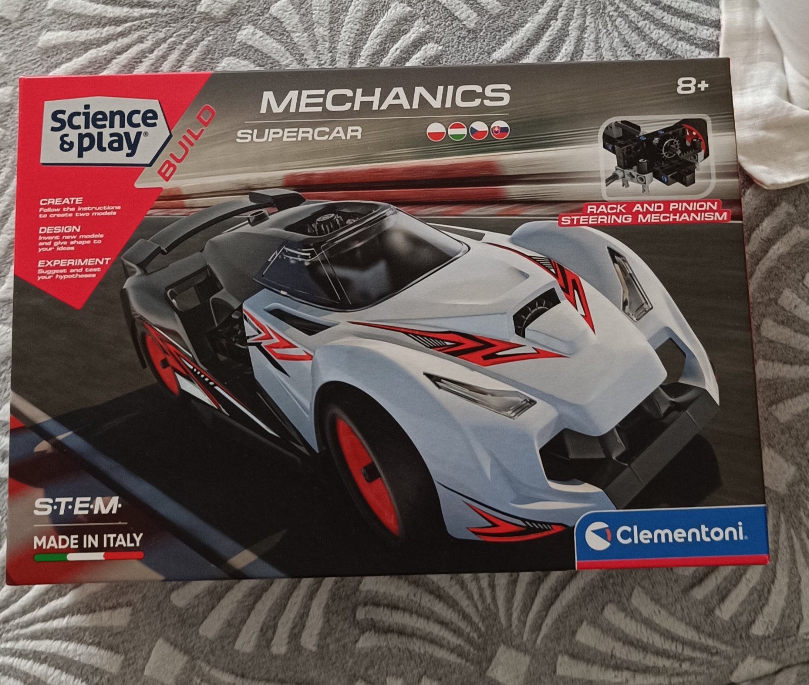 Pravouhlá prevodovka, ovládací mechanizmus riadenia, hrebeňový mechanizmus riadenia a samolepky k finálnemu dozdobeniu auta.