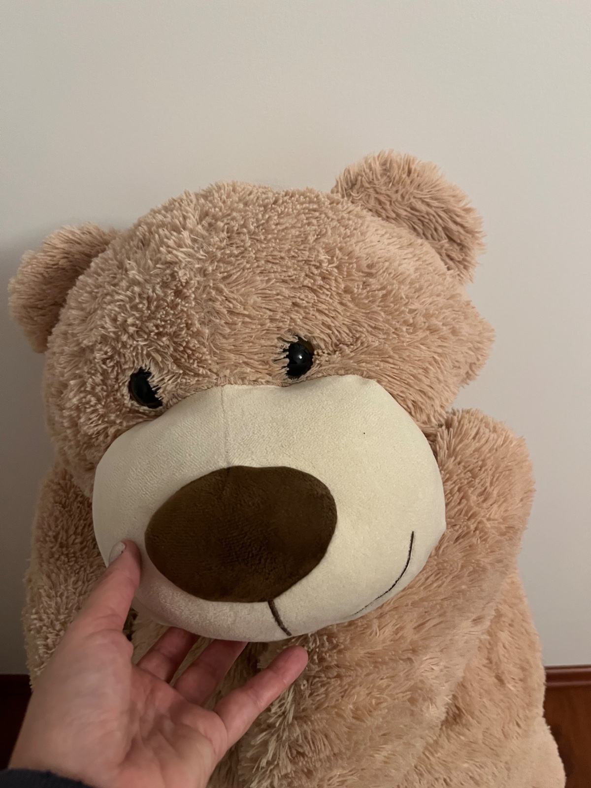 Medveď skôr ležal ako slúžil na hru,po jednom dieťati,pre veľkosť strážil posteľ na chalupe,je bez poškodenia a vád,jednoducho doslúžil.:-)