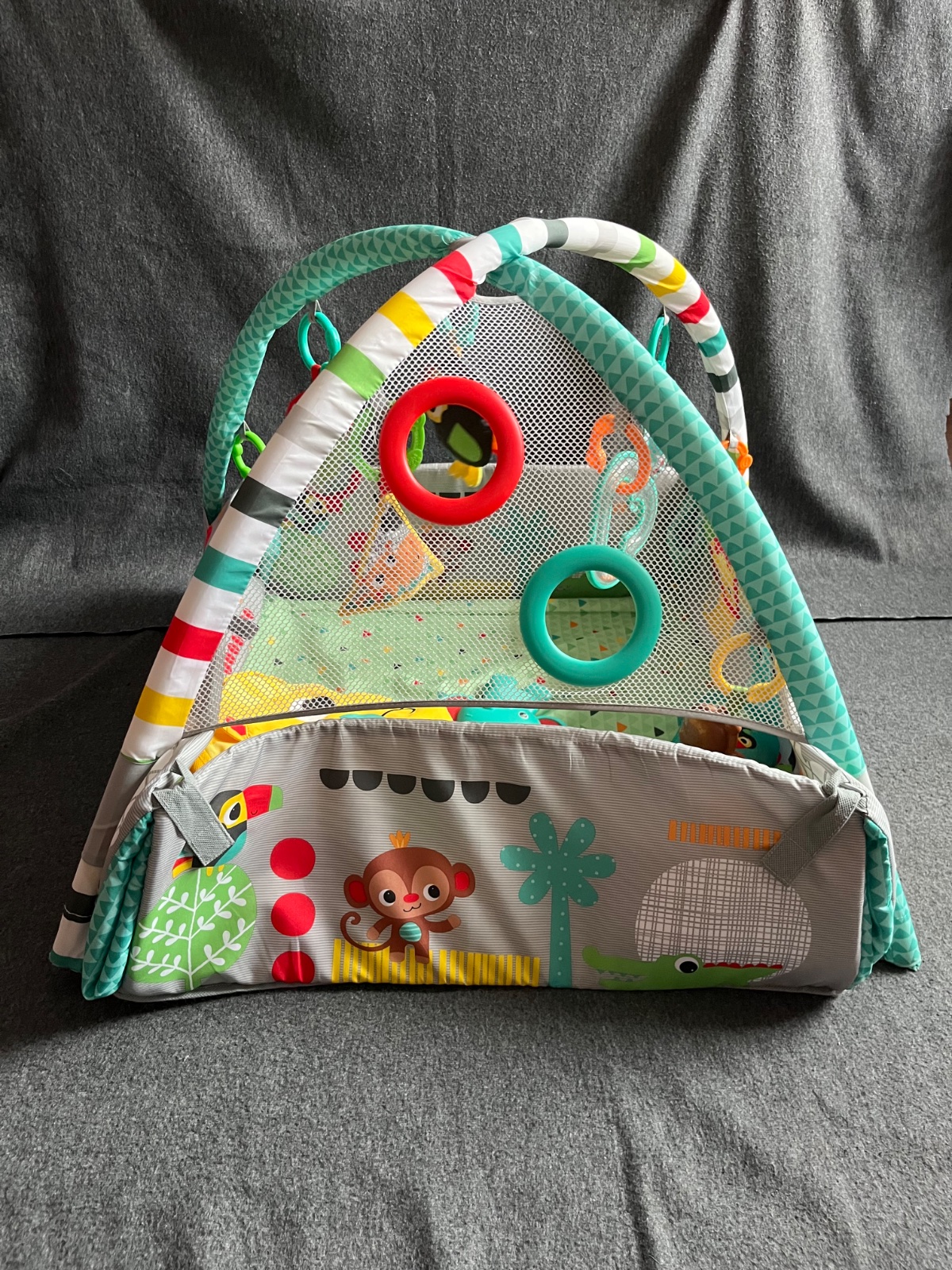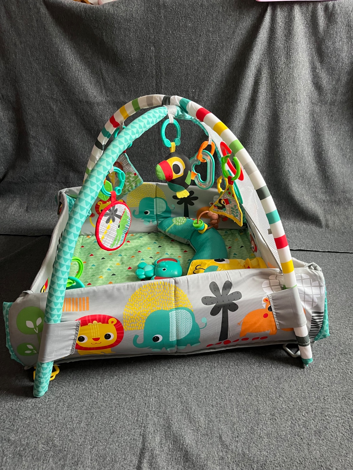 Deka je používaná jedným dieťaťom. Top stav. Bez poškodení, dier či fľakov. Sloník hrací plne funkčný. Jediné dve chybičky krásy sú trošku ošúchaná hračka opička (vid foto) a loptičky nie sú originál lebo mala ich vzala s tatinkom von a hádzala psíkovi tak som dala nové.