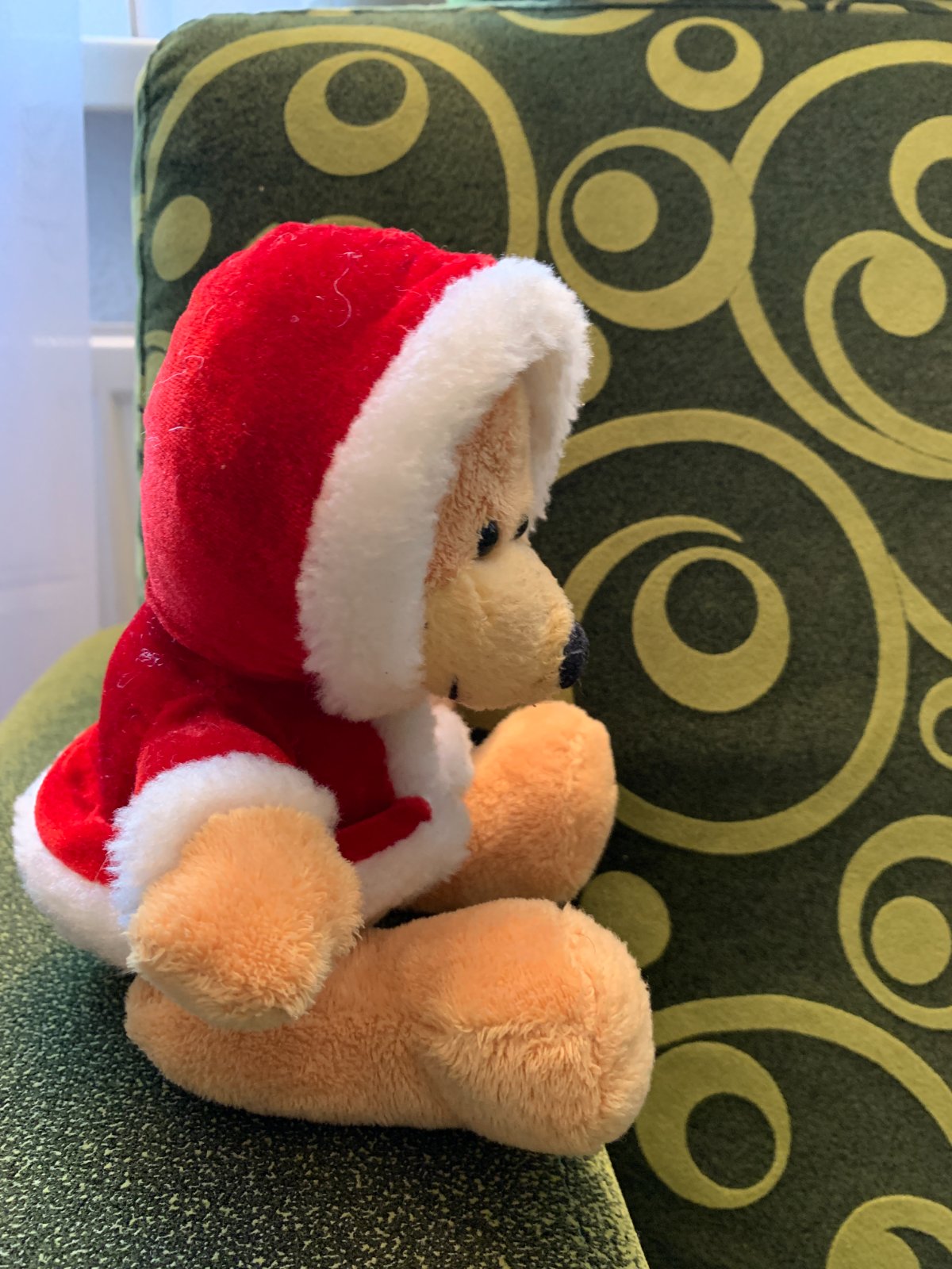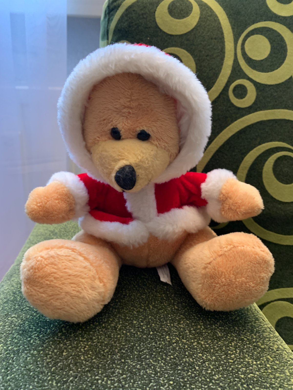 Plyšový macko v mikulášskkom kabátiku s kapucňou. Pekný stav bez poškodení.