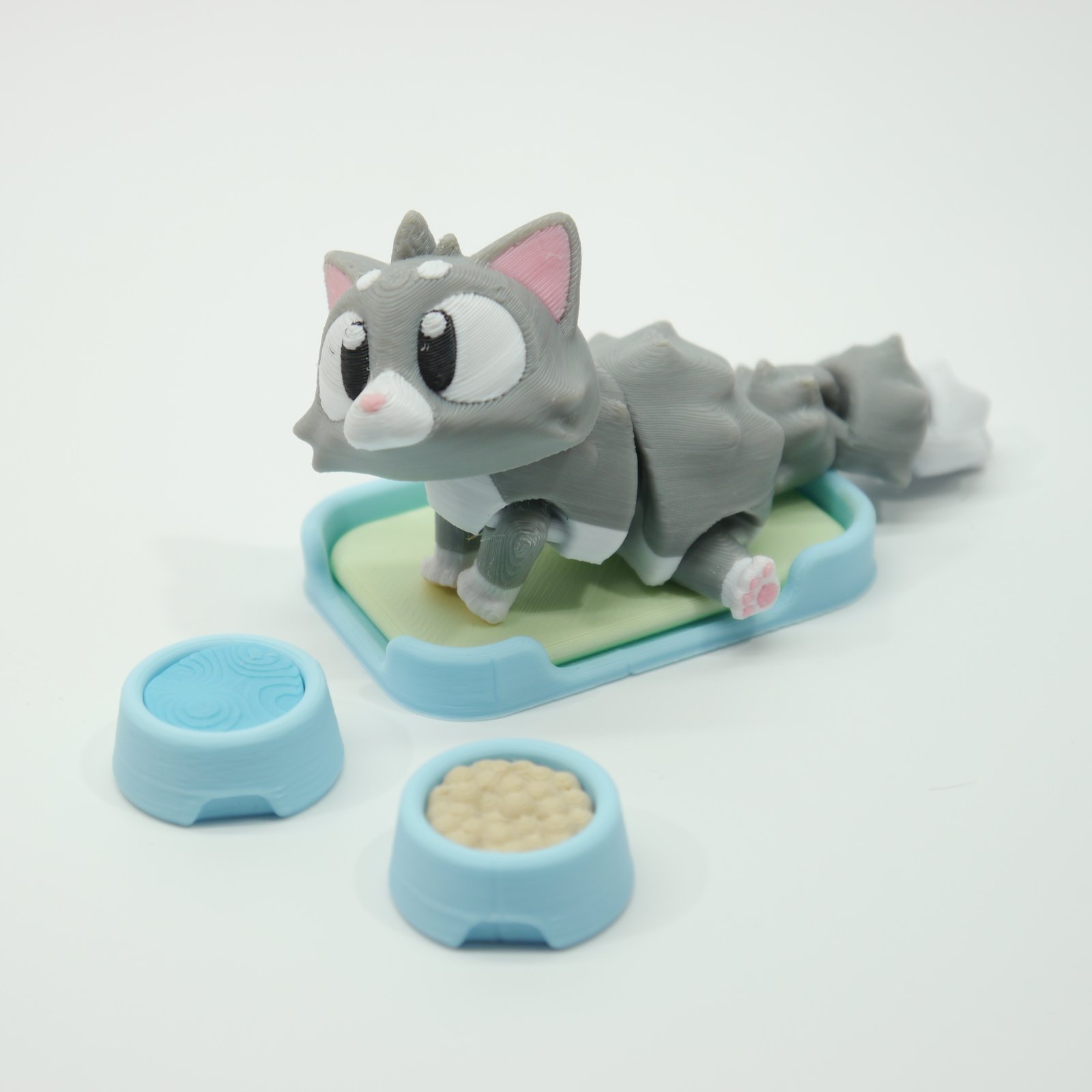 Rozmer Mačky je 9 cm, rozmer postieľky 6 cm a miska s jedlom a pitím je 2,5 cm.